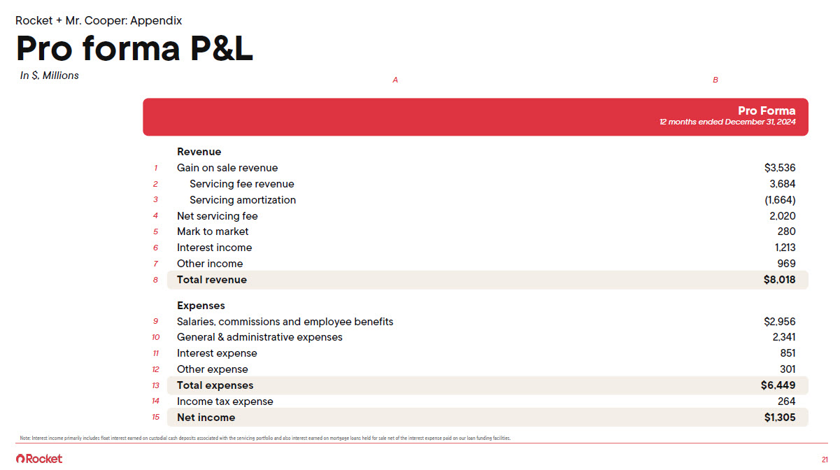 Pro forma P&L In $, Millions A B Revenue 1 Gain on sale revenue $3,536 2 Servicing fee revenue 3,684 3 Servicing amortization (1,664) 4 Net servicing fee 2,020 5 Mark to market 280 6 Interest income 1,213 7 Other income 969 8 Expenses 9 Salaries, commissions and employee benefits $2,956 10 General & administrative expenses 2,341 11 Interest expense 851 12 Other expense 301 13 14 Income tax expense 264 15 Note: Interest income primarily includes float interest earned on custodial cash deposits associated with the servicing portfolio and also interest earned on mortgage loans held for sale net of the interest expense paid on our loan funding facilities.