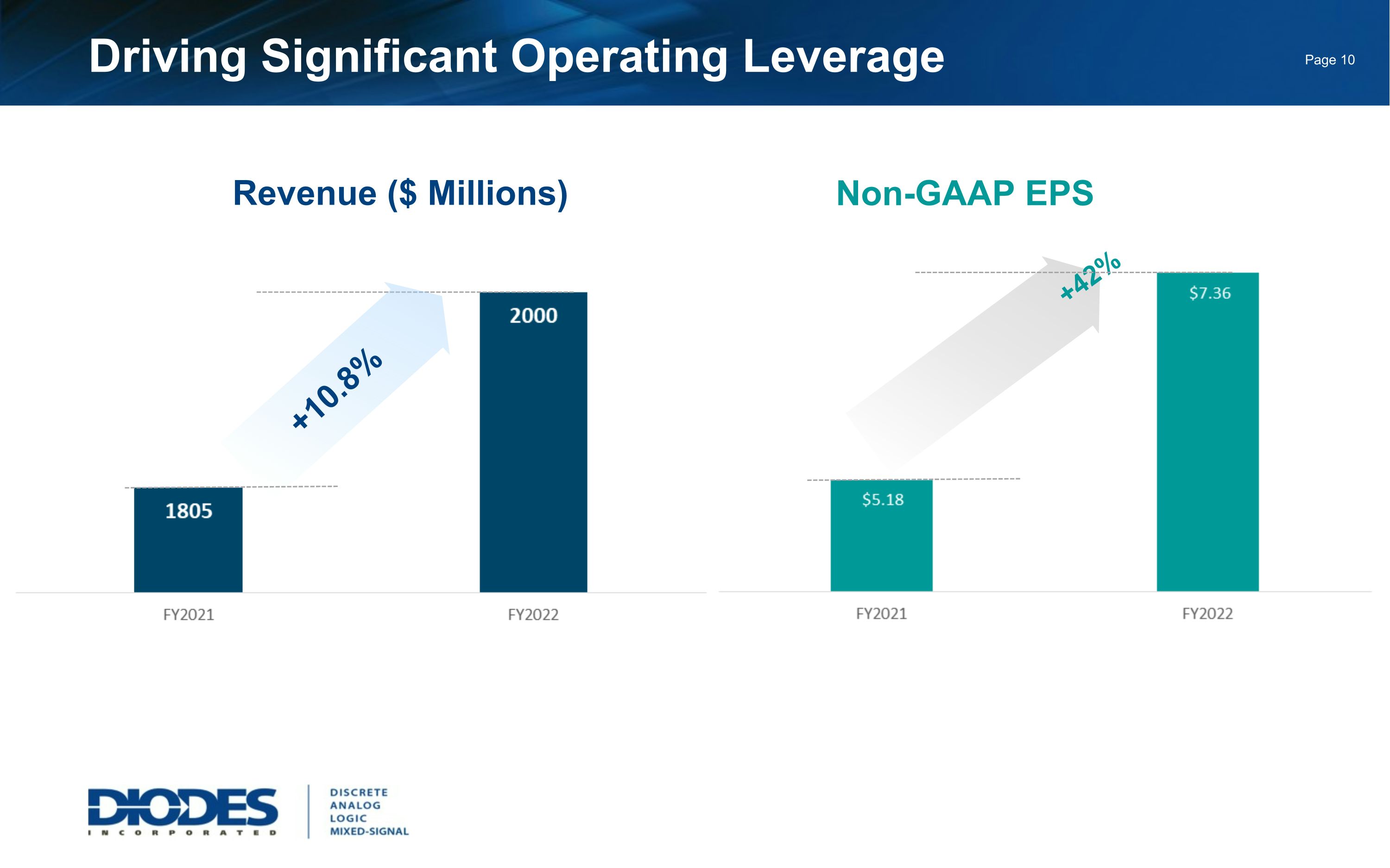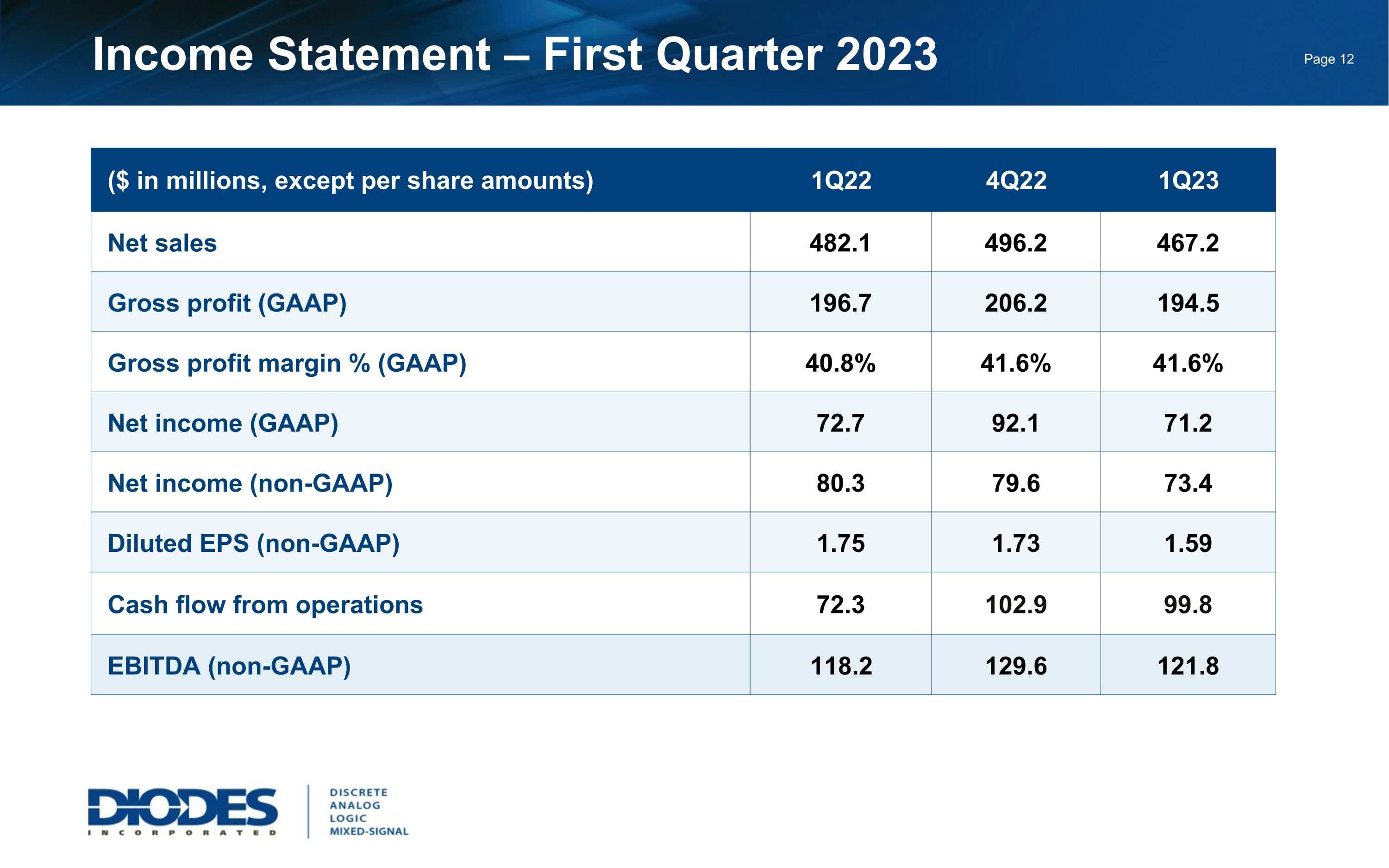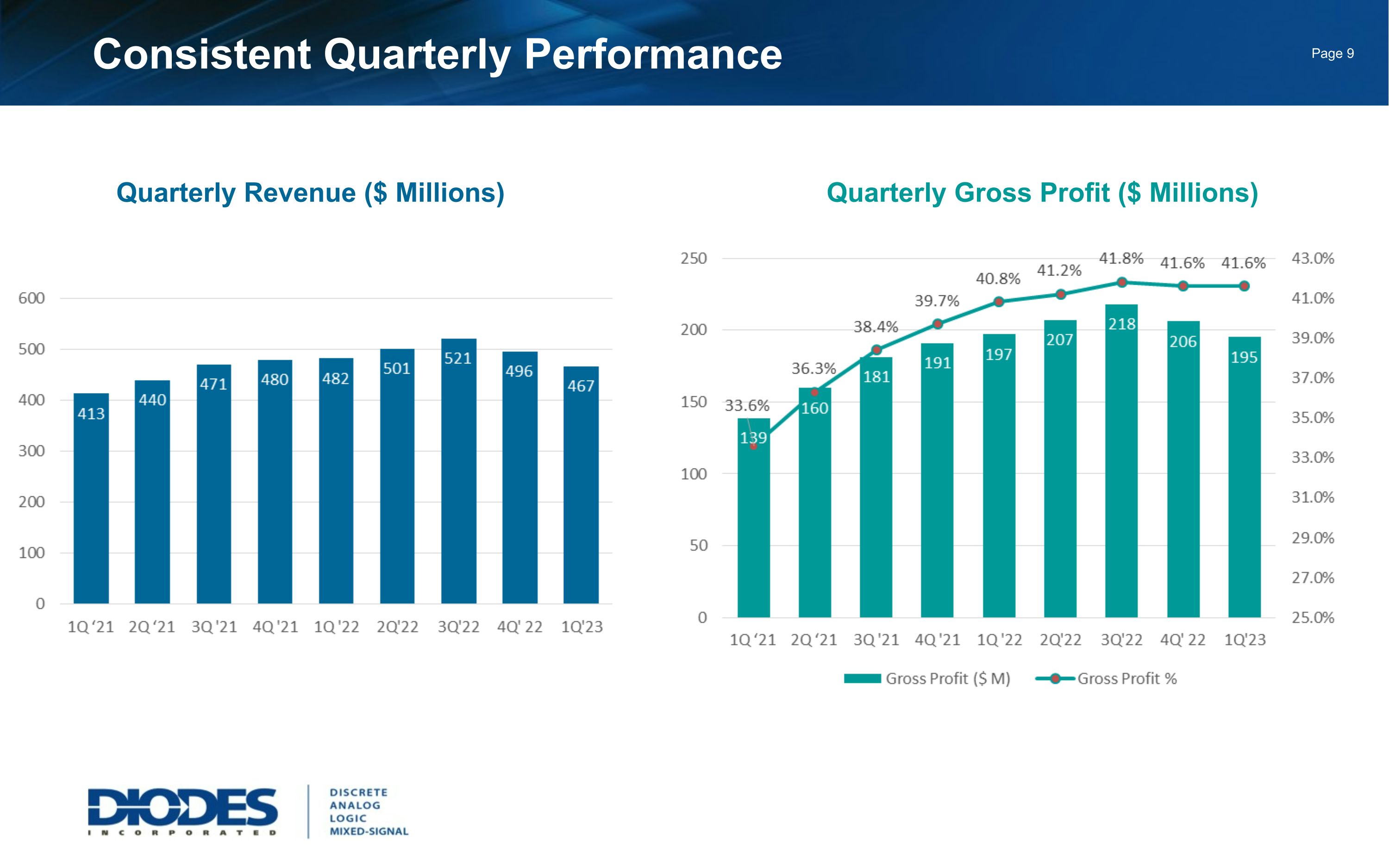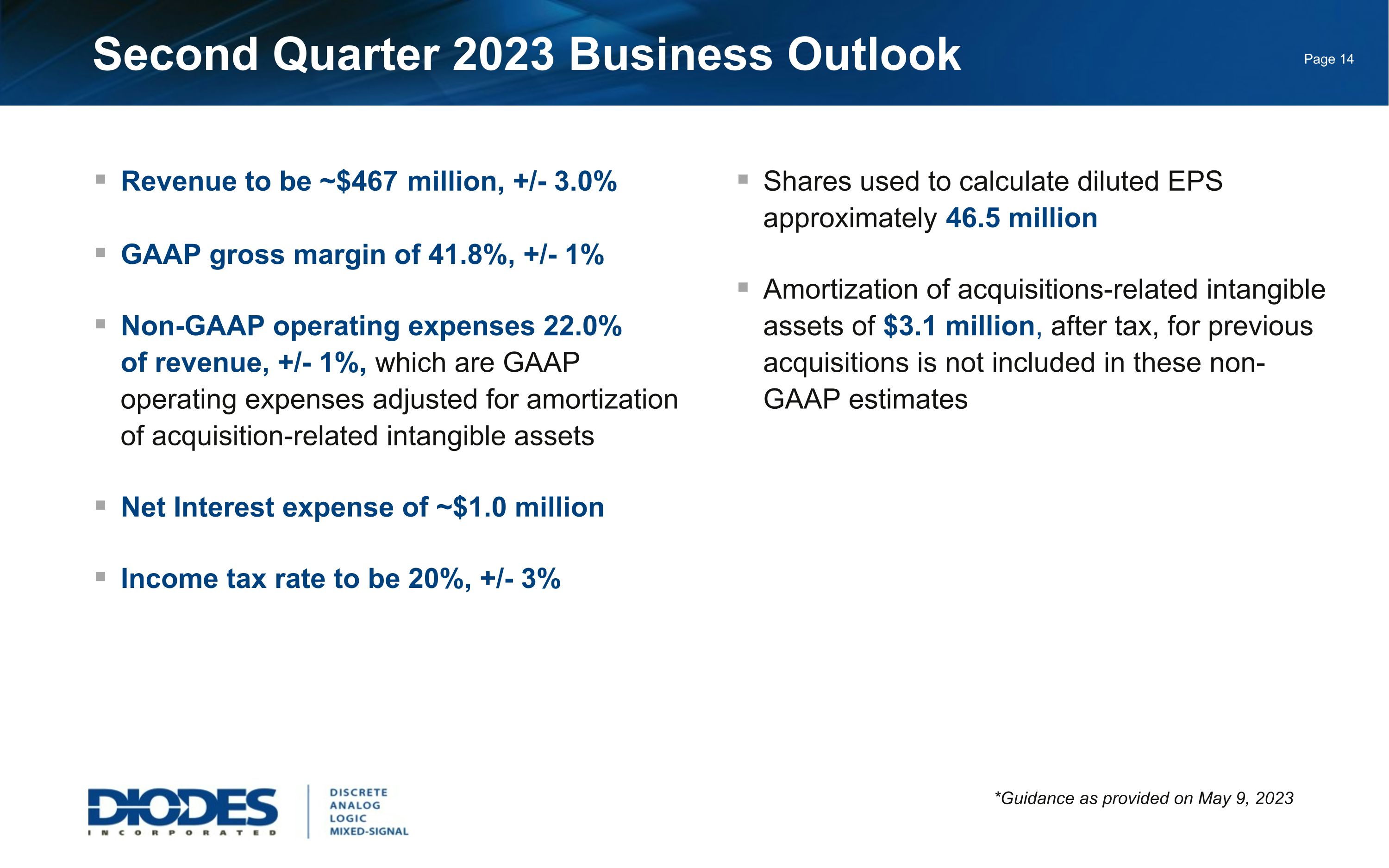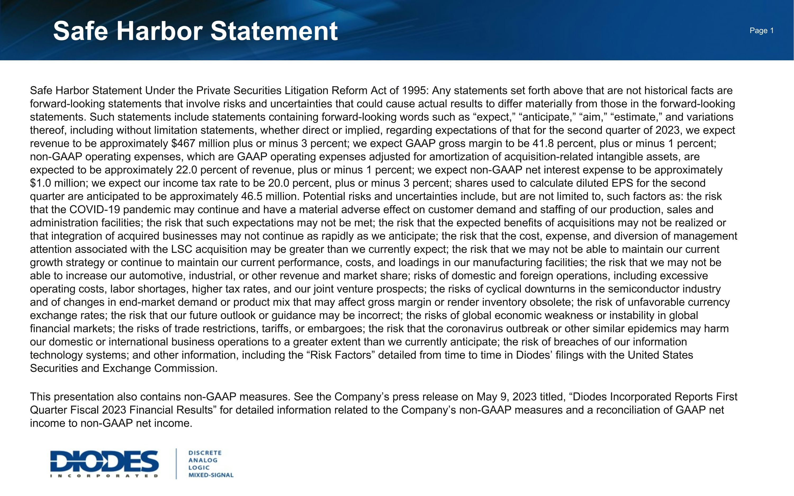 Safe Harbor Statement Safe Harbor Statement Under the Private Securities Litigation Reform Act of 1995: Any statements set forth above that are not historical facts are forward-looking statements that involve risks and uncertainties that could cause actual results to differ materially from those in the forward-looking statements. Such statements include statements containing forward-looking words such as “expect,” “anticipate,” “aim,” “estimate,” and variations thereof, including without limitation statements, whether direct or implied, regarding expectations of that for the second quarter of 2023, we expect revenue to be approximately $467 million plus or minus 3 percent; we expect GAAP gross margin to be 41.8 percent, plus or minus 1 percent; non-GAAP operating expenses, which are GAAP operating expenses adjusted for amortization of acquisition-related intangible assets, are expected to be approximately 22.0 percent of revenue, plus or minus 1 percent; we expect non-GAAP net interest expense to be approximately $1.0 million; we expect our income tax rate to be 20.0 percent, plus or minus 3 percent; shares used to calculate diluted EPS for the second quarter are anticipated to be approximately 46.5 million. Potential risks and uncertainties include, but are not limited to, such factors as: the risk that the COVID-19 pandemic may continue and have a material adverse effect on customer demand and staffing of our production, sales and administration facilities; the risk that such expectations may not be met; the risk that the expected benefits of acquisitions may not be realized or that integration of acquired businesses may not continue as rapidly as we anticipate; the risk that the cost, expense, and diversion of management attention associated with the LSC acquisition may be greater than we currently expect; the risk that we may not be able to maintain our current growth strategy or continue to maintain our current performance, costs, and loadings in our manufacturing facilities; the risk that we may not be able to increase our automotive, industrial, or other revenue and market share; risks of domestic and foreign operations, including excessive operating costs, labor shortages, higher tax rates, and our joint venture prospects; the risks of cyclical downturns in the semiconductor industry and of changes in end-market demand or product mix that may affect gross margin or render inventory obsolete; the risk of unfavorable currency exchange rates; the risk that our future outlook or guidance may be incorrect; the risks of global economic weakness or instability in global financial markets; the risks of trade restrictions, tariffs, or embargoes; the risk that the coronavirus outbreak or other similar epidemics may harm our domestic or international business operations to a greater extent than we currently anticipate; the risk of breaches of our information technology systems; and other information, including the “Risk Factors” detailed from time to time in Diodes’ filings with the United States Securities and Exchange Commission. This presentation also contains non-GAAP measures. See the Company’s press release on May 9, 2023 titled, “Diodes Incorporated Reports First Quarter Fiscal 2023 Financial Results” for detailed information related to the Company’s non-GAAP measures and a reconciliation of GAAP net income to non-GAAP net income.