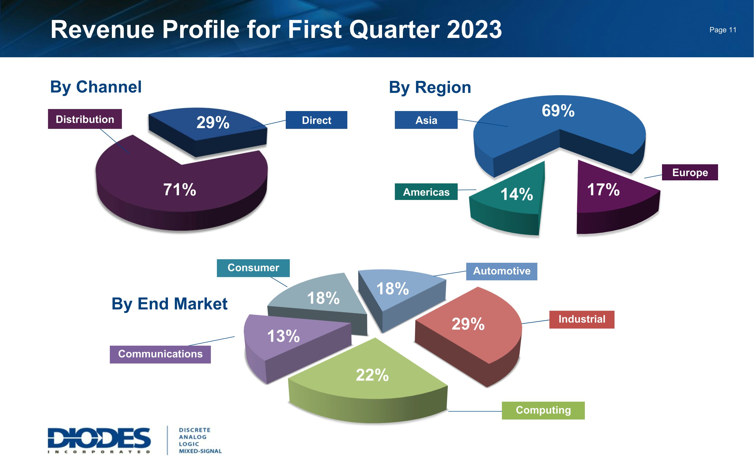 Revenue Profile for First Quarter 2023 By End Market Computing Consumer Industrial Communications Automotive By Channel Distribution Direct By Region Asia Europe Americas 18% 13% 22% 29% 18% 71% 29% 69% 17% 14%