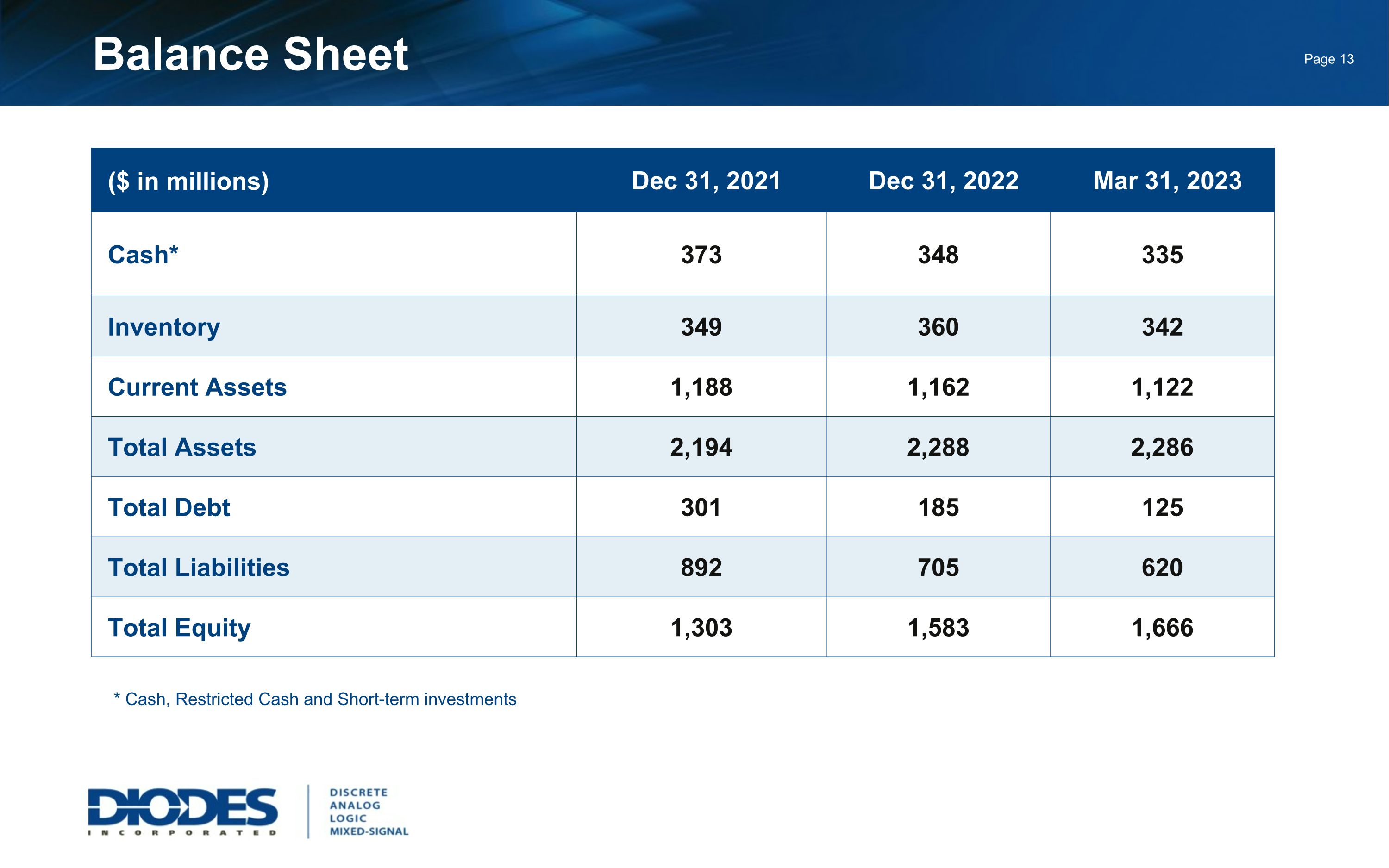 Balance Sheet ($ in millions) Dec 31, 2021 Dec 31, 2022 Mar 31, 2023 Cash* 373 348 335 Inventory 349 360 342 Current Assets 1,188 1,162 1,122 Total Assets 2,194 2,288 2,286 Total Debt 301 185 125 Total Liabilities 892 705 620 Total Equity 1,303 1,583 1,666 * Cash, Restricted Cash and Short-term investments