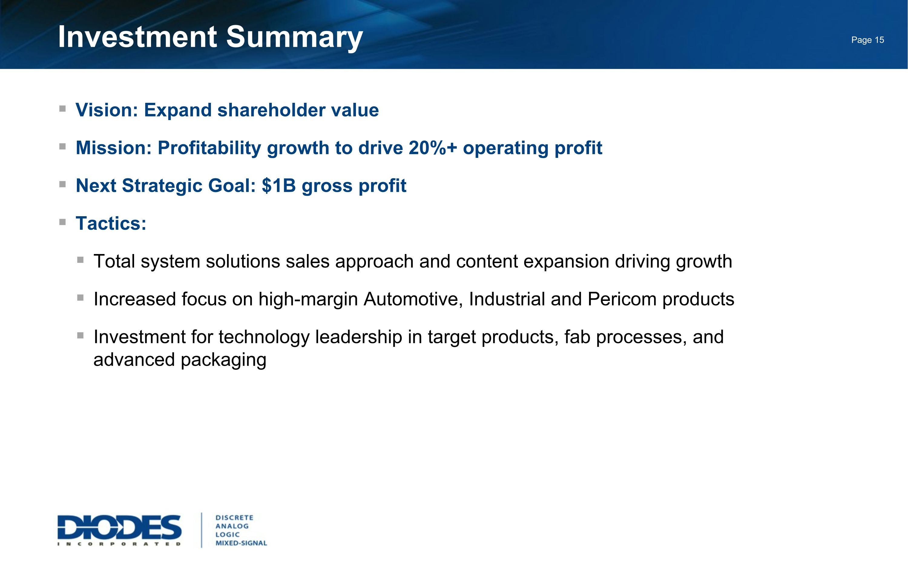 Summary Vision: Expand shareholder value Mission: Profitability growth to drive 20%+ operating profit Next Strategic Goal: $1B gross profit Tactics: Increased focus on high-margin automotive, industrial, and Pericom products Investment for technology leadership in target products, fab processes, and advanced packaging System solutions to drive business expansion