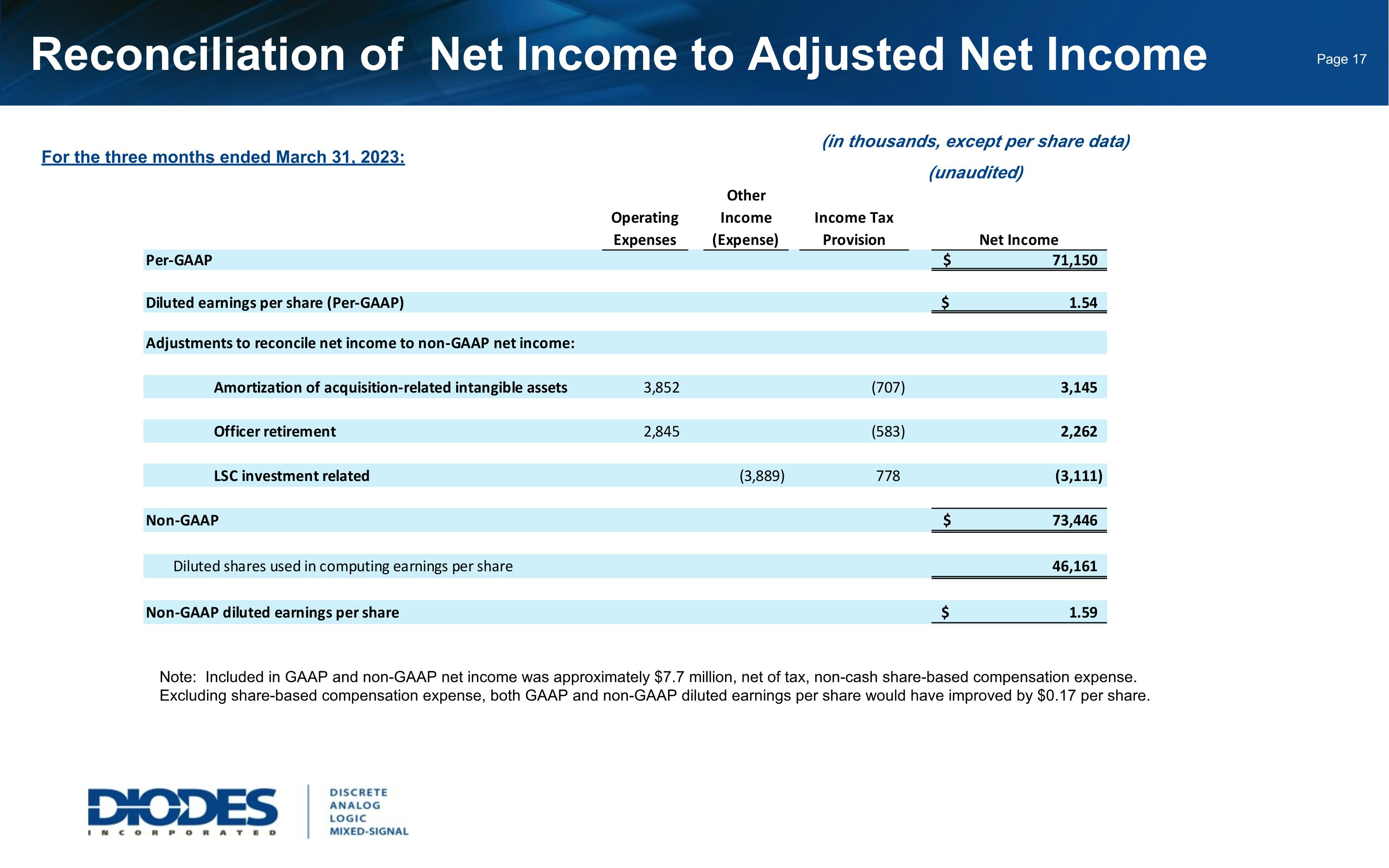 Reconciliation of Net Income to Adjusted Net Income For the three months ended March 31, 2023: (in thousands, except per share data) (unaudited) Note: Included in GAAP and non-GAAP net income was approximately $7.7 million, net of tax, non-cash share-based compensation expense. Excluding share-based compensation expense, both GAAP and non-GAAP diluted earnings per share would have improved by $0.17 per share.
