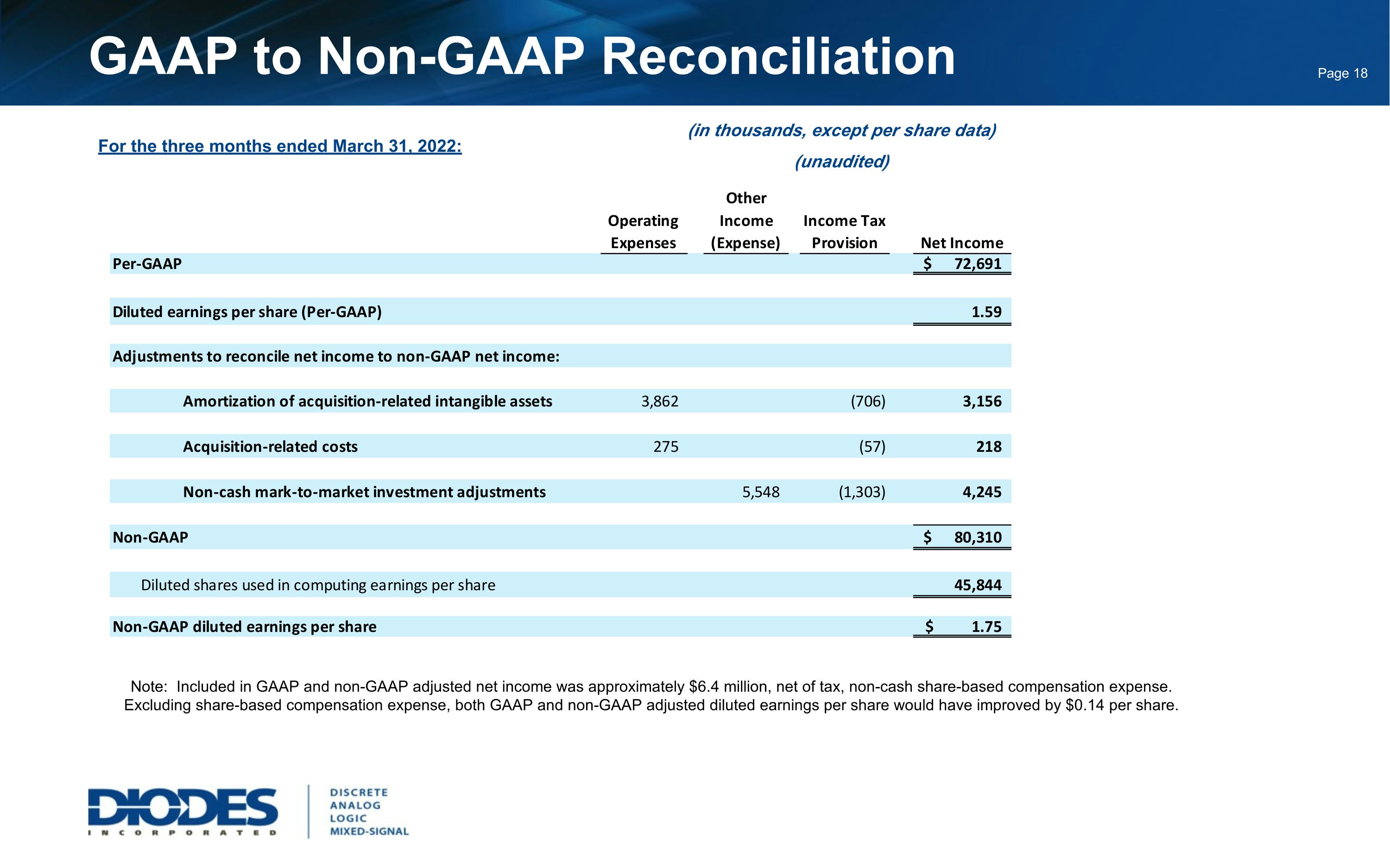 GAAP to Non-GAAP Reconciliation For the three months ended March 31, 2022: (in thousands, except per share data) (unaudited) Note: Included in GAAP and non-GAAP adjusted net income was approximately $6.4 million, net of tax, non-cash share-based compensation expense. Excluding share-based compensation expense, both GAAP and non-GAAP adjusted diluted earnings per share would have improved by $0.14 per share.