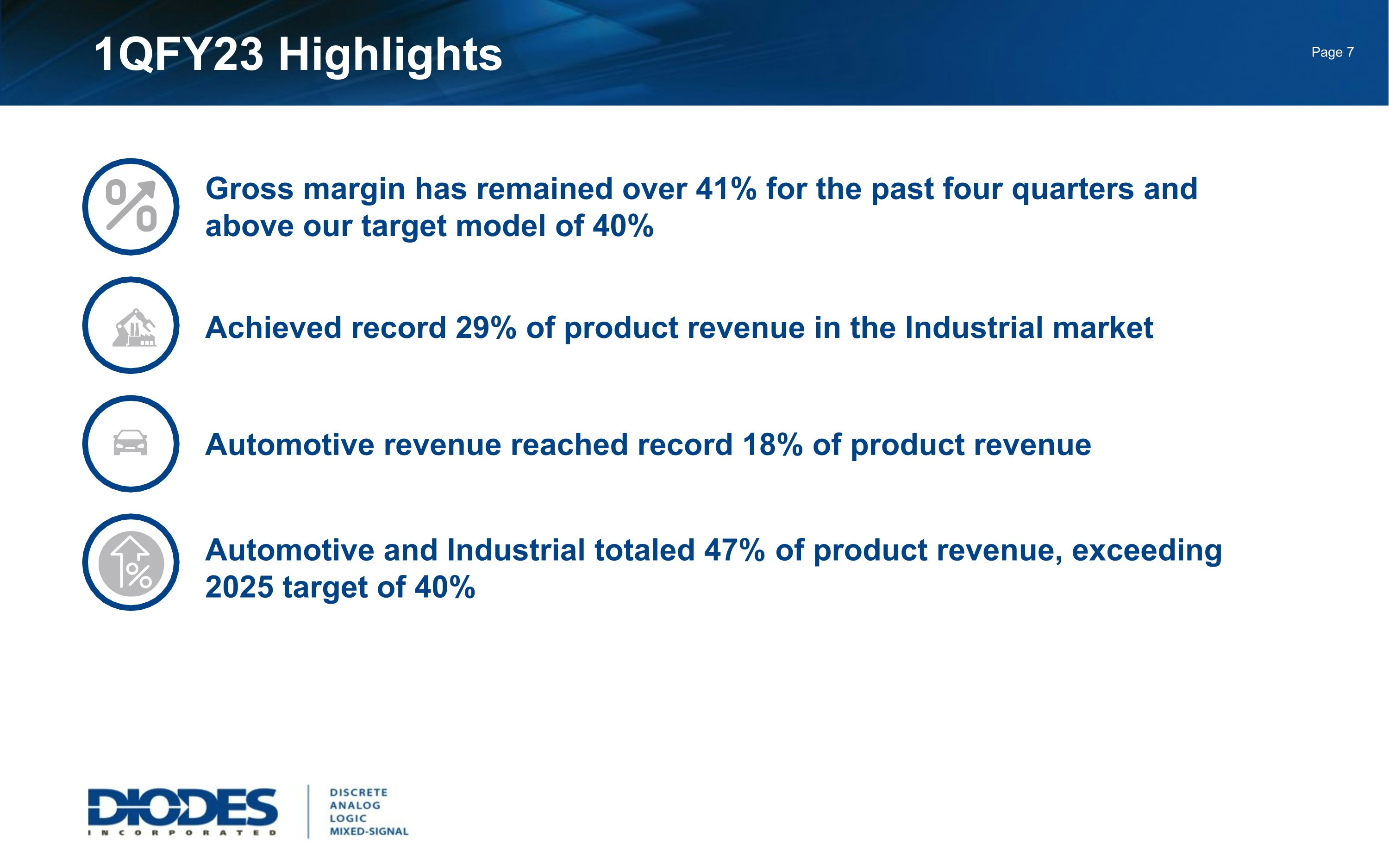 1QFY23 Highlights Gross margin has remained over 41% for the past four quarters and above our target model of 40% Achieved record 29% of product revenue in the Industrial market Automotive and Industrial totaled 47% of product revenue, exceeding 2025 target of 40% Automotive revenue reached record 18% of product revenue