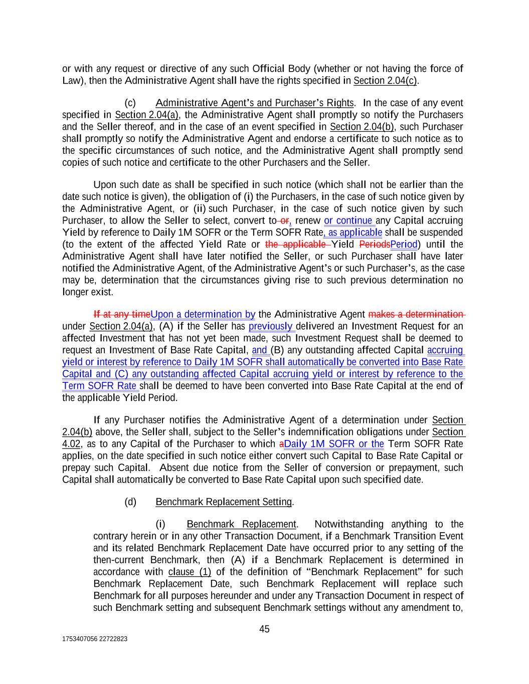 or with any request or directive of any such Official Body (whether or not having the force of Law), then the Administrative Agent shall have the rights specified in Section 2.04(c). (c) Administrative Agent’s and Purchaser’s Rights. In the case of any event specified in Section 2.04(a), the Administrative Agent shall promptly so notify the Purchasers and the Seller thereof, and in the case of an event specified in Section 2.04(b), such Purchaser shall promptly so notify the Administrative Agent and endorse a certificate to such notice as to the specific circumstances of such notice, and the Administrative Agent shall promptly send copies of such notice and certificate to the other Purchasers and the Seller. Upon such date as shall be specified in such notice (which shall not be earlier than the date such notice is given), the obligation of (i) the Purchasers, in the case of such notice given by the Administrative Agent, or (ii) such Purchaser, in the case of such notice given by such Purchaser, to allow the Seller to select, convert to or, renew or continue any Capital accruing Yield by reference to Daily 1M SOFR or the Term SOFR Rate, as applicable shall be suspended (to the extent of the affected Yield Rate or the applicable Yield PeriodsPeriod) until the Administrative Agent shall have later notified the Seller, or such Purchaser shall have later notified the Administrative Agent, of the Administrative Agent’s or such Purchaser’s, as the case may be, determination that the circumstances giving rise to such previous determination no longer exist. If at any timeUpon a determination by the Administrative Agent makes a determination under Section 2.04(a), (A) if the Seller has previously delivered an Investment Request for an affected Investment that has not yet been made, such Investment Request shall be deemed to request an Investment of Base Rate Capital, and (B) any outstanding affected Capital accruing yield or interest by reference to Daily 1M SOFR shall automatically be converted into Base Rate Capital and (C) any outstanding affected Capital accruing yield or interest by reference to the Term SOFR Rate shall be deemed to have been converted into Base Rate Capital at the end of the applicable Yield Period. If any Purchaser notifies the Administrative Agent of a determination under Section 2.04(b) above, the Seller shall, subject to the Seller’s indemnification obligations under Section 4.02, as to any Capital of the Purchaser to which aDaily 1M SOFR or the Term SOFR Rate applies, on the date specified in such notice either convert such Capital to Base Rate Capital or prepay such Capital. Absent due notice from the Seller of conversion or prepayment, such Capital shall automatically be converted to Base Rate Capital upon such specified date. (d) Benchmark Replacement Setting. (i) Benchmark Replacement. Notwithstanding anything to the contrary herein or in any other Transaction Document, if a Benchmark Transition Event and its related Benchmark Replacement Date have occurred prior to any setting of the then-current Benchmark, then (A) if a Benchmark Replacement is determined in accordance with clause (1) of the definition of “Benchmark Replacement” for such Benchmark Replacement Date, such Benchmark Replacement will replace such Benchmark for all purposes hereunder and under any Transaction Document in respect of such Benchmark setting and subsequent Benchmark settings without any amendment to, 45 1753407056 22722823