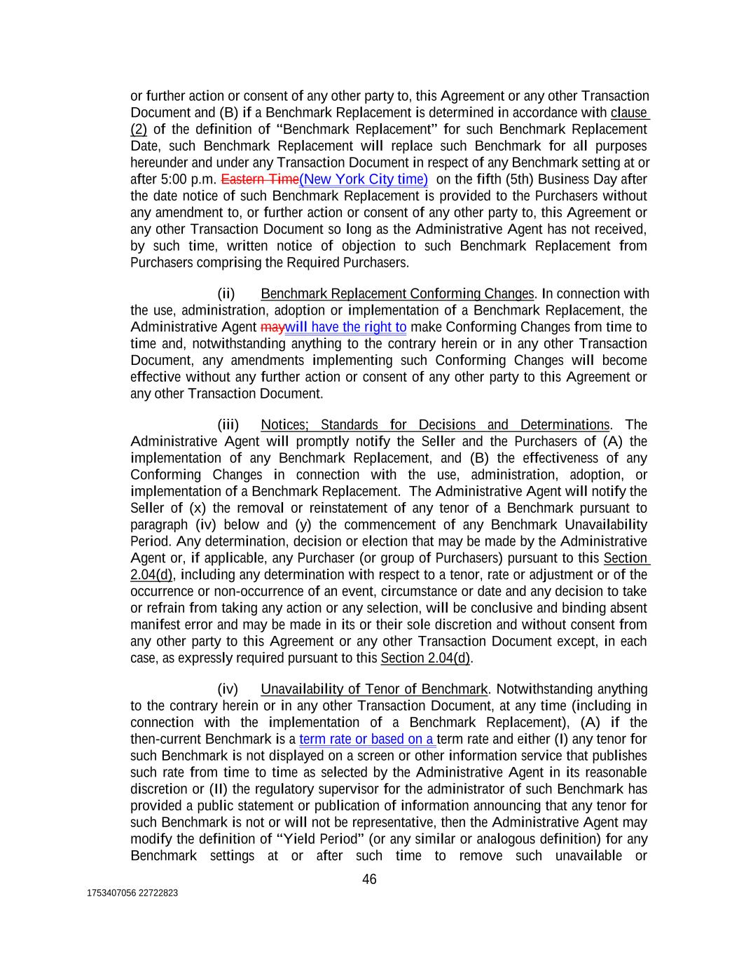 or further action or consent of any other party to, this Agreement or any other Transaction Document and (B) if a Benchmark Replacement is determined in accordance with clause (2) of the definition of “Benchmark Replacement” for such Benchmark Replacement Date, such Benchmark Replacement will replace such Benchmark for all purposes hereunder and under any Transaction Document in respect of any Benchmark setting at or after 5:00 p.m. Eastern Time(New York City time) on the fifth (5th) Business Day after the date notice of such Benchmark Replacement is provided to the Purchasers without any amendment to, or further action or consent of any other party to, this Agreement or any other Transaction Document so long as the Administrative Agent has not received, by such time, written notice of objection to such Benchmark Replacement from Purchasers comprising the Required Purchasers. (ii) Benchmark Replacement Conforming Changes. In connection with the use, administration, adoption or implementation of a Benchmark Replacement, the Administrative Agent maywill have the right to make Conforming Changes from time to time and, notwithstanding anything to the contrary herein or in any other Transaction Document, any amendments implementing such Conforming Changes will become effective without any further action or consent of any other party to this Agreement or any other Transaction Document. (iii) Notices; Standards for Decisions and Determinations. The Administrative Agent will promptly notify the Seller and the Purchasers of (A) the implementation of any Benchmark Replacement, and (B) the effectiveness of any Conforming Changes in connection with the use, administration, adoption, or implementation of a Benchmark Replacement. The Administrative Agent will notify the Seller of (x) the removal or reinstatement of any tenor of a Benchmark pursuant to paragraph (iv) below and (y) the commencement of any Benchmark Unavailability Period. Any determination, decision or election that may be made by the Administrative Agent or, if applicable, any Purchaser (or group of Purchasers) pursuant to this Section 2.04(d), including any determination with respect to a tenor, rate or adjustment or of the occurrence or non-occurrence of an event, circumstance or date and any decision to take or refrain from taking any action or any selection, will be conclusive and binding absent manifest error and may be made in its or their sole discretion and without consent from any other party to this Agreement or any other Transaction Document except, in each case, as expressly required pursuant to this Section 2.04(d). (iv) Unavailability of Tenor of Benchmark. Notwithstanding anything to the contrary herein or in any other Transaction Document, at any time (including in connection with the implementation of a Benchmark Replacement), (A) if the then-current Benchmark is a term rate or based on a term rate and either (I) any tenor for such Benchmark is not displayed on a screen or other information service that publishes such rate from time to time as selected by the Administrative Agent in its reasonable discretion or (II) the regulatory supervisor for the administrator of such Benchmark has provided a public statement or publication of information announcing that any tenor for such Benchmark is not or will not be representative, then the Administrative Agent may modify the definition of “Yield Period” (or any similar or analogous definition) for any Benchmark settings at or after such time to remove such unavailable or 46 1753407056 22722823