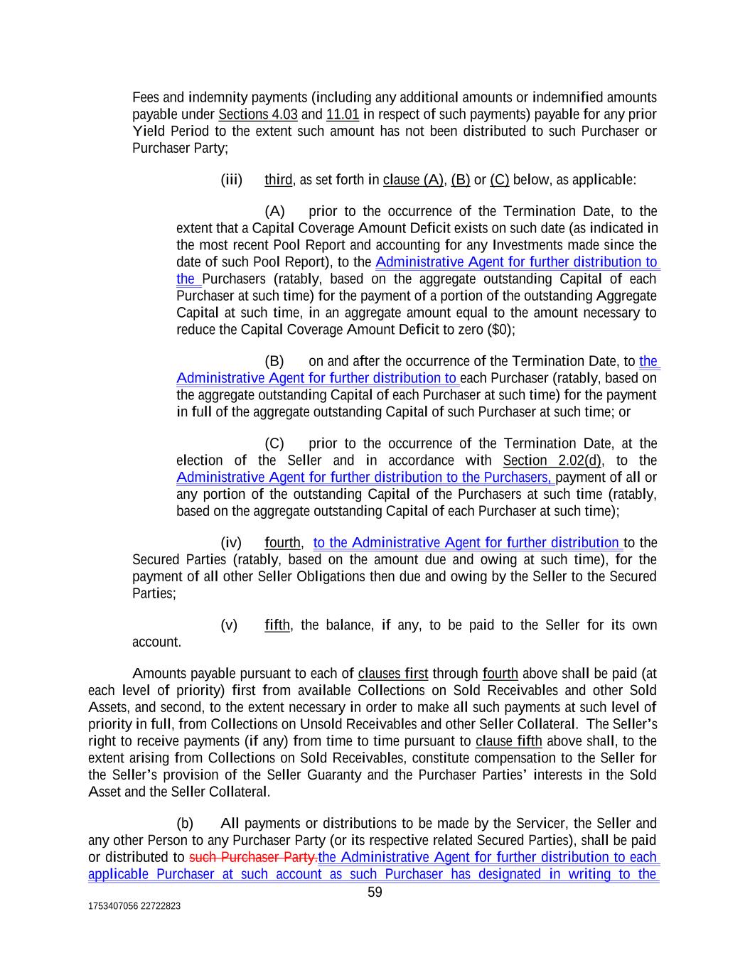 Fees and indemnity payments (including any additional amounts or indemnified amounts payable under Sections 4.03 and 11.01 in respect of such payments) payable for any prior Yield Period to the extent such amount has not been distributed to such Purchaser or Purchaser Party; (iii) third, as set forth in clause (A), (B) or (C) below, as applicable: (A) prior to the occurrence of the Termination Date, to the extent that a Capital Coverage Amount Deficit exists on such date (as indicated in the most recent Pool Report and accounting for any Investments made since the date of such Pool Report), to the Administrative Agent for further distribution to the Purchasers (ratably, based on the aggregate outstanding Capital of each Purchaser at such time) for the payment of a portion of the outstanding Aggregate Capital at such time, in an aggregate amount equal to the amount necessary to reduce the Capital Coverage Amount Deficit to zero ($0); (B) on and after the occurrence of the Termination Date, to the Administrative Agent for further distribution to each Purchaser (ratably, based on the aggregate outstanding Capital of each Purchaser at such time) for the payment in full of the aggregate outstanding Capital of such Purchaser at such time; or (C) prior to the occurrence of the Termination Date, at the election of the Seller and in accordance with Section 2.02(d), to the Administrative Agent for further distribution to the Purchasers, payment of all or any portion of the outstanding Capital of the Purchasers at such time (ratably, based on the aggregate outstanding Capital of each Purchaser at such time); (iv) fourth, to the Administrative Agent for further distribution to the Secured Parties (ratably, based on the amount due and owing at such time), for the payment of all other Seller Obligations then due and owing by the Seller to the Secured Parties; (v) fifth, the balance, if any, to be paid to the Seller for its own account. Amounts payable pursuant to each of clauses first through fourth above shall be paid (at each level of priority) first from available Collections on Sold Receivables and other Sold Assets, and second, to the extent necessary in order to make all such payments at such level of priority in full, from Collections on Unsold Receivables and other Seller Collateral. The Seller’s right to receive payments (if any) from time to time pursuant to clause fifth above shall, to the extent arising from Collections on Sold Receivables, constitute compensation to the Seller for the Seller’s provision of the Seller Guaranty and the Purchaser Parties’ interests in the Sold Asset and the Seller Collateral. (b) All payments or distributions to be made by the Servicer, the Seller and any other Person to any Purchaser Party (or its respective related Secured Parties), shall be paid or distributed to such Purchaser Party.the Administrative Agent for further distribution to each applicable Purchaser at such account as such Purchaser has designated in writing to the 59 1753407056 22722823