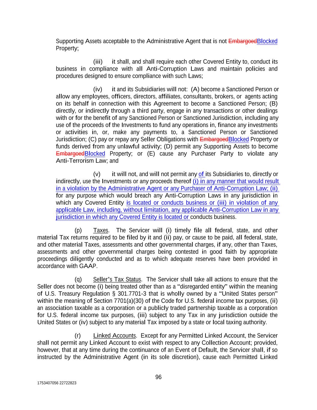 Supporting Assets acceptable to the Administrative Agent that is not EmbargoedBlocked Property; (iii) it shall, and shall require each other Covered Entity to, conduct its business in compliance with all Anti-Corruption Laws and maintain policies and procedures designed to ensure compliance with such Laws; (iv) it and its Subsidiaries will not: (A) become a Sanctioned Person or allow any employees, officers, directors, affiliates, consultants, brokers, or agents acting on its behalf in connection with this Agreement to become a Sanctioned Person; (B) directly, or indirectly through a third party, engage in any transactions or other dealings with or for the benefit of any Sanctioned Person or Sanctioned Jurisdiction, including any use of the proceeds of the Investments to fund any operations in, finance any investments or activities in, or, make any payments to, a Sanctioned Person or Sanctioned Jurisdiction; (C) pay or repay any Seller Obligations with EmbargoedBlocked Property or funds derived from any unlawful activity; (D) permit any Supporting Assets to become EmbargoedBlocked Property; or (E) cause any Purchaser Party to violate any Anti-Terrorism Law; and (v) it will not, and will not permit any of its Subsidiaries to, directly or indirectly, use the Investments or any proceeds thereof (i) in any manner that would result in a violation by the Administrative Agent or any Purchaser of Anti-Corruption Law; (ii) for any purpose which would breach any Anti-Corruption Laws in any jurisdiction in which any Covered Entity is located or conducts business or (iii) in violation of any applicable Law, including, without limitation, any applicable Anti-Corruption Law in any jurisdiction in which any Covered Entity is located or conducts business. (p) Taxes. The Servicer will (i) timely file all federal, state, and other material Tax returns required to be filed by it and (ii) pay, or cause to be paid, all federal, state, and other material Taxes, assessments and other governmental charges, if any, other than Taxes, assessments and other governmental charges being contested in good faith by appropriate proceedings diligently conducted and as to which adequate reserves have been provided in accordance with GAAP. (q) Seller’s Tax Status. The Servicer shall take all actions to ensure that the Seller does not become (i) being treated other than as a “disregarded entity” within the meaning of U.S. Treasury Regulation § 301.7701-3 that is wholly owned by a “United States person” within the meaning of Section 7701(a)(30) of the Code for U.S. federal income tax purposes, (ii) an association taxable as a corporation or a publicly traded partnership taxable as a corporation for U.S. federal income tax purposes, (iii) subject to any Tax in any jurisdiction outside the United States or (iv) subject to any material Tax imposed by a state or local taxing authority. (r) Linked Accounts. Except for any Permitted Linked Account, the Servicer shall not permit any Linked Account to exist with respect to any Collection Account; provided, however, that at any time during the continuance of an Event of Default, the Servicer shall, if so instructed by the Administrative Agent (in its sole discretion), cause each Permitted Linked 96 1753407056 22722823