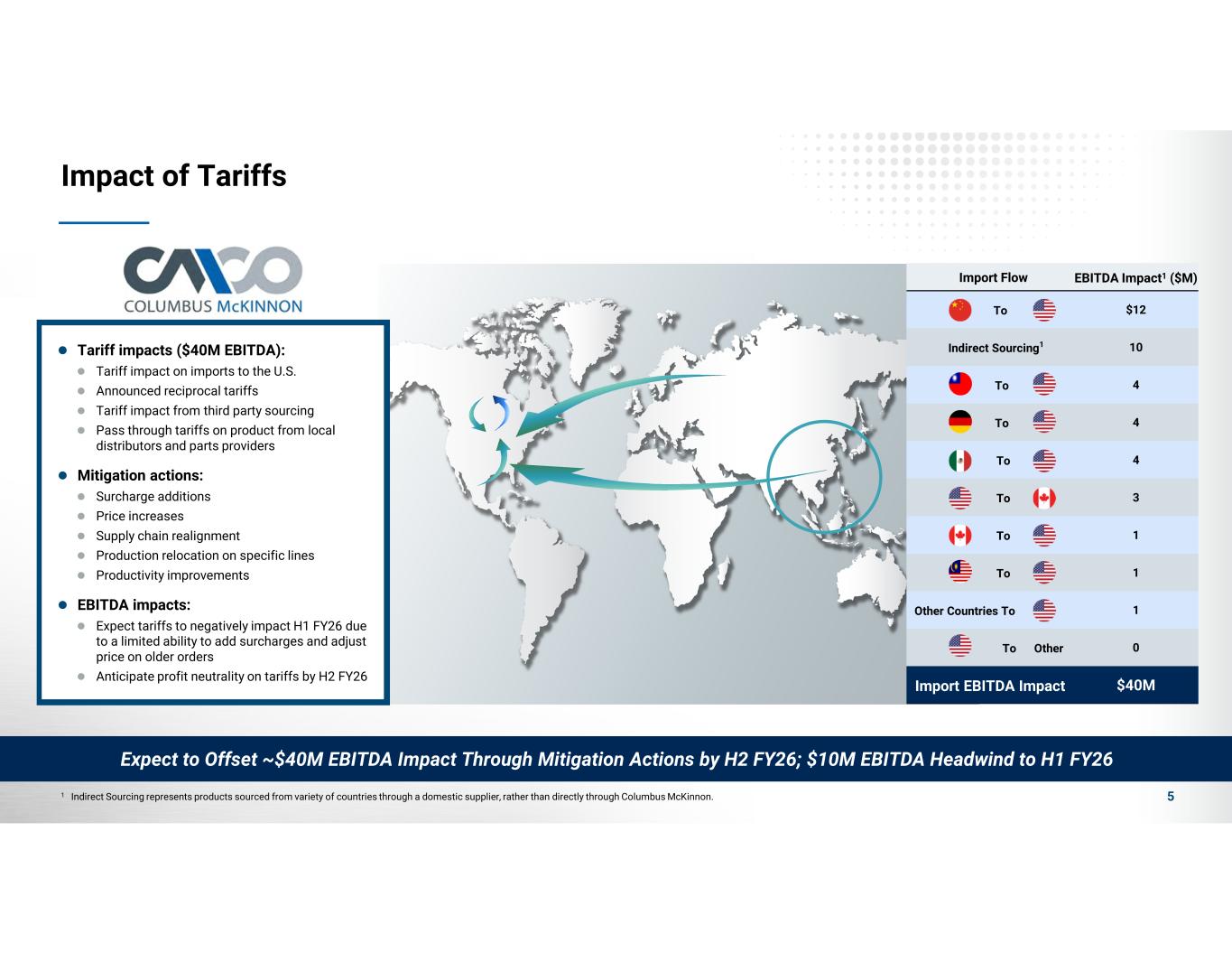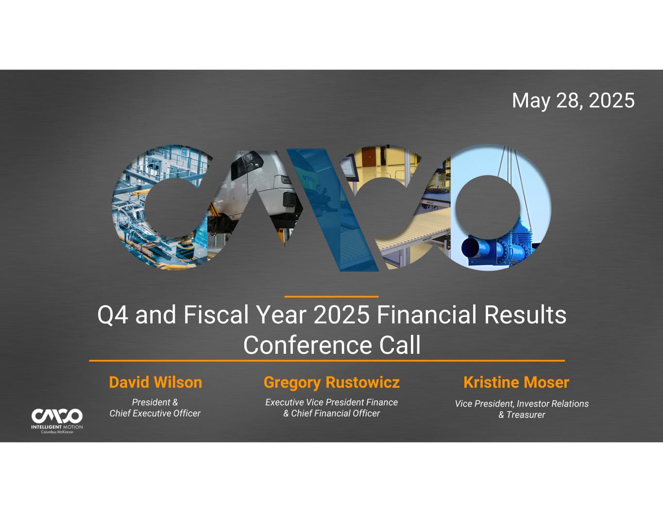CHARLOTTE, NC, May 28, 2025 - Columbus McKinnon Corporation (Nasdaq: CMCO) ("Columbus McKinnon" or the "Company"), a leading designer, manufacturer and marketer of intelligent motion solutions for material handling, today announced financial results for its full year and fourth quarter fiscal 2025, which ended March 31, 2025.