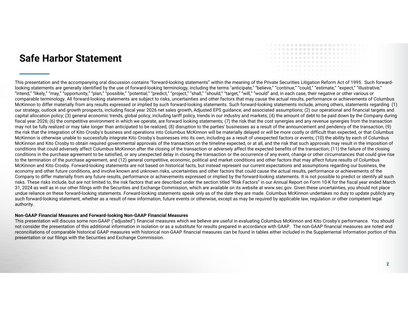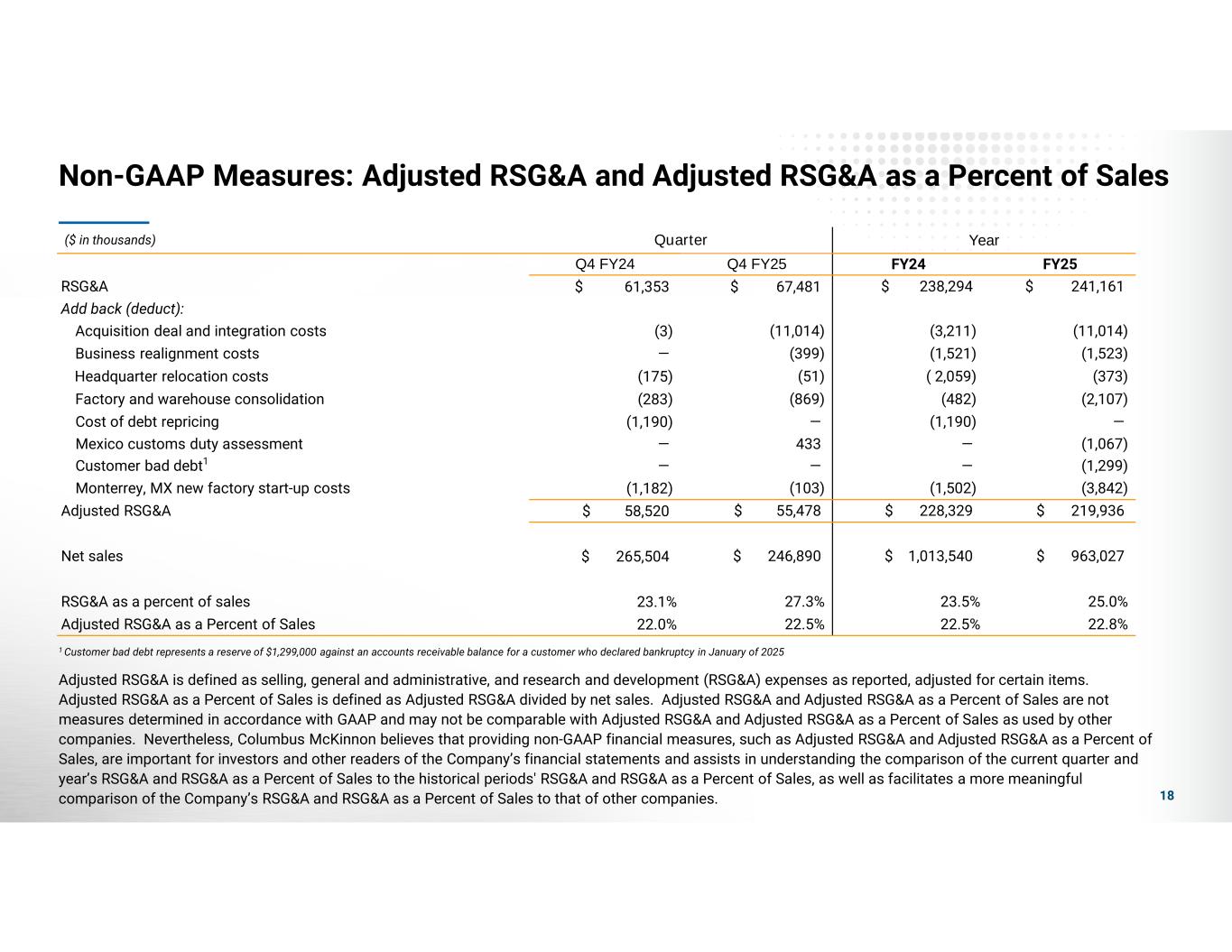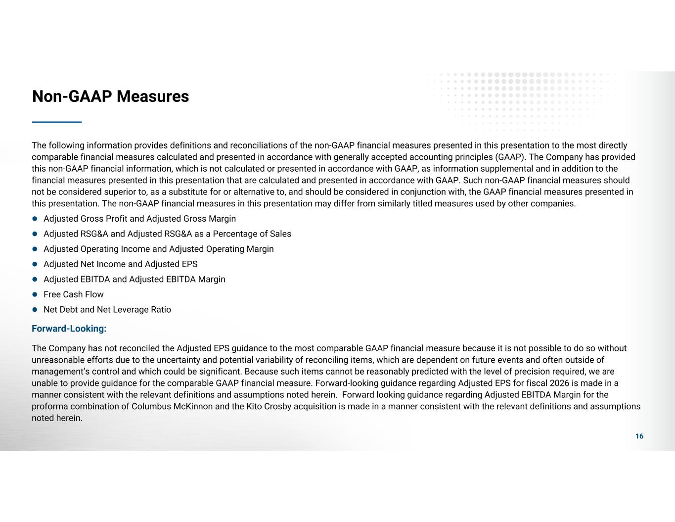 Adjusted Gross Profit is defined as gross profit as reported, adjusted for certain items. Adjusted Gross Margin is defined as Adjusted Gross Profit divided by net sales. Adjusted Gross Profit and Adjusted Gross Margin are not measures determined in accordance with GAAP and may not be comparable with Adjusted Gross Profit and Adjusted Gross Margin as used by other companies. Nevertheless, Columbus McKinnon believes that providing non-GAAP financial measures, such as Adjusted Gross Profit and Adjusted Gross Margin, are important for investors and other readers of the Company’s financial statements and assists in understanding the comparison of the current quarter’s and current year's gross profit and gross margin to the historical periods' gross profit, as well as facilitates a more meaningful comparison of the Company’s gross profit and gross margin to that of other companies.