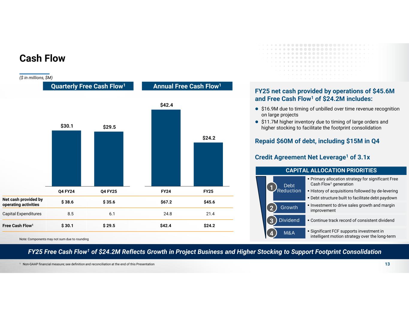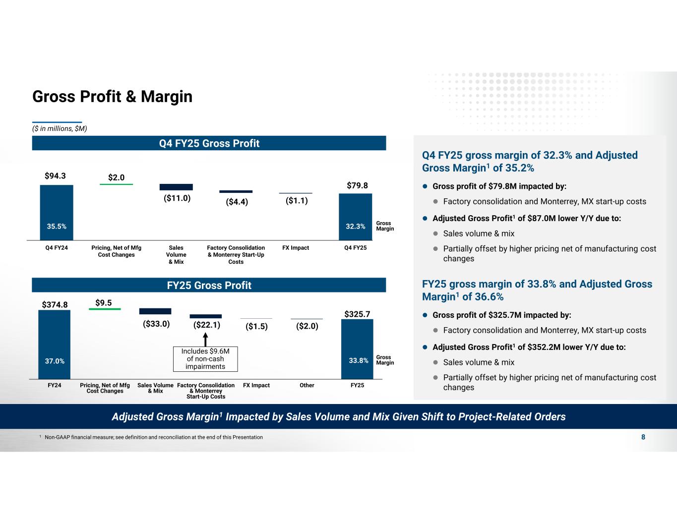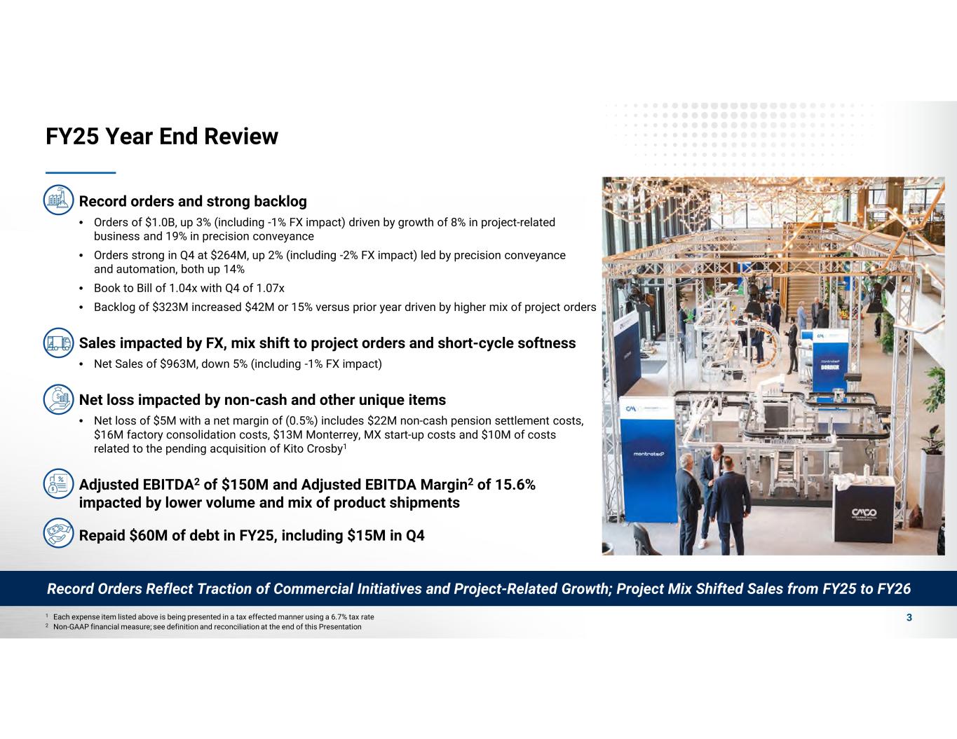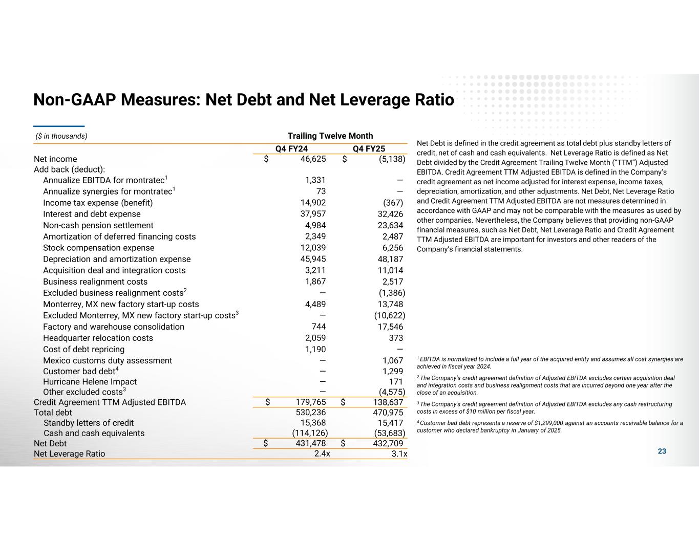 •Net loss of $5.1 million with a net margin of (0.5%) includes $22.1 million non-cash pension settlement costs, $16.4 million factory consolidation costs, $12.8 million Monterrey, MX start-up costs and $10.3 million of costs related to the pending acquisition of Kito Crosby2