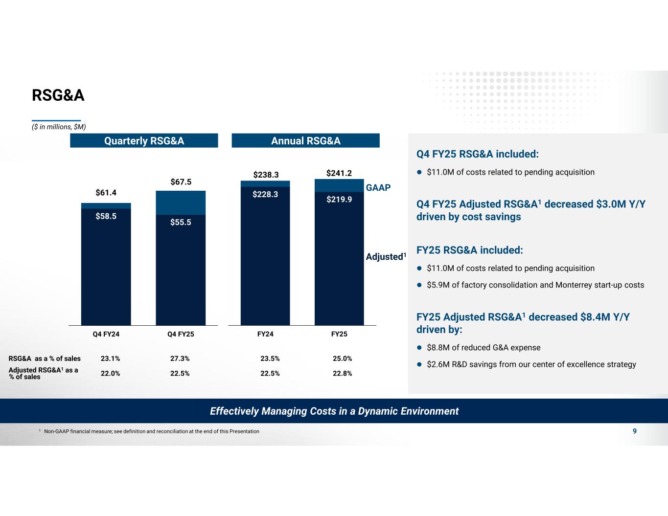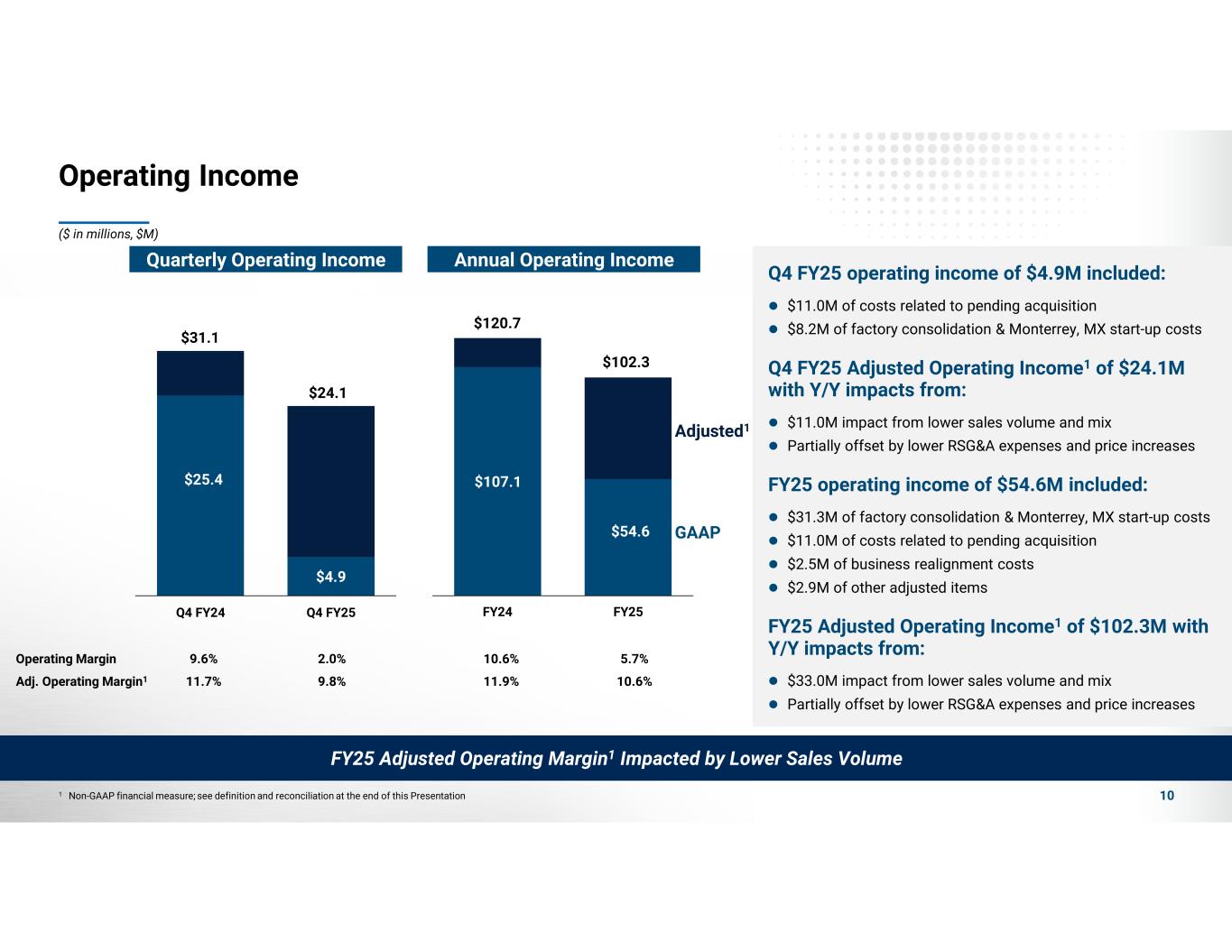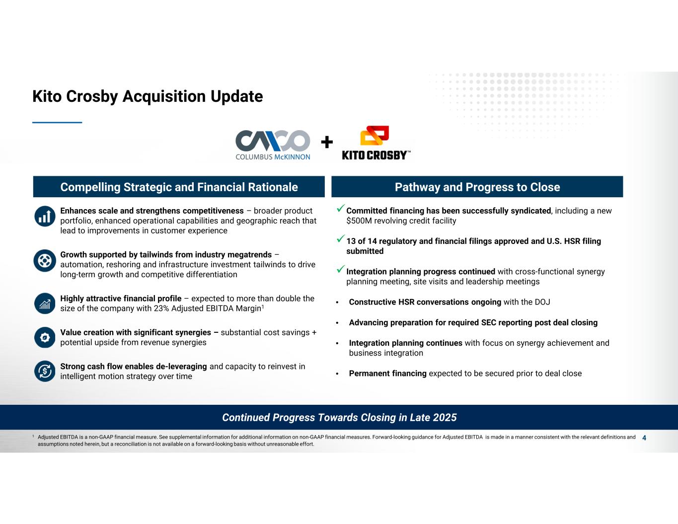 •Net loss of $2.7 million with a net margin of (1.1%) includes $8.5 million costs related to the pending acquisition of Kito Crosby, $3.8 million factory consolidation costs and $2.4 million Monterrey, MX start-up costs2