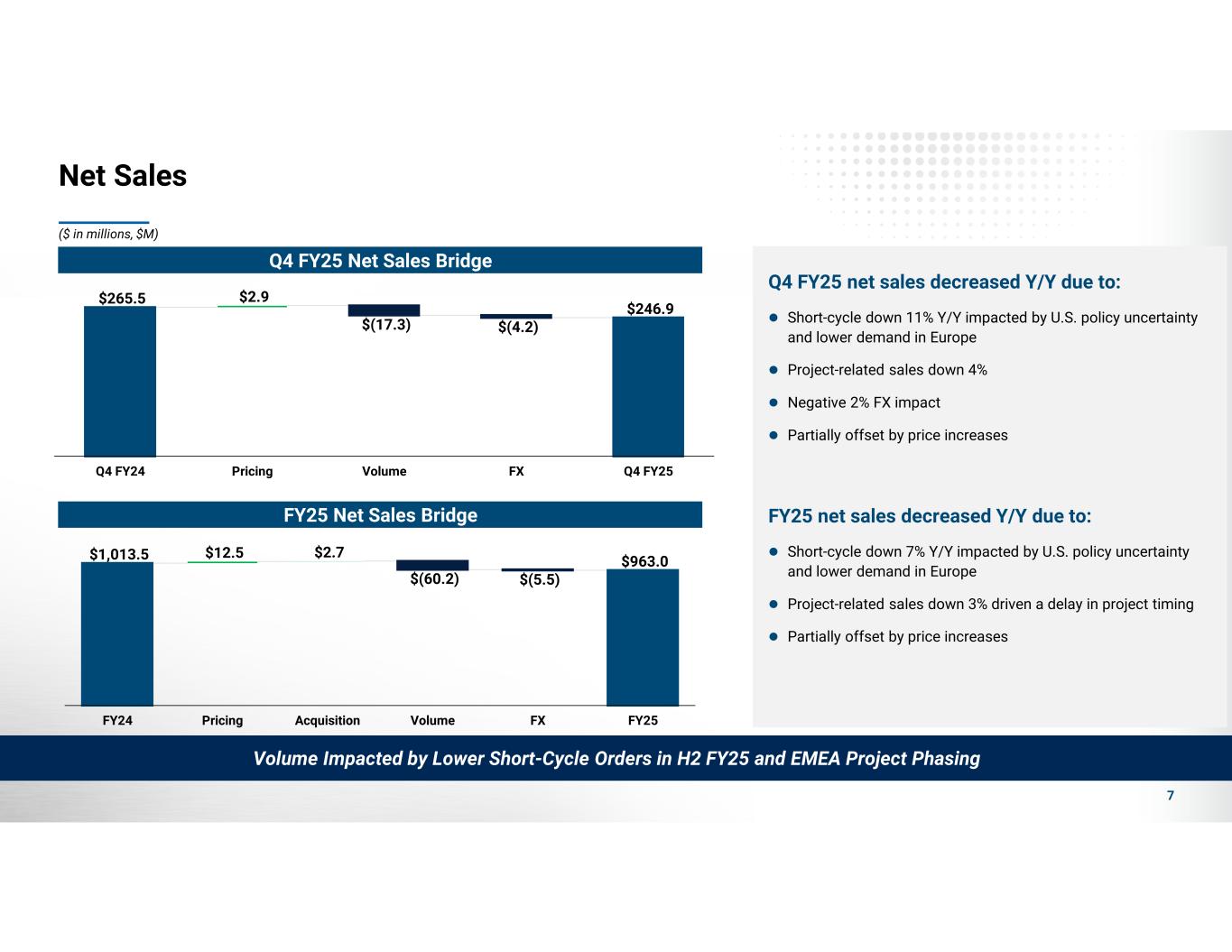 •Net sales of $963.0 million, down 5%, inclusive of a negative 1% foreign exchange impact, driven by short cycle order softness and higher project-related orders with a longer delivery timeframe