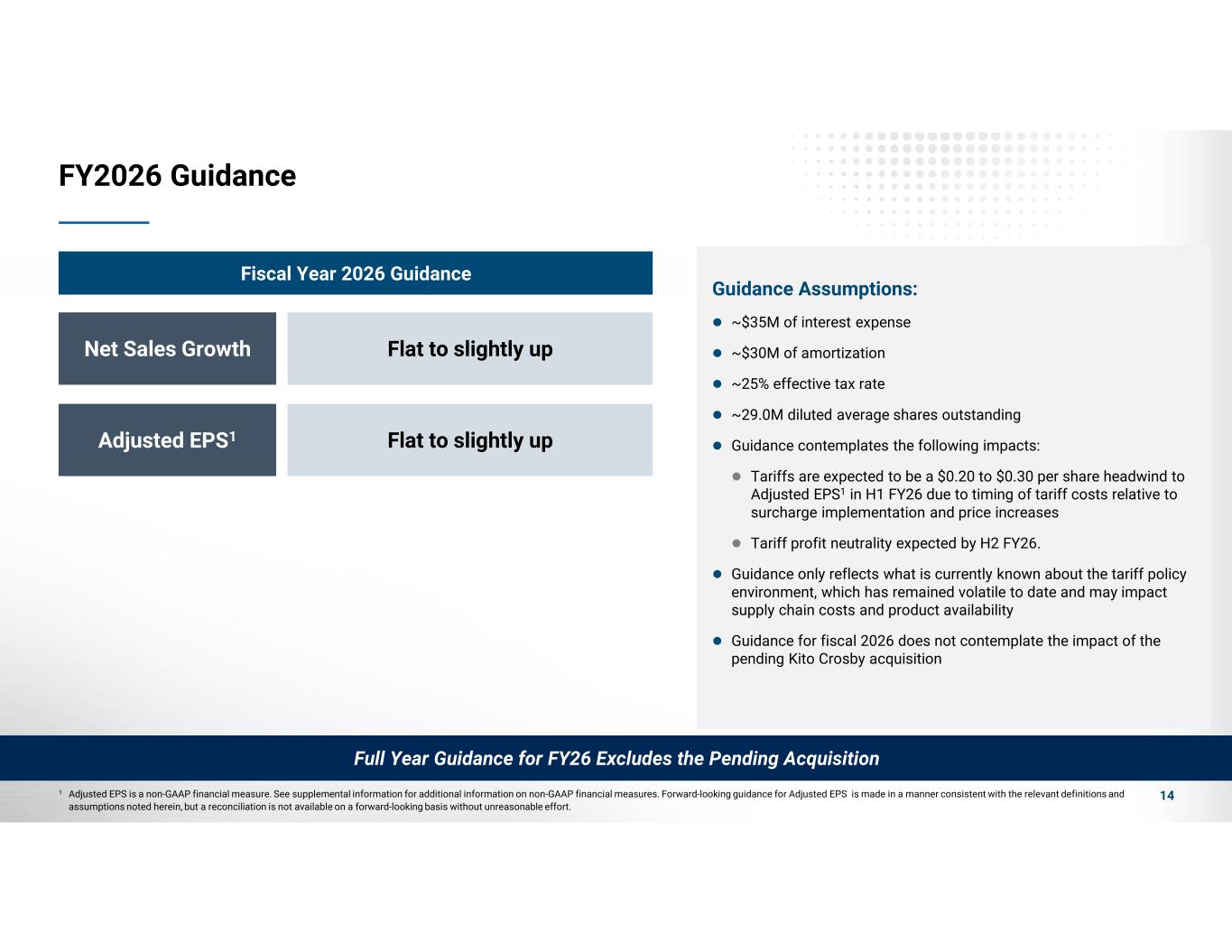 “We enter fiscal 2026 with a strong backlog and continued order growth as our commercial initiatives gain traction. Our conviction in Columbus McKinnon's strategy and business model remains strong as we continue to anticipate tailwinds from industry megatrends like on-shoring, scarcity of labor and global infrastructure investments over time,” said David Wilson, President and Chief Executive Officer. "We have a strong track record of navigating through uncertain environments and managing performance through volatility. Accordingly, we are actively working to mitigate the impact of tariff policies with supply chain adjustments, surcharges and price. I want to thank our Columbus McKinnon team for their relentless efforts to continuously improve customer service and advance our strategic initiatives as we execute on fiscal 2026 and work toward the closing of the Kito Crosby acquisition." For the quarter, net sales decreased $18.6 million, or 7.0%.