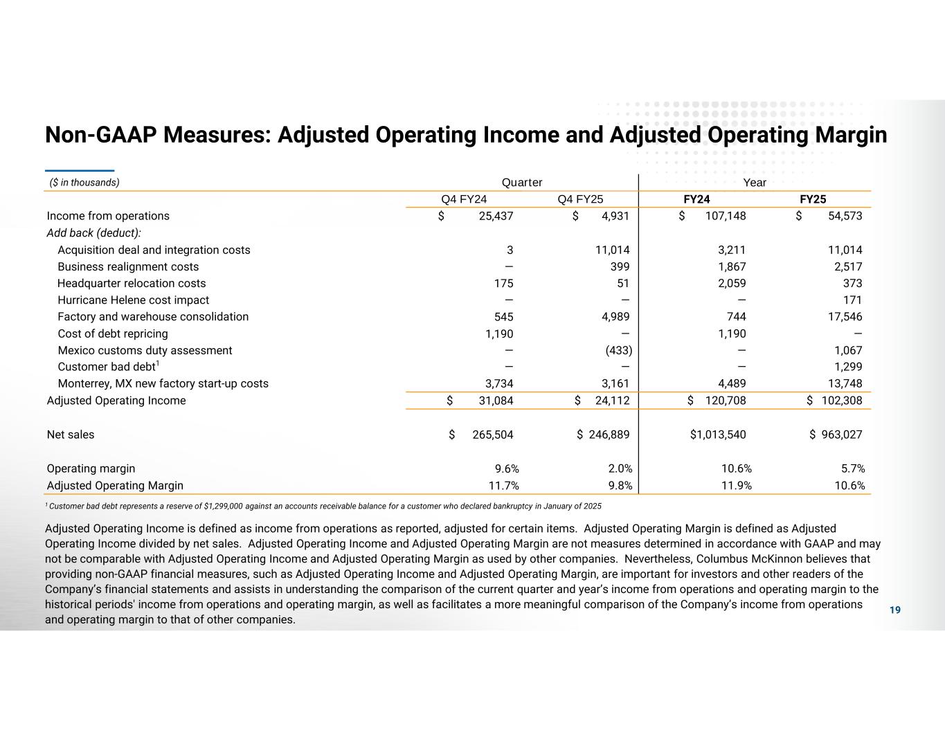 Adjusted Operating Income is defined as income from operations as reported, adjusted for certain items. Adjusted Operating Margin is defined as Adjusted Operating Income divided by net sales. Adjusted Operating Income and Adjusted Operating Margin are not measures determined in accordance with GAAP and may not be comparable with Adjusted Operating Income and Adjusted Operating Margin as used by other companies. Nevertheless, Columbus McKinnon believes that providing non-GAAP financial measures, such as Adjusted Operating Income and Adjusted Operating Margin, are important for investors and other readers of the Company’s financial statements and assists in understanding the comparison of the current quarter’s and current year's income from operations to the historical periods' income from operations and operating margin, as well as facilitates a more meaningful comparison of the Company’s income from operations and operating margin to that of other companies.