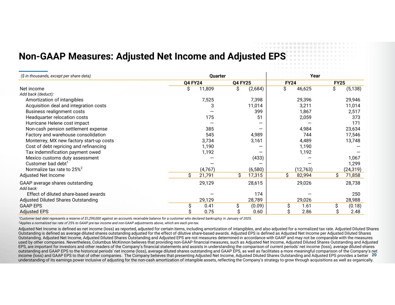 Adjusted Net Income and Adjusted EPS are defined as net income (loss) and GAAP EPS as reported, adjusted for certain items, including amortization of intangibles, and also adjusted for a normalized tax rate. Adjusted Diluted Shares Outstanding is defined as GAAP average diluted shares outstanding adjusted for the effect of dilutive share-based awards. Adjusted Net Income, Adjusted Diluted Shares Outstanding and Adjusted EPS are not measures determined in accordance with GAAP and may not be comparable with the measures used by other companies. Nevertheless, Columbus McKinnon believes that providing non-GAAP financial measures, such as Adjusted Net Income, Adjusted Diluted Shares Outstanding and Adjusted EPS, are important for investors and other readers of the Company’s financial statements and assists in understanding the comparison of the current periods’ net income (loss), average diluted shares outstanding and GAAP EPS to the historical periods' net income (loss), average diluted shares outstanding and GAAP EPS, as well as facilitates a more meaningful comparison of the Company’s net income (loss) and GAAP EPS to that of other companies. The Company believes that presenting Adjusted Net Income, Adjusted Diluted Shares Outstanding and Adjusted EPS provides a better understanding of its earnings power inclusive of adjusting for the non-cash amortization of intangible assets, reflecting the Company’s strategy to grow through acquisitions as well as organically.
