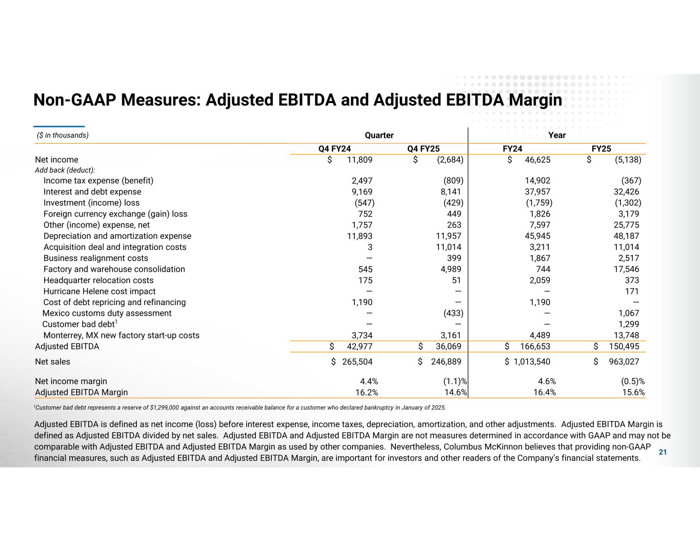 Adjusted EBITDA is defined as net income (loss) before interest expense, income taxes, depreciation, amortization, and other adjustments. Adjusted EBITDA Margin is defined as Adjusted EBITDA divided by net sales. Adjusted EBITDA and Adjusted EBITDA Margin are not measures determined in accordance with GAAP and may not be comparable with Adjusted EBITDA and Adjusted EBITDA Margin as used by other companies. Nevertheless, Columbus McKinnon believes that providing non-GAAP financial measures, such as Adjusted EBITDA and Adjusted EBITDA Margin, are important for investors and other readers of the Company’s financial statements.
