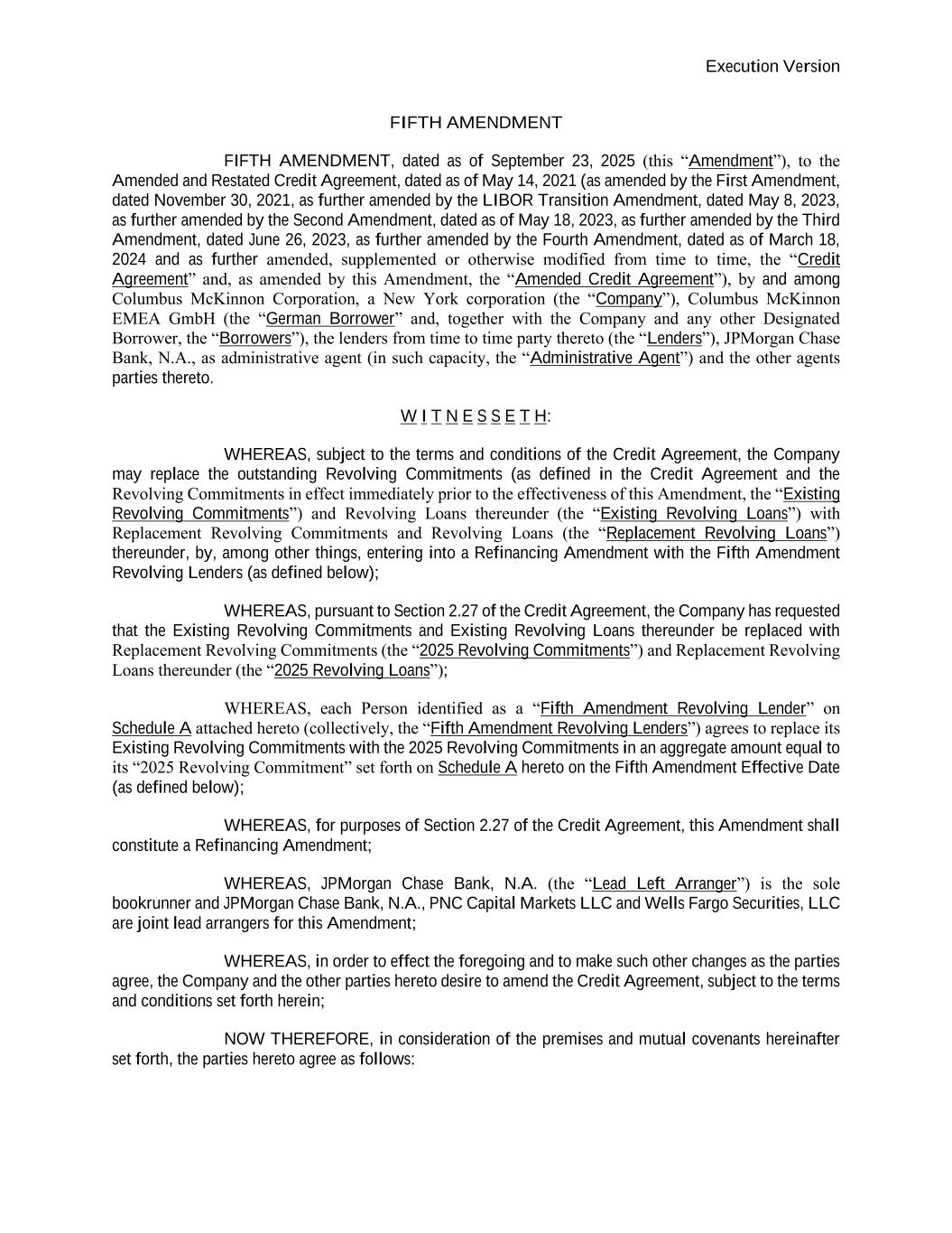 Execution Version FIFTH AMENDMENT FIFTH AMENDMENT, dated as of September 23, 2025 (this “Amendment”), to the Amended and Restated Credit Agreement, dated as of May 14, 2021 (as amended by the First Amendment, dated November 30, 2021, as further amended by the LIBOR Transition Amendment, dated May 8, 2023, as further amended by the Second Amendment, dated as of May 18, 2023, as further amended by the Third Amendment, dated June 26, 2023, as further amended by the Fourth Amendment, dated as of March 18, 2024 and as further amended, supplemented or otherwise modified from time to time, the “Credit Agreement” and, as amended by this Amendment, the “Amended Credit Agreement”), by and among Columbus McKinnon Corporation, a New York corporation (the “Company”), Columbus McKinnon EMEA GmbH (the “German Borrower” and, together with the Company and any other Designated Borrower, the “Borrowers”), the lenders from time to time party thereto (the “Lenders”), JPMorgan Chase Bank, N.A., as administrative agent (in such capacity, the “Administrative Agent”) and the other agents parties thereto. W I T N E S S E T H: WHEREAS, subject to the terms and conditions of the Credit Agreement, the Company may replace the outstanding Revolving Commitments (as defined in the Credit Agreement and the Revolving Commitments in effect immediately prior to the effectiveness of this Amendment, the “Existing Revolving Commitments”) and Revolving Loans thereunder (the “Existing Revolving Loans”) with Replacement Revolving Commitments and Revolving Loans (the “Replacement Revolving Loans”) thereunder, by, among other things, entering into a Refinancing Amendment with the Fifth Amendment Revolving Lenders (as defined below); WHEREAS, pursuant to Section 2.27 of the Credit Agreement, the Company has requested that the Existing Revolving Commitments and Existing Revolving Loans thereunder be replaced with Replacement Revolving Commitments (the “2025 Revolving Commitments”) and Replacement Revolving Loans thereunder (the “2025 Revolving Loans”); WHEREAS, each Person identified as a “Fifth Amendment Revolving Lender” on Schedule A attached hereto (collectively, the “Fifth Amendment Revolving Lenders”) agrees to replace its Existing Revolving Commitments with the 2025 Revolving Commitments in an aggregate amount equal to its “2025 Revolving Commitment” set forth on Schedule A hereto on the Fifth Amendment Effective Date (as defined below); WHEREAS, for purposes of Section 2.27 of the Credit Agreement, this Amendment shall constitute a Refinancing Amendment; WHEREAS, JPMorgan Chase Bank, N.A. (the “Lead Left Arranger”) is the sole bookrunner and JPMorgan Chase Bank, N.A., PNC Capital Markets LLC and Wells Fargo Securities, LLC are joint lead arrangers for this Amendment; WHEREAS, in order to effect the foregoing and to make such other changes as the parties agree, the Company and the other parties hereto desire to amend the Credit Agreement, subject to the terms and conditions set forth herein; NOW THEREFORE, in consideration of the premises and mutual covenants hereinafter set forth, the parties hereto agree as follows: