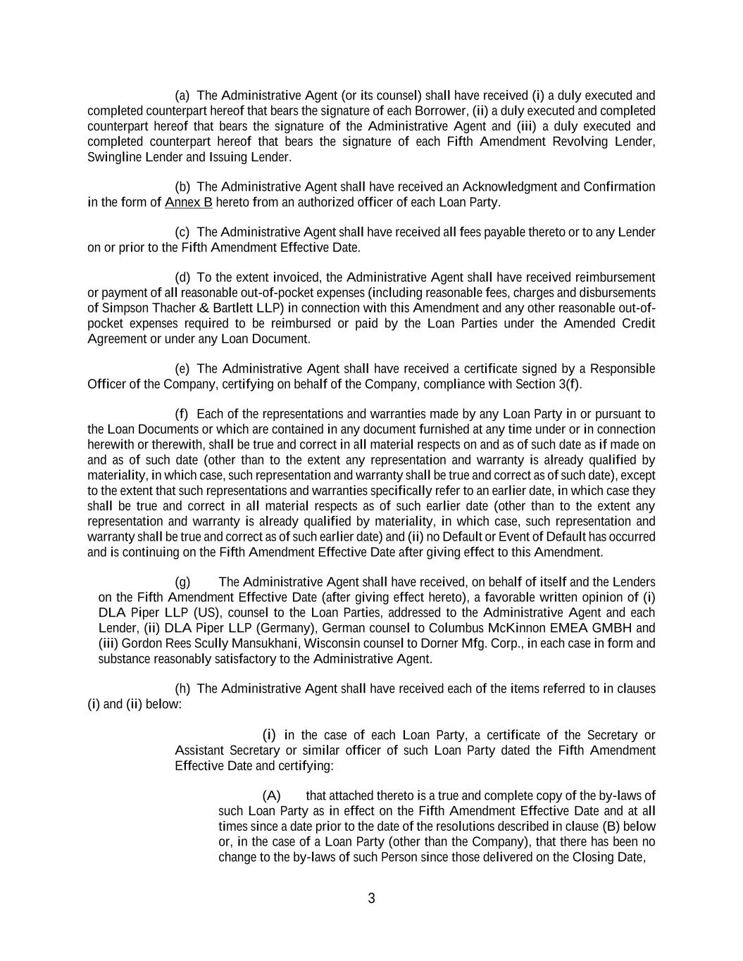 3 (a) The Administrative Agent (or its counsel) shall have received (i) a duly executed and completed counterpart hereof that bears the signature of each Borrower, (ii) a duly executed and completed counterpart hereof that bears the signature of the Administrative Agent and (iii) a duly executed and completed counterpart hereof that bears the signature of each Fifth Amendment Revolving Lender, Swingline Lender and Issuing Lender. (b) The Administrative Agent shall have received an Acknowledgment and Confirmation in the form of Annex B hereto from an authorized officer of each Loan Party. (c) The Administrative Agent shall have received all fees payable thereto or to any Lender on or prior to the Fifth Amendment Effective Date. (d) To the extent invoiced, the Administrative Agent shall have received reimbursement or payment of all reasonable out-of-pocket expenses (including reasonable fees, charges and disbursements of Simpson Thacher & Bartlett LLP) in connection with this Amendment and any other reasonable out-of- pocket expenses required to be reimbursed or paid by the Loan Parties under the Amended Credit Agreement or under any Loan Document. (e) The Administrative Agent shall have received a certificate signed by a Responsible Officer of the Company, certifying on behalf of the Company, compliance with Section 3(f). (f) Each of the representations and warranties made by any Loan Party in or pursuant to the Loan Documents or which are contained in any document furnished at any time under or in connection herewith or therewith, shall be true and correct in all material respects on and as of such date as if made on and as of such date (other than to the extent any representation and warranty is already qualified by materiality, in which case, such representation and warranty shall be true and correct as of such date), except to the extent that such representations and warranties specifically refer to an earlier date, in which case they shall be true and correct in all material respects as of such earlier date (other than to the extent any representation and warranty is already qualified by materiality, in which case, such representation and warranty shall be true and correct as of such earlier date) and (ii) no Default or Event of Default has occurred and is continuing on the Fifth Amendment Effective Date after giving effect to this Amendment. (g) The Administrative Agent shall have received, on behalf of itself and the Lenders on the Fifth Amendment Effective Date (after giving effect hereto), a favorable written opinion of (i) DLA Piper LLP (US), counsel to the Loan Parties, addressed to the Administrative Agent and each Lender, (ii) DLA Piper LLP (Germany), German counsel to Columbus McKinnon EMEA GMBH and (iii) Gordon Rees Scully Mansukhani, Wisconsin counsel to Dorner Mfg. Corp., in each case in form and substance reasonably satisfactory to the Administrative Agent. (h) The Administrative Agent shall have received each of the items referred to in clauses (i) and (ii) below: (i) in the case of each Loan Party, a certificate of the Secretary or Assistant Secretary or similar officer of such Loan Party dated the Fifth Amendment Effective Date and certifying: (A) that attached thereto is a true and complete copy of the by-laws of such Loan Party as in effect on the Fifth Amendment Effective Date and at all times since a date prior to the date of the resolutions described in clause (B) below or, in the case of a Loan Party (other than the Company), that there has been no change to the by-laws of such Person since those delivered on the Closing Date,
