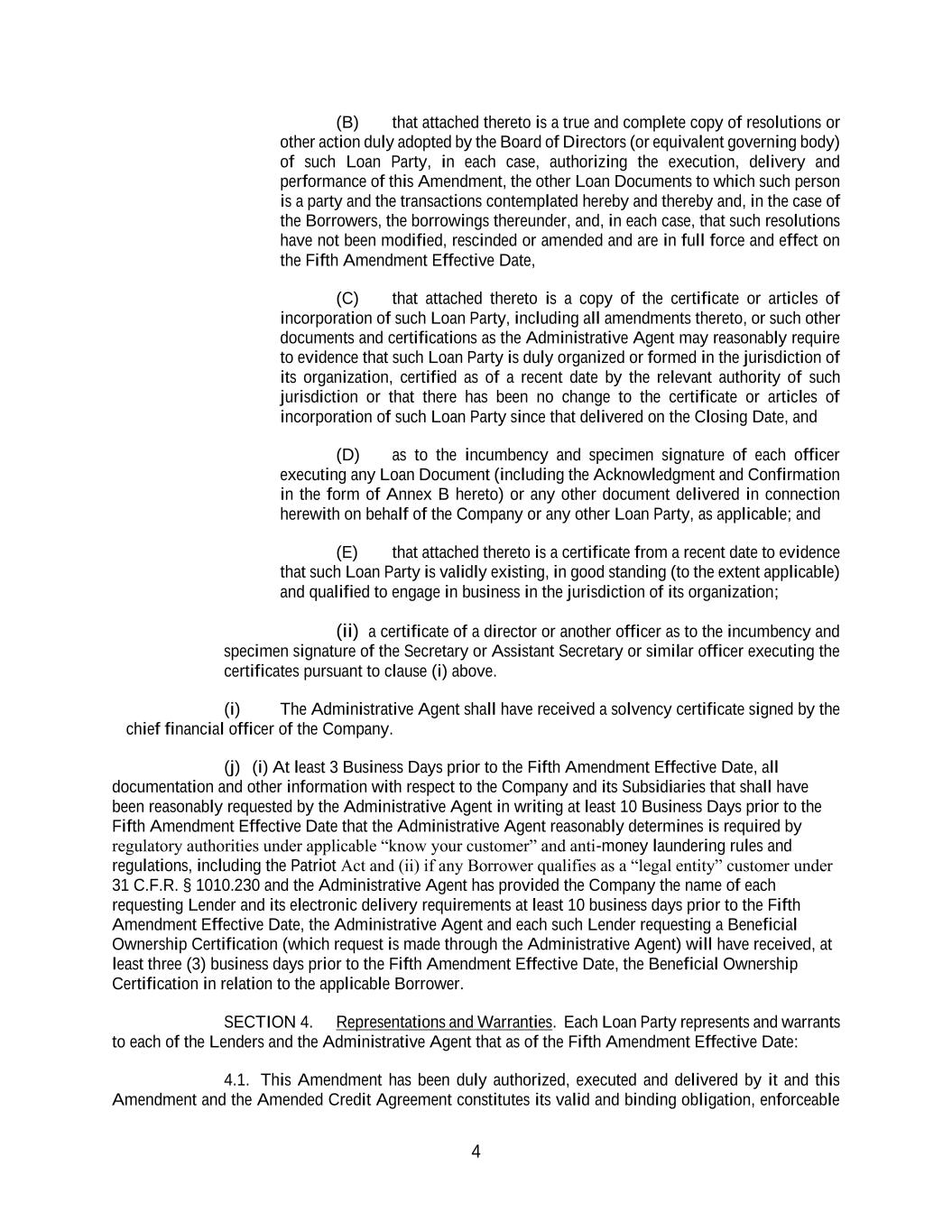 4 (B) that attached thereto is a true and complete copy of resolutions or other action duly adopted by the Board of Directors (or equivalent governing body) of such Loan Party, in each case, authorizing the execution, delivery and performance of this Amendment, the other Loan Documents to which such person is a party and the transactions contemplated hereby and thereby and, in the case of the Borrowers, the borrowings thereunder, and, in each case, that such resolutions have not been modified, rescinded or amended and are in full force and effect on the Fifth Amendment Effective Date, (C) that attached thereto is a copy of the certificate or articles of incorporation of such Loan Party, including all amendments thereto, or such other documents and certifications as the Administrative Agent may reasonably require to evidence that such Loan Party is duly organized or formed in the jurisdiction of its organization, certified as of a recent date by the relevant authority of such jurisdiction or that there has been no change to the certificate or articles of incorporation of such Loan Party since that delivered on the Closing Date, and (D) as to the incumbency and specimen signature of each officer executing any Loan Document (including the Acknowledgment and Confirmation in the form of Annex B hereto) or any other document delivered in connection herewith on behalf of the Company or any other Loan Party, as applicable; and (E) that attached thereto is a certificate from a recent date to evidence that such Loan Party is validly existing, in good standing (to the extent applicable) and qualified to engage in business in the jurisdiction of its organization; (ii) a certificate of a director or another officer as to the incumbency and specimen signature of the Secretary or Assistant Secretary or similar officer executing the certificates pursuant to clause (i) above. (i) The Administrative Agent shall have received a solvency certificate signed by the chief financial officer of the Company. (j) (i) At least 3 Business Days prior to the Fifth Amendment Effective Date, all documentation and other information with respect to the Company and its Subsidiaries that shall have been reasonably requested by the Administrative Agent in writing at least 10 Business Days prior to the Fifth Amendment Effective Date that the Administrative Agent reasonably determines is required by regulatory authorities under applicable “know your customer” and anti-money laundering rules and regulations, including the Patriot Act and (ii) if any Borrower qualifies as a “legal entity” customer under 31 C.F.R. § 1010.230 and the Administrative Agent has provided the Company the name of each requesting Lender and its electronic delivery requirements at least 10 business days prior to the Fifth Amendment Effective Date, the Administrative Agent and each such Lender requesting a Beneficial Ownership Certification (which request is made through the Administrative Agent) will have received, at least three (3) business days prior to the Fifth Amendment Effective Date, the Beneficial Ownership Certification in relation to the applicable Borrower. SECTION 4. Representations and Warranties. Each Loan Party represents and warrants to each of the Lenders and the Administrative Agent that as of the Fifth Amendment Effective Date: 4.1. This Amendment has been duly authorized, executed and delivered by it and this Amendment and the Amended Credit Agreement constitutes its valid and binding obligation, enforceable