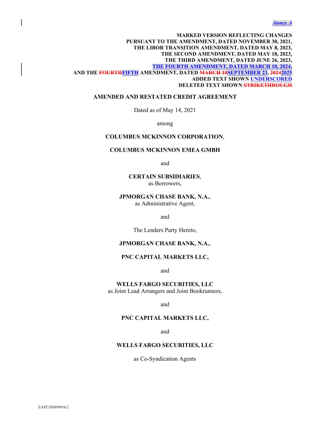 Annex A MARKED VERSION REFLECTING CHANGES PURSUANT TO THE AMENDMENT, DATED NOVEMBER 30, 2021, THE LIBOR TRANSITION AMENDMENT, DATED MAY 8, 2023, THE SECOND AMENDMENT, DATED MAY 18, 2023, THE THIRD AMENDMENT, DATED JUNE 26, 2023, THE FOURTH AMENDMENT, DATED MARCH 18, 2024, AND THE FOURTHFIFTH AMENDMENT, DATED MARCH 18SEPTEMBER 23, 20242025 ADDED TEXT SHOWN UNDERSCORED DELETED TEXT SHOWN STRIKETHROUGH AMENDED AND RESTATED CREDIT AGREEMENT Dated as of May 14, 2021 among COLUMBUS MCKINNON CORPORATION, COLUMBUS MCKINNON EMEA GMBH and CERTAIN SUBSIDIARIES, as Borrowers, JPMORGAN CHASE BANK, N.A., as Administrative Agent, and The Lenders Party Hereto, JPMORGAN CHASE BANK, N.A., PNC CAPITAL MARKETS LLC, and WELLS FARGO SECURITIES, LLC as Joint Lead Arrangers and Joint Bookrunners, and PNC CAPITAL MARKETS LLC, and WELLS FARGO SECURITIES, LLC as Co-Syndication Agents EAST\203059916.2
