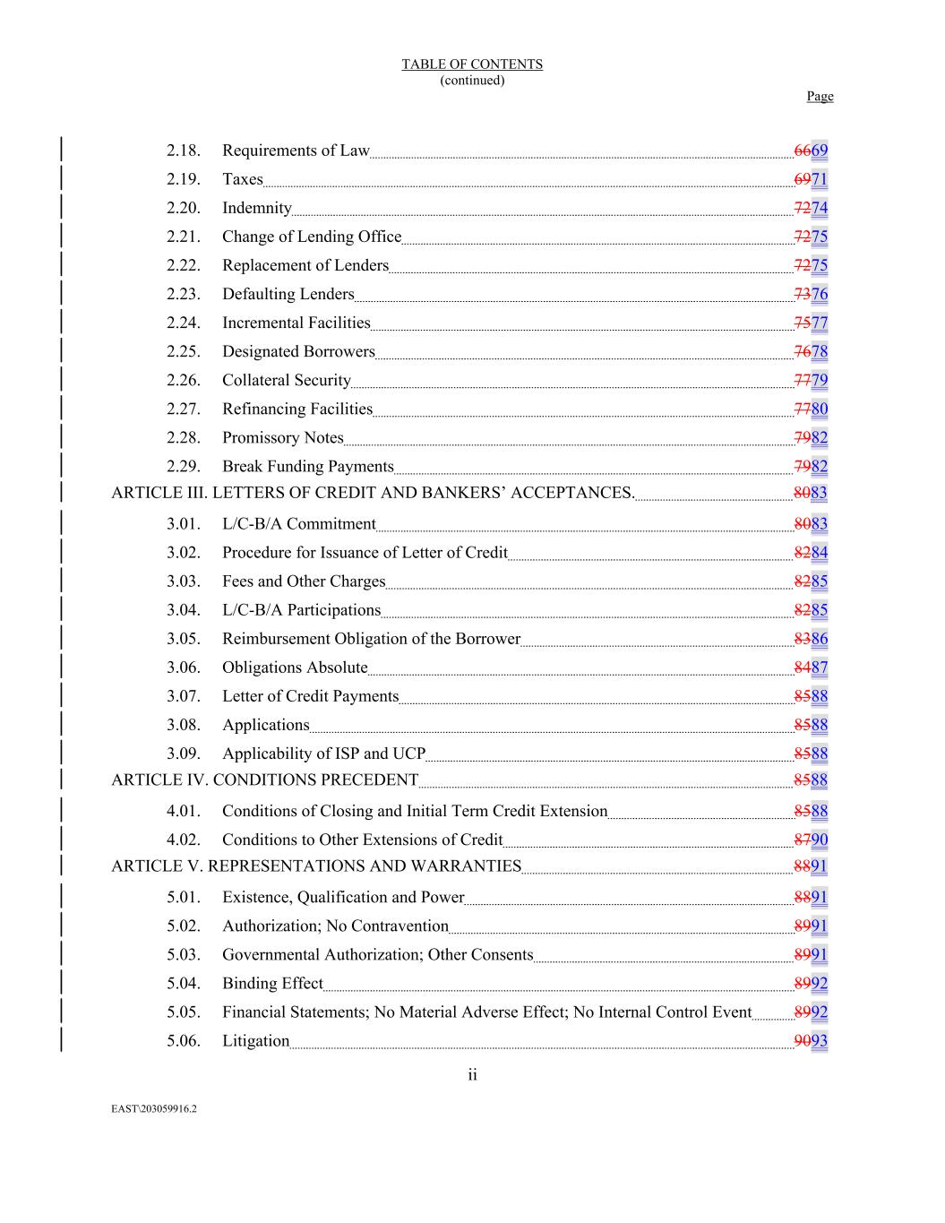 TABLE OF CONTENTS (continued) Page ii EAST\203059916.2 2.18. Requirements of Law 6669 2.19. Taxes 6971 2.20. Indemnity 7274 2.21. Change of Lending Office 7275 2.22. Replacement of Lenders 7275 2.23. Defaulting Lenders 7376 2.24. Incremental Facilities 7577 2.25. Designated Borrowers 7678 2.26. Collateral Security 7779 2.27. Refinancing Facilities 7780 2.28. Promissory Notes 7982 2.29. Break Funding Payments 7982 ARTICLE III. LETTERS OF CREDIT AND BANKERS’ ACCEPTANCES. 8083 3.01. L/C-B/A Commitment 8083 3.02. Procedure for Issuance of Letter of Credit 8284 3.03. Fees and Other Charges 8285 3.04. L/C-B/A Participations 8285 3.05. Reimbursement Obligation of the Borrower 8386 3.06. Obligations Absolute 8487 3.07. Letter of Credit Payments 8588 3.08. Applications 8588 3.09. Applicability of ISP and UCP 8588 ARTICLE IV. CONDITIONS PRECEDENT 8588 4.01. Conditions of Closing and Initial Term Credit Extension 8588 4.02. Conditions to Other Extensions of Credit 8790 ARTICLE V. REPRESENTATIONS AND WARRANTIES 8891 5.01. Existence, Qualification and Power 8891 5.02. Authorization; No Contravention 8991 5.03. Governmental Authorization; Other Consents 8991 5.04. Binding Effect 8992 5.05. Financial Statements; No Material Adverse Effect; No Internal Control Event 8992 5.06. Litigation 9093