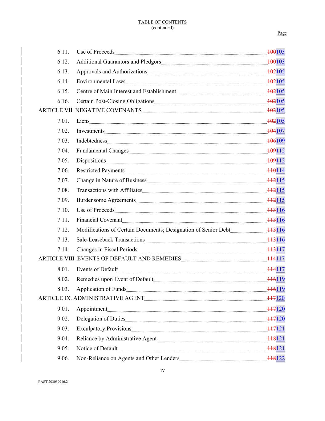 TABLE OF CONTENTS (continued) Page iv EAST\203059916.2 6.11. Use of Proceeds 100103 6.12. Additional Guarantors and Pledgors 100103 6.13. Approvals and Authorizations 102105 6.14. Environmental Laws 102105 6.15. Centre of Main Interest and Establishment 102105 6.16. Certain Post-Closing Obligations 102105 ARTICLE VII. NEGATIVE COVENANTS 102105 7.01. Liens 102105 7.02. Investments 104107 7.03. Indebtedness 106109 7.04. Fundamental Changes 109112 7.05. Dispositions 109112 7.06. Restricted Payments 110114 7.07. Change in Nature of Business 112115 7.08. Transactions with Affiliates 112115 7.09. Burdensome Agreements 112115 7.10. Use of Proceeds 113116 7.11. Financial Covenant 113116 7.12. Modifications of Certain Documents; Designation of Senior Debt 113116 7.13. Sale-Leaseback Transactions 113116 7.14. Changes in Fiscal Periods 113117 ARTICLE VIII. EVENTS OF DEFAULT AND REMEDIES 114117 8.01. Events of Default 114117 8.02. Remedies upon Event of Default 116119 8.03. Application of Funds 116119 ARTICLE IX. ADMINISTRATIVE AGENT 117120 9.01. Appointment 117120 9.02. Delegation of Duties 117120 9.03. Exculpatory Provisions 117121 9.04. Reliance by Administrative Agent 118121 9.05. Notice of Default 118121 9.06. Non-Reliance on Agents and Other Lenders 118122