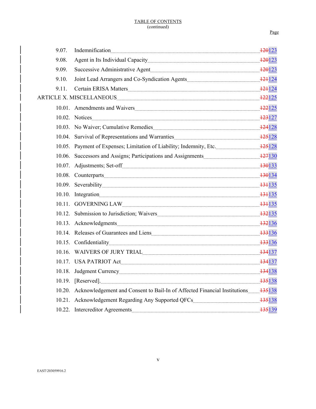 TABLE OF CONTENTS (continued) Page v EAST\203059916.2 9.07. Indemnification 120123 9.08. Agent in Its Individual Capacity 120123 9.09. Successive Administrative Agent 120123 9.10. Joint Lead Arrangers and Co-Syndication Agents 121124 9.11. Certain ERISA Matters 121124 ARTICLE X. MISCELLANEOUS 122125 10.01. Amendments and Waivers 122125 10.02. Notices 123127 10.03. No Waiver; Cumulative Remedies 124128 10.04. Survival of Representations and Warranties 125128 10.05. Payment of Expenses; Limitation of Liability; Indemnity, Etc. 125128 10.06. Successors and Assigns; Participations and Assignments 127130 10.07. Adjustments; Set-off 130133 10.08. Counterparts 130134 10.09. Severability 131135 10.10. Integration 131135 10.11. GOVERNING LAW 131135 10.12. Submission to Jurisdiction; Waivers 132135 10.13. Acknowledgments 132136 10.14. Releases of Guarantees and Liens 133136 10.15. Confidentiality 133136 10.16. WAIVERS OF JURY TRIAL 134137 10.17. USA PATRIOT Act 134137 10.18. Judgment Currency 134138 10.19. [Reserved]. 135138 10.20. Acknowledgement and Consent to Bail-In of Affected Financial Institutions 135138 10.21. Acknowledgement Regarding Any Supported QFCs 135138 10.22. Intercreditor Agreements 135139
