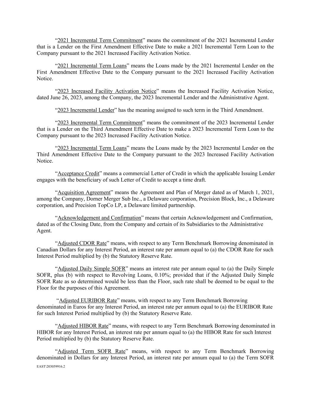 “2021 Incremental Term Commitment” means the commitment of the 2021 Incremental Lender that is a Lender on the First Amendment Effective Date to make a 2021 Incremental Term Loan to the Company pursuant to the 2021 Increased Facility Activation Notice. “2021 Incremental Term Loans” means the Loans made by the 2021 Incremental Lender on the First Amendment Effective Date to the Company pursuant to the 2021 Increased Facility Activation Notice. “2023 Increased Facility Activation Notice” means the Increased Facility Activation Notice, dated June 26, 2023, among the Company, the 2023 Incremental Lender and the Administrative Agent. “2023 Incremental Lender” has the meaning assigned to such term in the Third Amendment. “2023 Incremental Term Commitment” means the commitment of the 2023 Incremental Lender that is a Lender on the Third Amendment Effective Date to make a 2023 Incremental Term Loan to the Company pursuant to the 2023 Increased Facility Activation Notice. “2023 Incremental Term Loans” means the Loans made by the 2023 Incremental Lender on the Third Amendment Effective Date to the Company pursuant to the 2023 Increased Facility Activation Notice. “Acceptance Credit” means a commercial Letter of Credit in which the applicable Issuing Lender engages with the beneficiary of such Letter of Credit to accept a time draft. “Acquisition Agreement” means the Agreement and Plan of Merger dated as of March 1, 2021, among the Company, Dorner Merger Sub Inc., a Delaware corporation, Precision Block, Inc., a Delaware corporation, and Precision TopCo LP, a Delaware limited partnership. “Acknowledgement and Confirmation” means that certain Acknowledgement and Confirmation, dated as of the Closing Date, from the Company and certain of its Subsidiaries to the Administrative Agent. “Adjusted CDOR Rate” means, with respect to any Term Benchmark Borrowing denominated in Canadian Dollars for any Interest Period, an interest rate per annum equal to (a) the CDOR Rate for such Interest Period multiplied by (b) the Statutory Reserve Rate. “Adjusted Daily Simple SOFR” means an interest rate per annum equal to (a) the Daily Simple SOFR, plus (b) with respect to Revolving Loans, 0.10%; provided that if the Adjusted Daily Simple SOFR Rate as so determined would be less than the Floor, such rate shall be deemed to be equal to the Floor for the purposes of this Agreement. “Adjusted EURIBOR Rate” means, with respect to any Term Benchmark Borrowing denominated in Euros for any Interest Period, an interest rate per annum equal to (a) the EURIBOR Rate for such Interest Period multiplied by (b) the Statutory Reserve Rate. “Adjusted HIBOR Rate” means, with respect to any Term Benchmark Borrowing denominated in HIBOR for any Interest Period, an interest rate per annum equal to (a) the HIBOR Rate for such Interest Period multiplied by (b) the Statutory Reserve Rate. “Adjusted Term SOFR Rate” means, with respect to any Term Benchmark Borrowing denominated in Dollars for any Interest Period, an interest rate per annum equal to (a) the Term SOFR EAST\203059916.2