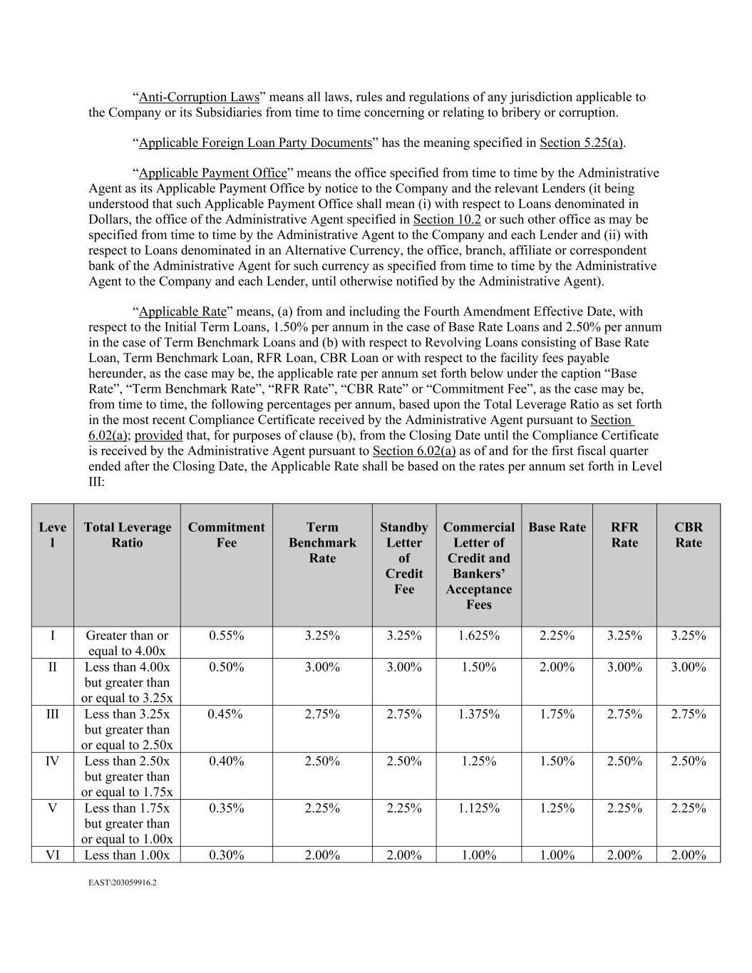 EAST\203059916.2 2.75% Commercial Letter of Credit and Bankers’ Acceptance Fees 2.75% 1.625% 1.375% 1.75% 2.25% 2.75% Base Rate 2.75% 3.25% Total Leverage Ratio IV 3.25% Less than 2.50x but greater than or equal to 1.75x RFR Rate 0.40% 2.50% “Anti-Corruption Laws” means all laws, rules and regulations of any jurisdiction applicable to the Company or its Subsidiaries from time to time concerning or relating to bribery or corruption. “Applicable Foreign Loan Party Documents” has the meaning specified in Section 5.25(a). “Applicable Payment Office” means the office specified from time to time by the Administrative Agent as its Applicable Payment Office by notice to the Company and the relevant Lenders (it being understood that such Applicable Payment Office shall mean (i) with respect to Loans denominated in Dollars, the office of the Administrative Agent specified in Section 10.2 or such other office as may be specified from time to time by the Administrative Agent to the Company and each Lender and (ii) with respect to Loans denominated in an Alternative Currency, the office, branch, affiliate or correspondent bank of the Administrative Agent for such currency as specified from time to time by the Administrative Agent to the Company and each Lender, until otherwise notified by the Administrative Agent). “Applicable Rate” means, (a) from and including the Fourth Amendment Effective Date, with respect to the Initial Term Loans, 1.50% per annum in the case of Base Rate Loans and 2.50% per annum in the case of Term Benchmark Loans and (b) with respect to Revolving Loans consisting of Base Rate Loan, Term Benchmark Loan, RFR Loan, CBR Loan or with respect to the facility fees payable hereunder, as the case may be, the applicable rate per annum set forth below under the caption “Base Rate”, “Term Benchmark Rate”, “RFR Rate”, “CBR Rate” or “Commitment Fee”, as the case may be, from time to time, the following percentages per annum, based upon the Total Leverage Ratio as set forth in the most recent Compliance Certificate received by the Administrative Agent pursuant to Section 6.02(a); provided that, for purposes of clause (b), from the Closing Date until the Compliance Certificate is received by the Administrative Agent pursuant to Section 6.02(a) as of and for the first fiscal quarter ended after the Closing Date, the Applicable Rate shall be based on the rates per annum set forth in Level III: 2.50% II 1.25% CBR Rate 1.50% Less than 4.00x but greater than or equal to 3.25x 2.50% Commitment Fee 2.50% 0.50% V 3.00% Less than 1.75x but greater than or equal to 1.00x 0.35% 3.00% 2.25% I 2.25% 1.50% 1.125% Term Benchmark Rate 1.25% 2.00% 2.25% Greater than or equal to 4.00x 2.25% 3.00% VI 3.00% Less than 1.00x 0.55% 0.30% 2.00% Standby Letter of Credit Fee 2.00% III 1.00% 3.25% 1.00% Less than 3.25x but greater than or equal to 2.50x 2.00% Leve l 2.00% 0.45% 3.25%
