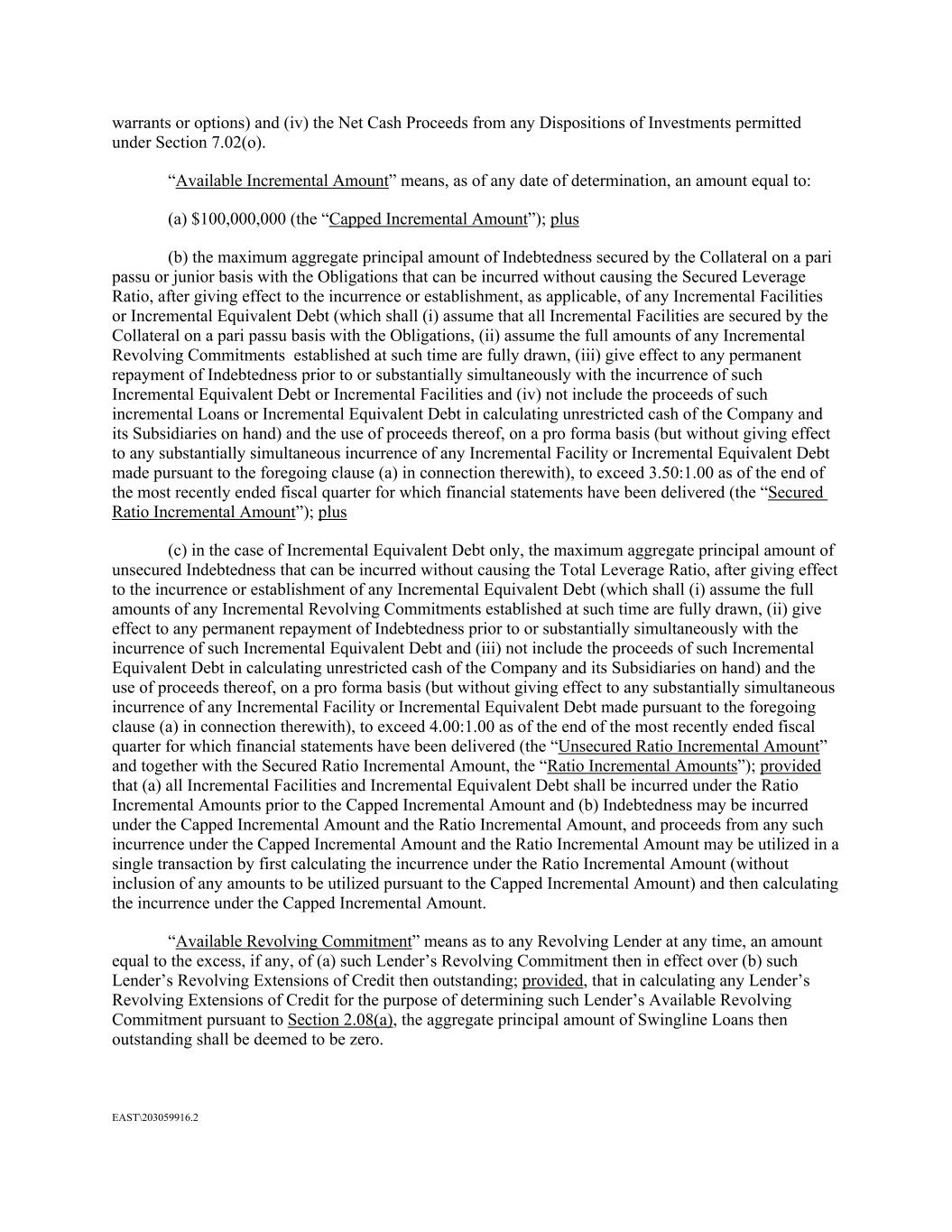 warrants or options) and (iv) the Net Cash Proceeds from any Dispositions of Investments permitted under Section 7.02(o). “Available Incremental Amount” means, as of any date of determination, an amount equal to: (a) $100,000,000 (the “Capped Incremental Amount”); plus (b) the maximum aggregate principal amount of Indebtedness secured by the Collateral on a pari passu or junior basis with the Obligations that can be incurred without causing the Secured Leverage Ratio, after giving effect to the incurrence or establishment, as applicable, of any Incremental Facilities or Incremental Equivalent Debt (which shall (i) assume that all Incremental Facilities are secured by the Collateral on a pari passu basis with the Obligations, (ii) assume the full amounts of any Incremental Revolving Commitments established at such time are fully drawn, (iii) give effect to any permanent repayment of Indebtedness prior to or substantially simultaneously with the incurrence of such Incremental Equivalent Debt or Incremental Facilities and (iv) not include the proceeds of such incremental Loans or Incremental Equivalent Debt in calculating unrestricted cash of the Company and its Subsidiaries on hand) and the use of proceeds thereof, on a pro forma basis (but without giving effect to any substantially simultaneous incurrence of any Incremental Facility or Incremental Equivalent Debt made pursuant to the foregoing clause (a) in connection therewith), to exceed 3.50:1.00 as of the end of the most recently ended fiscal quarter for which financial statements have been delivered (the “Secured Ratio Incremental Amount”); plus (c) in the case of Incremental Equivalent Debt only, the maximum aggregate principal amount of unsecured Indebtedness that can be incurred without causing the Total Leverage Ratio, after giving effect to the incurrence or establishment of any Incremental Equivalent Debt (which shall (i) assume the full amounts of any Incremental Revolving Commitments established at such time are fully drawn, (ii) give effect to any permanent repayment of Indebtedness prior to or substantially simultaneously with the incurrence of such Incremental Equivalent Debt and (iii) not include the proceeds of such Incremental Equivalent Debt in calculating unrestricted cash of the Company and its Subsidiaries on hand) and the use of proceeds thereof, on a pro forma basis (but without giving effect to any substantially simultaneous incurrence of any Incremental Facility or Incremental Equivalent Debt made pursuant to the foregoing clause (a) in connection therewith), to exceed 4.00:1.00 as of the end of the most recently ended fiscal quarter for which financial statements have been delivered (the “Unsecured Ratio Incremental Amount” and together with the Secured Ratio Incremental Amount, the “Ratio Incremental Amounts”); provided that (a) all Incremental Facilities and Incremental Equivalent Debt shall be incurred under the Ratio Incremental Amounts prior to the Capped Incremental Amount and (b) Indebtedness may be incurred under the Capped Incremental Amount and the Ratio Incremental Amount, and proceeds from any such incurrence under the Capped Incremental Amount and the Ratio Incremental Amount may be utilized in a single transaction by first calculating the incurrence under the Ratio Incremental Amount (without inclusion of any amounts to be utilized pursuant to the Capped Incremental Amount) and then calculating the incurrence under the Capped Incremental Amount. “Available Revolving Commitment” means as to any Revolving Lender at any time, an amount equal to the excess, if any, of (a) such Lender’s Revolving Commitment then in effect over (b) such Lender’s Revolving Extensions of Credit then outstanding; provided, that in calculating any Lender’s Revolving Extensions of Credit for the purpose of determining such Lender’s Available Revolving Commitment pursuant to Section 2.08(a), the aggregate principal amount of Swingline Loans then outstanding shall be deemed to be zero. EAST\203059916.2