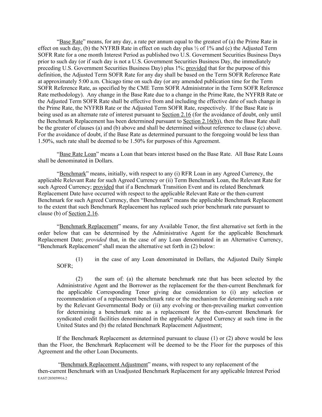 “Base Rate” means, for any day, a rate per annum equal to the greatest of (a) the Prime Rate in effect on such day, (b) the NYFRB Rate in effect on such day plus ½ of 1% and (c) the Adjusted Term SOFR Rate for a one month Interest Period as published two U.S. Government Securities Business Days prior to such day (or if such day is not a U.S. Government Securities Business Day, the immediately preceding U.S. Government Securities Business Day) plus 1%; provided that for the purpose of this definition, the Adjusted Term SOFR Rate for any day shall be based on the Term SOFR Reference Rate at approximately 5:00 a.m. Chicago time on such day (or any amended publication time for the Term SOFR Reference Rate, as specified by the CME Term SOFR Administrator in the Term SOFR Reference Rate methodology). Any change in the Base Rate due to a change in the Prime Rate, the NYFRB Rate or the Adjusted Term SOFR Rate shall be effective from and including the effective date of such change in the Prime Rate, the NYFRB Rate or the Adjusted Term SOFR Rate, respectively. If the Base Rate is being used as an alternate rate of interest pursuant to Section 2.16 (for the avoidance of doubt, only until the Benchmark Replacement has been determined pursuant to Section 2.16(b)), then the Base Rate shall be the greater of clauses (a) and (b) above and shall be determined without reference to clause (c) above. For the avoidance of doubt, if the Base Rate as determined pursuant to the foregoing would be less than 1.50%, such rate shall be deemed to be 1.50% for purposes of this Agreement. “Base Rate Loan” means a Loan that bears interest based on the Base Rate. All Base Rate Loans shall be denominated in Dollars. “Benchmark” means, initially, with respect to any (i) RFR Loan in any Agreed Currency, the applicable Relevant Rate for such Agreed Currency or (ii) Term Benchmark Loan, the Relevant Rate for such Agreed Currency; provided that if a Benchmark Transition Event and its related Benchmark Replacement Date have occurred with respect to the applicable Relevant Rate or the then-current Benchmark for such Agreed Currency, then “Benchmark” means the applicable Benchmark Replacement to the extent that such Benchmark Replacement has replaced such prior benchmark rate pursuant to clause (b) of Section 2.16. “Benchmark Replacement” means, for any Available Tenor, the first alternative set forth in the order below that can be determined by the Administrative Agent for the applicable Benchmark Replacement Date; provided that, in the case of any Loan denominated in an Alternative Currency, “Benchmark Replacement” shall mean the alternative set forth in (2) below: (1) in the case of any Loan denominated in Dollars, the Adjusted Daily Simple SOFR; (2) the sum of: (a) the alternate benchmark rate that has been selected by the Administrative Agent and the Borrower as the replacement for the then-current Benchmark for the applicable Corresponding Tenor giving due consideration to (i) any selection or recommendation of a replacement benchmark rate or the mechanism for determining such a rate by the Relevant Governmental Body or (ii) any evolving or then-prevailing market convention for determining a benchmark rate as a replacement for the then-current Benchmark for syndicated credit facilities denominated in the applicable Agreed Currency at such time in the United States and (b) the related Benchmark Replacement Adjustment; If the Benchmark Replacement as determined pursuant to clause (1) or (2) above would be less than the Floor, the Benchmark Replacement will be deemed to be the Floor for the purposes of this Agreement and the other Loan Documents. “Benchmark Replacement Adjustment” means, with respect to any replacement of the then-current Benchmark with an Unadjusted Benchmark Replacement for any applicable Interest Period EAST\203059916.2