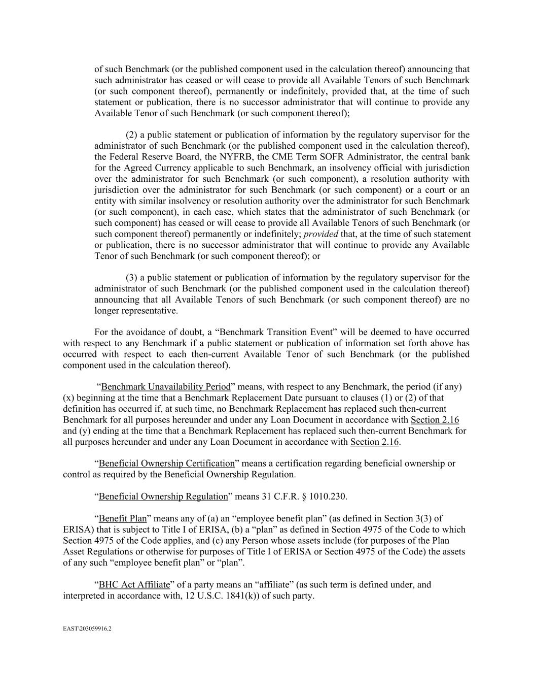 of such Benchmark (or the published component used in the calculation thereof) announcing that such administrator has ceased or will cease to provide all Available Tenors of such Benchmark (or such component thereof), permanently or indefinitely, provided that, at the time of such statement or publication, there is no successor administrator that will continue to provide any Available Tenor of such Benchmark (or such component thereof); (2) a public statement or publication of information by the regulatory supervisor for the administrator of such Benchmark (or the published component used in the calculation thereof), the Federal Reserve Board, the NYFRB, the CME Term SOFR Administrator, the central bank for the Agreed Currency applicable to such Benchmark, an insolvency official with jurisdiction over the administrator for such Benchmark (or such component), a resolution authority with jurisdiction over the administrator for such Benchmark (or such component) or a court or an entity with similar insolvency or resolution authority over the administrator for such Benchmark (or such component), in each case, which states that the administrator of such Benchmark (or such component) has ceased or will cease to provide all Available Tenors of such Benchmark (or such component thereof) permanently or indefinitely; provided that, at the time of such statement or publication, there is no successor administrator that will continue to provide any Available Tenor of such Benchmark (or such component thereof); or (3) a public statement or publication of information by the regulatory supervisor for the administrator of such Benchmark (or the published component used in the calculation thereof) announcing that all Available Tenors of such Benchmark (or such component thereof) are no longer representative. For the avoidance of doubt, a “Benchmark Transition Event” will be deemed to have occurred with respect to any Benchmark if a public statement or publication of information set forth above has occurred with respect to each then-current Available Tenor of such Benchmark (or the published component used in the calculation thereof). “Benchmark Unavailability Period” means, with respect to any Benchmark, the period (if any) (x) beginning at the time that a Benchmark Replacement Date pursuant to clauses (1) or (2) of that definition has occurred if, at such time, no Benchmark Replacement has replaced such then-current Benchmark for all purposes hereunder and under any Loan Document in accordance with Section 2.16 and (y) ending at the time that a Benchmark Replacement has replaced such then-current Benchmark for all purposes hereunder and under any Loan Document in accordance with Section 2.16. “Beneficial Ownership Certification” means a certification regarding beneficial ownership or control as required by the Beneficial Ownership Regulation. “Beneficial Ownership Regulation” means 31 C.F.R. § 1010.230. “Benefit Plan” means any of (a) an “employee benefit plan” (as defined in Section 3(3) of ERISA) that is subject to Title I of ERISA, (b) a “plan” as defined in Section 4975 of the Code to which Section 4975 of the Code applies, and (c) any Person whose assets include (for purposes of the Plan Asset Regulations or otherwise for purposes of Title I of ERISA or Section 4975 of the Code) the assets of any such “employee benefit plan” or “plan”. “BHC Act Affiliate” of a party means an “affiliate” (as such term is defined under, and interpreted in accordance with, 12 U.S.C. 1841(k)) of such party. EAST\203059916.2