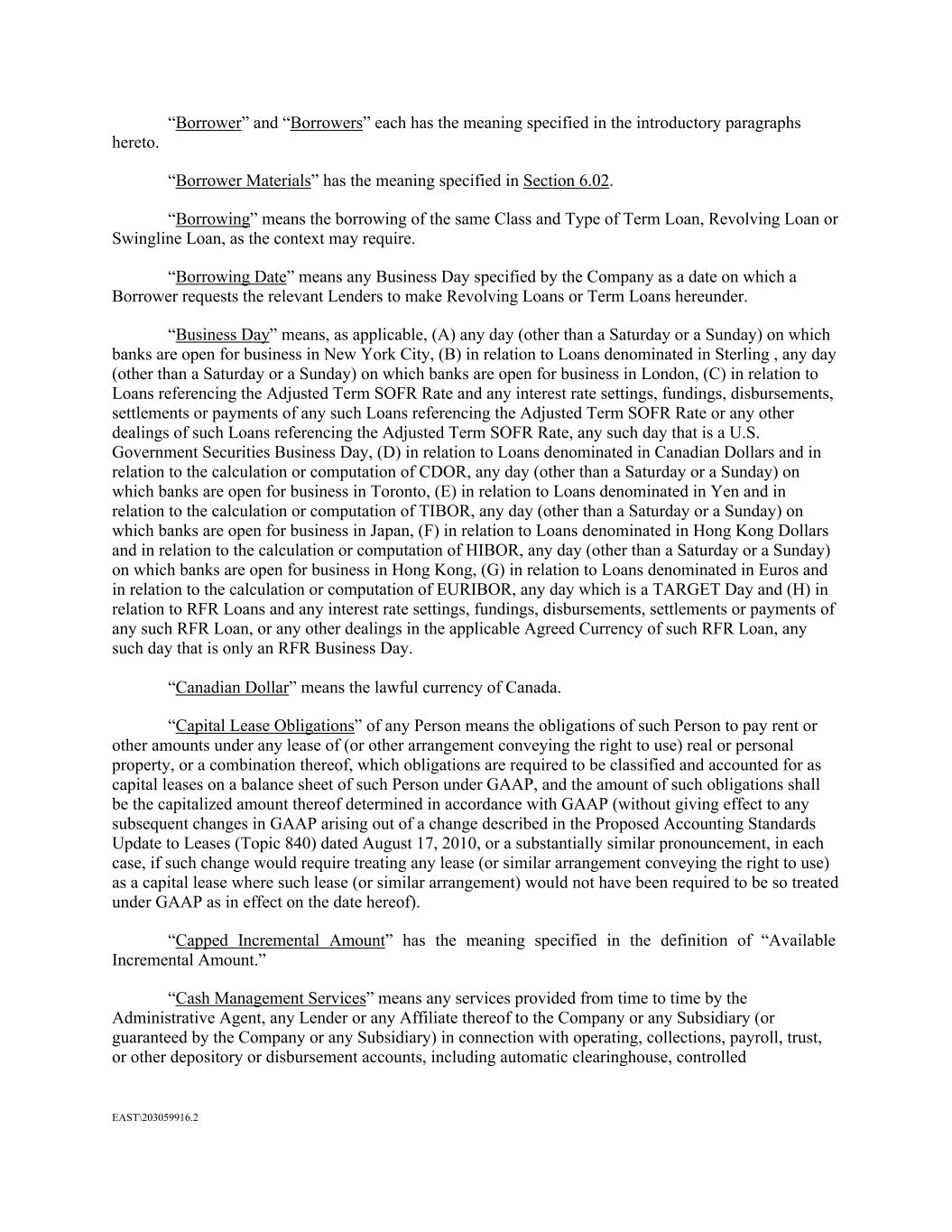 “Borrower” and “Borrowers” each has the meaning specified in the introductory paragraphs hereto. “Borrower Materials” has the meaning specified in Section 6.02. “Borrowing” means the borrowing of the same Class and Type of Term Loan, Revolving Loan or Swingline Loan, as the context may require. “Borrowing Date” means any Business Day specified by the Company as a date on which a Borrower requests the relevant Lenders to make Revolving Loans or Term Loans hereunder. “Business Day” means, as applicable, (A) any day (other than a Saturday or a Sunday) on which banks are open for business in New York City, (B) in relation to Loans denominated in Sterling , any day (other than a Saturday or a Sunday) on which banks are open for business in London, (C) in relation to Loans referencing the Adjusted Term SOFR Rate and any interest rate settings, fundings, disbursements, settlements or payments of any such Loans referencing the Adjusted Term SOFR Rate or any other dealings of such Loans referencing the Adjusted Term SOFR Rate, any such day that is a U.S. Government Securities Business Day, (D) in relation to Loans denominated in Canadian Dollars and in relation to the calculation or computation of CDOR, any day (other than a Saturday or a Sunday) on which banks are open for business in Toronto, (E) in relation to Loans denominated in Yen and in relation to the calculation or computation of TIBOR, any day (other than a Saturday or a Sunday) on which banks are open for business in Japan, (F) in relation to Loans denominated in Hong Kong Dollars and in relation to the calculation or computation of HIBOR, any day (other than a Saturday or a Sunday) on which banks are open for business in Hong Kong, (G) in relation to Loans denominated in Euros and in relation to the calculation or computation of EURIBOR, any day which is a TARGET Day and (H) in relation to RFR Loans and any interest rate settings, fundings, disbursements, settlements or payments of any such RFR Loan, or any other dealings in the applicable Agreed Currency of such RFR Loan, any such day that is only an RFR Business Day. “Canadian Dollar” means the lawful currency of Canada. “Capital Lease Obligations” of any Person means the obligations of such Person to pay rent or other amounts under any lease of (or other arrangement conveying the right to use) real or personal property, or a combination thereof, which obligations are required to be classified and accounted for as capital leases on a balance sheet of such Person under GAAP, and the amount of such obligations shall be the capitalized amount thereof determined in accordance with GAAP (without giving effect to any subsequent changes in GAAP arising out of a change described in the Proposed Accounting Standards Update to Leases (Topic 840) dated August 17, 2010, or a substantially similar pronouncement, in each case, if such change would require treating any lease (or similar arrangement conveying the right to use) as a capital lease where such lease (or similar arrangement) would not have been required to be so treated under GAAP as in effect on the date hereof). “Capped Incremental Amount” has the meaning specified in the definition of “Available Incremental Amount.” “Cash Management Services” means any services provided from time to time by the Administrative Agent, any Lender or any Affiliate thereof to the Company or any Subsidiary (or guaranteed by the Company or any Subsidiary) in connection with operating, collections, payroll, trust, or other depository or disbursement accounts, including automatic clearinghouse, controlled EAST\203059916.2
