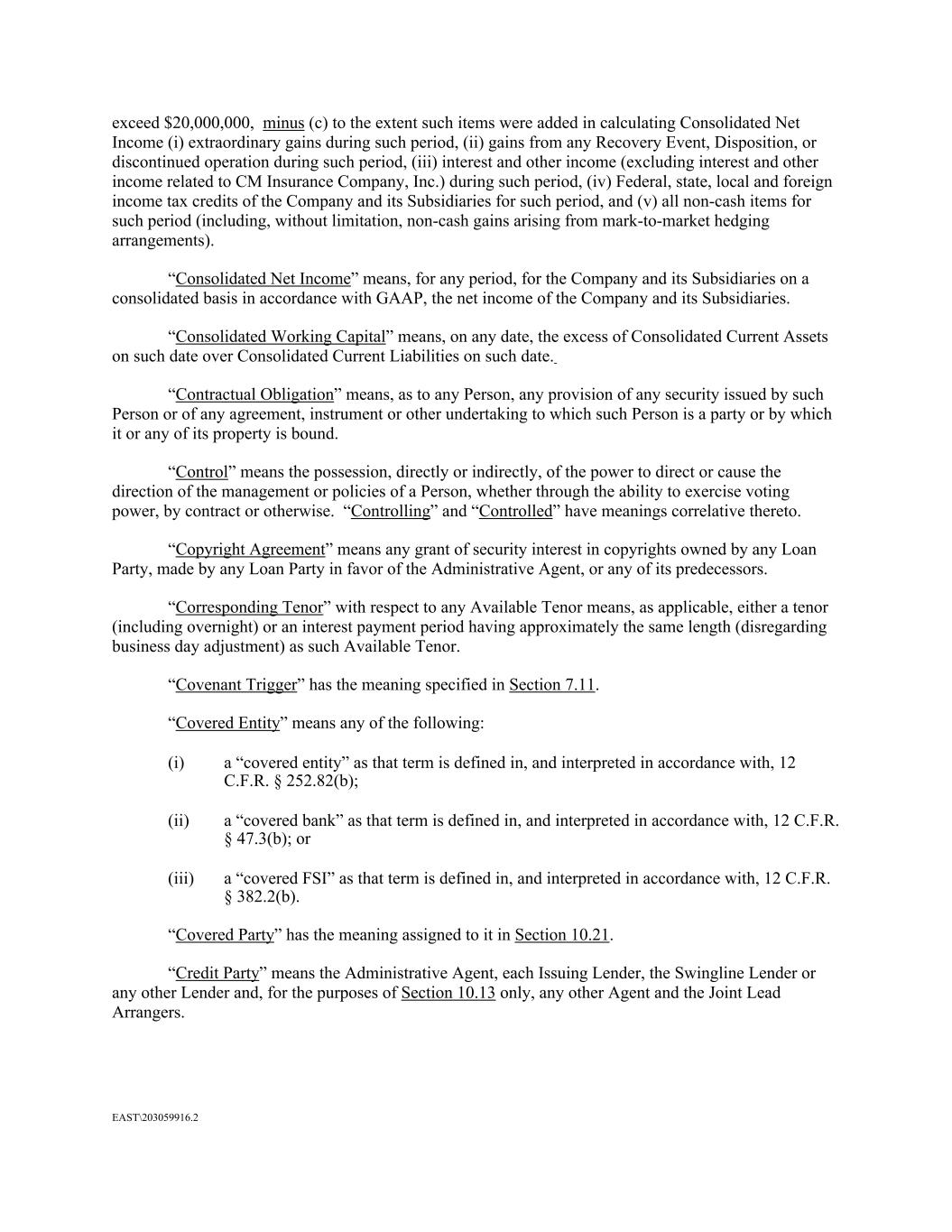 exceed $20,000,000, minus (c) to the extent such items were added in calculating Consolidated Net Income (i) extraordinary gains during such period, (ii) gains from any Recovery Event, Disposition, or discontinued operation during such period, (iii) interest and other income (excluding interest and other income related to CM Insurance Company, Inc.) during such period, (iv) Federal, state, local and foreign income tax credits of the Company and its Subsidiaries for such period, and (v) all non-cash items for such period (including, without limitation, non-cash gains arising from mark-to-market hedging arrangements). “Consolidated Net Income” means, for any period, for the Company and its Subsidiaries on a consolidated basis in accordance with GAAP, the net income of the Company and its Subsidiaries. “Consolidated Working Capital” means, on any date, the excess of Consolidated Current Assets on such date over Consolidated Current Liabilities on such date. “Contractual Obligation” means, as to any Person, any provision of any security issued by such Person or of any agreement, instrument or other undertaking to which such Person is a party or by which it or any of its property is bound. “Control” means the possession, directly or indirectly, of the power to direct or cause the direction of the management or policies of a Person, whether through the ability to exercise voting power, by contract or otherwise. “Controlling” and “Controlled” have meanings correlative thereto. “Copyright Agreement” means any grant of security interest in copyrights owned by any Loan Party, made by any Loan Party in favor of the Administrative Agent, or any of its predecessors. “Corresponding Tenor” with respect to any Available Tenor means, as applicable, either a tenor (including overnight) or an interest payment period having approximately the same length (disregarding business day adjustment) as such Available Tenor. “Covenant Trigger” has the meaning specified in Section 7.11. “Covered Entity” means any of the following: (i) a “covered entity” as that term is defined in, and interpreted in accordance with, 12 C.F.R. § 252.82(b); (ii) a “covered bank” as that term is defined in, and interpreted in accordance with, 12 C.F.R. § 47.3(b); or (iii) a “covered FSI” as that term is defined in, and interpreted in accordance with, 12 C.F.R. § 382.2(b). “Covered Party” has the meaning assigned to it in Section 10.21. “Credit Party” means the Administrative Agent, each Issuing Lender, the Swingline Lender or any other Lender and, for the purposes of Section 10.13 only, any other Agent and the Joint Lead Arrangers. EAST\203059916.2