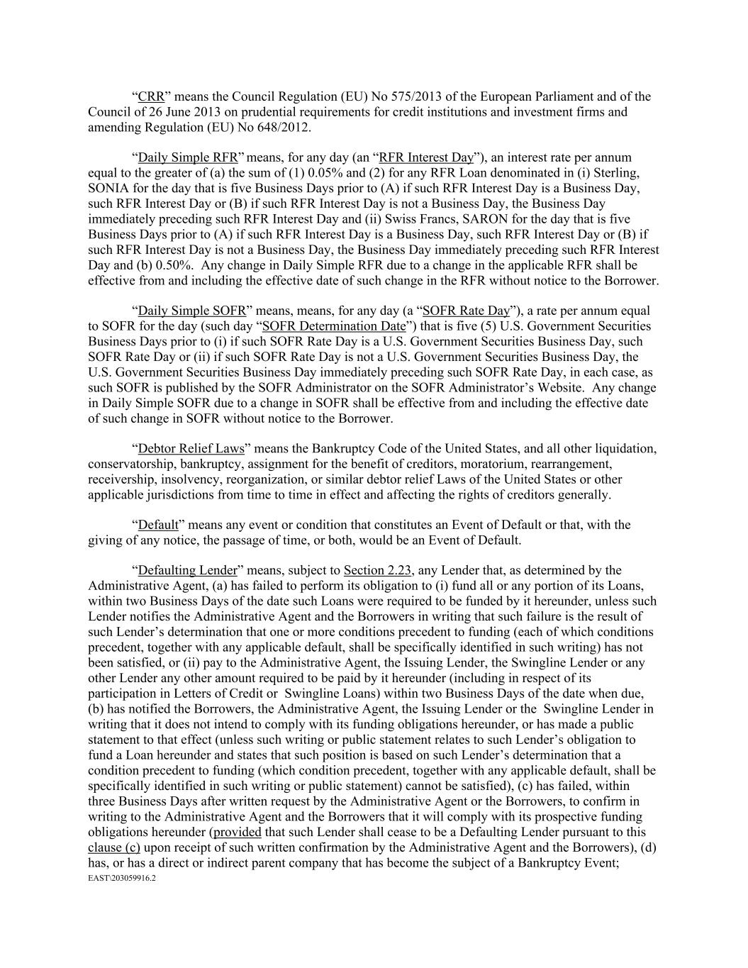 “CRR” means the Council Regulation (EU) No 575/2013 of the European Parliament and of the Council of 26 June 2013 on prudential requirements for credit institutions and investment firms and amending Regulation (EU) No 648/2012. “Daily Simple RFR” means, for any day (an “RFR Interest Day”), an interest rate per annum equal to the greater of (a) the sum of (1) 0.05% and (2) for any RFR Loan denominated in (i) Sterling, SONIA for the day that is five Business Days prior to (A) if such RFR Interest Day is a Business Day, such RFR Interest Day or (B) if such RFR Interest Day is not a Business Day, the Business Day immediately preceding such RFR Interest Day and (ii) Swiss Francs, SARON for the day that is five Business Days prior to (A) if such RFR Interest Day is a Business Day, such RFR Interest Day or (B) if such RFR Interest Day is not a Business Day, the Business Day immediately preceding such RFR Interest Day and (b) 0.50%. Any change in Daily Simple RFR due to a change in the applicable RFR shall be effective from and including the effective date of such change in the RFR without notice to the Borrower. “Daily Simple SOFR” means, means, for any day (a “SOFR Rate Day”), a rate per annum equal to SOFR for the day (such day “SOFR Determination Date”) that is five (5) U.S. Government Securities Business Days prior to (i) if such SOFR Rate Day is a U.S. Government Securities Business Day, such SOFR Rate Day or (ii) if such SOFR Rate Day is not a U.S. Government Securities Business Day, the U.S. Government Securities Business Day immediately preceding such SOFR Rate Day, in each case, as such SOFR is published by the SOFR Administrator on the SOFR Administrator’s Website. Any change in Daily Simple SOFR due to a change in SOFR shall be effective from and including the effective date of such change in SOFR without notice to the Borrower. “Debtor Relief Laws” means the Bankruptcy Code of the United States, and all other liquidation, conservatorship, bankruptcy, assignment for the benefit of creditors, moratorium, rearrangement, receivership, insolvency, reorganization, or similar debtor relief Laws of the United States or other applicable jurisdictions from time to time in effect and affecting the rights of creditors generally. “Default” means any event or condition that constitutes an Event of Default or that, with the giving of any notice, the passage of time, or both, would be an Event of Default. “Defaulting Lender” means, subject to Section 2.23, any Lender that, as determined by the Administrative Agent, (a) has failed to perform its obligation to (i) fund all or any portion of its Loans, within two Business Days of the date such Loans were required to be funded by it hereunder, unless such Lender notifies the Administrative Agent and the Borrowers in writing that such failure is the result of such Lender’s determination that one or more conditions precedent to funding (each of which conditions precedent, together with any applicable default, shall be specifically identified in such writing) has not been satisfied, or (ii) pay to the Administrative Agent, the Issuing Lender, the Swingline Lender or any other Lender any other amount required to be paid by it hereunder (including in respect of its participation in Letters of Credit or Swingline Loans) within two Business Days of the date when due, (b) has notified the Borrowers, the Administrative Agent, the Issuing Lender or the Swingline Lender in writing that it does not intend to comply with its funding obligations hereunder, or has made a public statement to that effect (unless such writing or public statement relates to such Lender’s obligation to fund a Loan hereunder and states that such position is based on such Lender’s determination that a condition precedent to funding (which condition precedent, together with any applicable default, shall be specifically identified in such writing or public statement) cannot be satisfied), (c) has failed, within three Business Days after written request by the Administrative Agent or the Borrowers, to confirm in writing to the Administrative Agent and the Borrowers that it will comply with its prospective funding obligations hereunder (provided that such Lender shall cease to be a Defaulting Lender pursuant to this clause (c) upon receipt of such written confirmation by the Administrative Agent and the Borrowers), (d) has, or has a direct or indirect parent company that has become the subject of a Bankruptcy Event; EAST\203059916.2