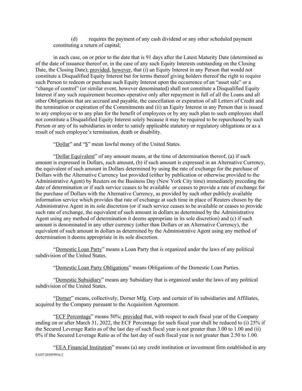 (d) requires the payment of any cash dividend or any other scheduled payment constituting a return of capital; in each case, on or prior to the date that is 91 days after the Latest Maturity Date (determined as of the date of issuance thereof or, in the case of any such Equity Interests outstanding on the Closing Date, the Closing Date); provided, however, that (i) an Equity Interest in any Person that would not constitute a Disqualified Equity Interest but for terms thereof giving holders thereof the right to require such Person to redeem or purchase such Equity Interest upon the occurrence of an “asset sale” or a “change of control” (or similar event, however denominated) shall not constitute a Disqualified Equity Interest if any such requirement becomes operative only after repayment in full of all the Loans and all other Obligations that are accrued and payable, the cancellation or expiration of all Letters of Credit and the termination or expiration of the Commitments and (ii) an Equity Interest in any Person that is issued to any employee or to any plan for the benefit of employees or by any such plan to such employees shall not constitute a Disqualified Equity Interest solely because it may be required to be repurchased by such Person or any of its subsidiaries in order to satisfy applicable statutory or regulatory obligations or as a result of such employee’s termination, death or disability. “Dollar” and “$” mean lawful money of the United States. “Dollar Equivalent” of any amount means, at the time of determination thereof, (a) if such amount is expressed in Dollars, such amount, (b) if such amount is expressed in an Alternative Currency, the equivalent of such amount in Dollars determined by using the rate of exchange for the purchase of Dollars with the Alternative Currency last provided (either by publication or otherwise provided to the Administrative Agent) by Reuters on the Business Day (New York City time) immediately preceding the date of determination or if such service ceases to be available or ceases to provide a rate of exchange for the purchase of Dollars with the Alternative Currency, as provided by such other publicly available information service which provides that rate of exchange at such time in place of Reuters chosen by the Administrative Agent in its sole discretion (or if such service ceases to be available or ceases to provide such rate of exchange, the equivalent of such amount in dollars as determined by the Administrative Agent using any method of determination it deems appropriate in its sole discretion) and (c) if such amount is denominated in any other currency (other than Dollars or an Alternative Currency), the equivalent of such amount in dollars as determined by the Administrative Agent using any method of determination it deems appropriate in its sole discretion. “Domestic Loan Party” means a Loan Party that is organized under the laws of any political subdivision of the United States. “Domestic Loan Party Obligations” means Obligations of the Domestic Loan Parties. “Domestic Subsidiary” means any Subsidiary that is organized under the laws of any political subdivision of the United States. “Dorner” means, collectively, Dorner Mfg. Corp. and certain of its subsidiaries and Affiliates, acquired by the Company pursuant to the Acquisition Agreement. “ECF Percentage” means 50%; provided that, with respect to each fiscal year of the Company ending on or after March 31, 2022, the ECF Percentage for such fiscal year shall be reduced to (i) 25% if the Secured Leverage Ratio as of the last day of such fiscal year is not greater than 3.00 to 1.00 and (ii) 0% if the Secured Leverage Ratio as of the last day of such fiscal year is not greater than 2.50 to 1.00. “EEA Financial Institution” means (a) any credit institution or investment firm established in any EAST\203059916.2