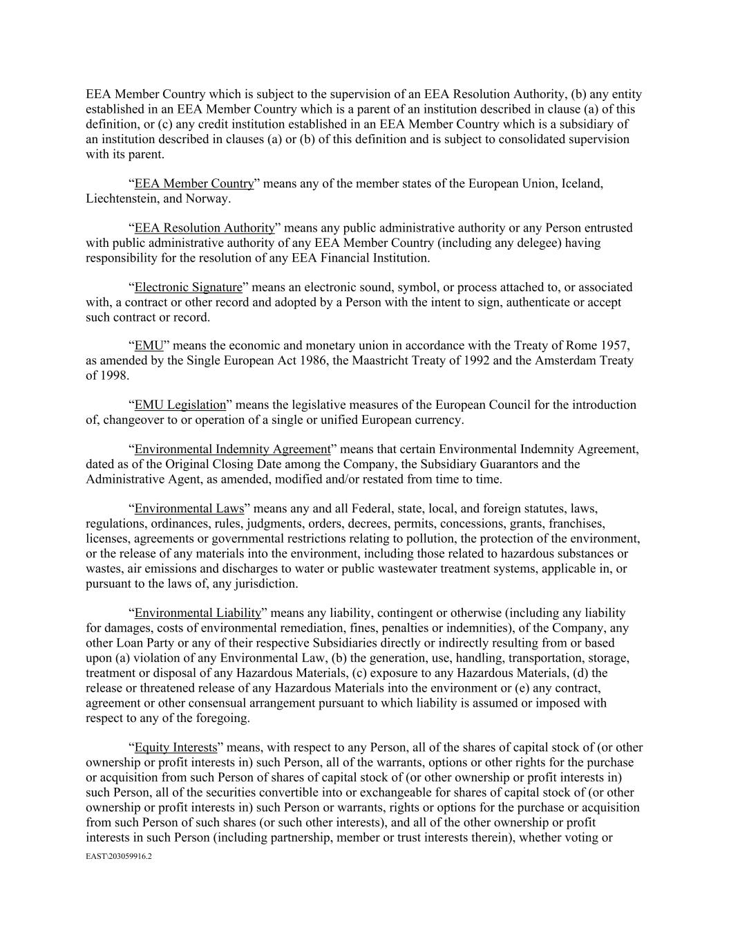 EEA Member Country which is subject to the supervision of an EEA Resolution Authority, (b) any entity established in an EEA Member Country which is a parent of an institution described in clause (a) of this definition, or (c) any credit institution established in an EEA Member Country which is a subsidiary of an institution described in clauses (a) or (b) of this definition and is subject to consolidated supervision with its parent. “EEA Member Country” means any of the member states of the European Union, Iceland, Liechtenstein, and Norway. “EEA Resolution Authority” means any public administrative authority or any Person entrusted with public administrative authority of any EEA Member Country (including any delegee) having responsibility for the resolution of any EEA Financial Institution. “Electronic Signature” means an electronic sound, symbol, or process attached to, or associated with, a contract or other record and adopted by a Person with the intent to sign, authenticate or accept such contract or record. “EMU” means the economic and monetary union in accordance with the Treaty of Rome 1957, as amended by the Single European Act 1986, the Maastricht Treaty of 1992 and the Amsterdam Treaty of 1998. “EMU Legislation” means the legislative measures of the European Council for the introduction of, changeover to or operation of a single or unified European currency. “Environmental Indemnity Agreement” means that certain Environmental Indemnity Agreement, dated as of the Original Closing Date among the Company, the Subsidiary Guarantors and the Administrative Agent, as amended, modified and/or restated from time to time. “Environmental Laws” means any and all Federal, state, local, and foreign statutes, laws, regulations, ordinances, rules, judgments, orders, decrees, permits, concessions, grants, franchises, licenses, agreements or governmental restrictions relating to pollution, the protection of the environment, or the release of any materials into the environment, including those related to hazardous substances or wastes, air emissions and discharges to water or public wastewater treatment systems, applicable in, or pursuant to the laws of, any jurisdiction. “Environmental Liability” means any liability, contingent or otherwise (including any liability for damages, costs of environmental remediation, fines, penalties or indemnities), of the Company, any other Loan Party or any of their respective Subsidiaries directly or indirectly resulting from or based upon (a) violation of any Environmental Law, (b) the generation, use, handling, transportation, storage, treatment or disposal of any Hazardous Materials, (c) exposure to any Hazardous Materials, (d) the release or threatened release of any Hazardous Materials into the environment or (e) any contract, agreement or other consensual arrangement pursuant to which liability is assumed or imposed with respect to any of the foregoing. “Equity Interests” means, with respect to any Person, all of the shares of capital stock of (or other ownership or profit interests in) such Person, all of the warrants, options or other rights for the purchase or acquisition from such Person of shares of capital stock of (or other ownership or profit interests in) such Person, all of the securities convertible into or exchangeable for shares of capital stock of (or other ownership or profit interests in) such Person or warrants, rights or options for the purchase or acquisition from such Person of such shares (or such other interests), and all of the other ownership or profit interests in such Person (including partnership, member or trust interests therein), whether voting or EAST\203059916.2