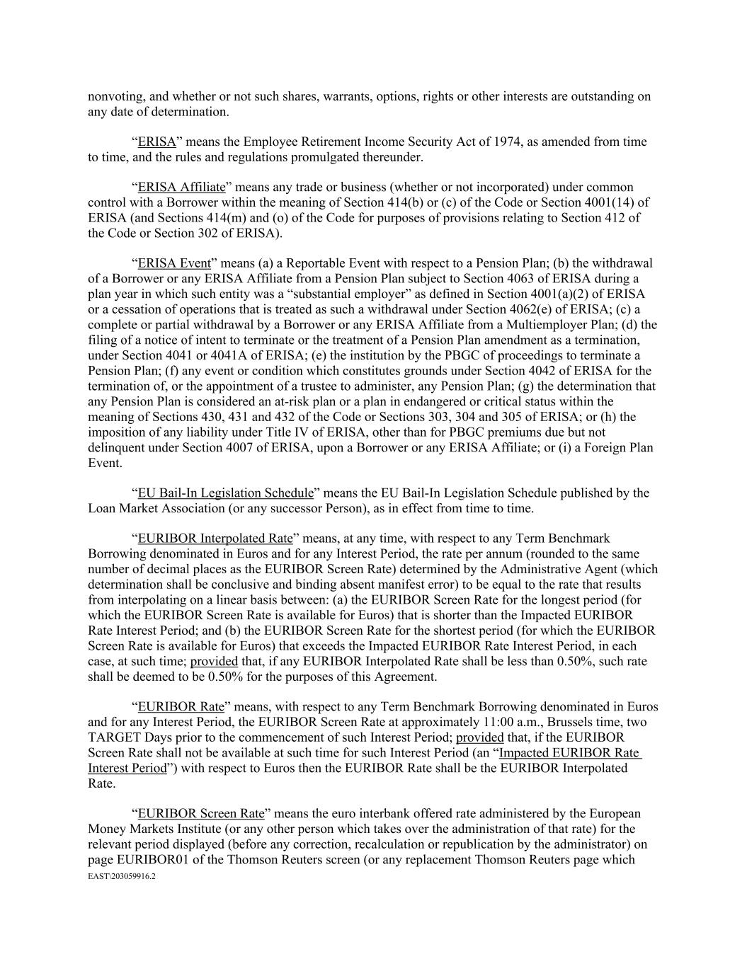 nonvoting, and whether or not such shares, warrants, options, rights or other interests are outstanding on any date of determination. “ERISA” means the Employee Retirement Income Security Act of 1974, as amended from time to time, and the rules and regulations promulgated thereunder. “ERISA Affiliate” means any trade or business (whether or not incorporated) under common control with a Borrower within the meaning of Section 414(b) or (c) of the Code or Section 4001(14) of ERISA (and Sections 414(m) and (o) of the Code for purposes of provisions relating to Section 412 of the Code or Section 302 of ERISA). “ERISA Event” means (a) a Reportable Event with respect to a Pension Plan; (b) the withdrawal of a Borrower or any ERISA Affiliate from a Pension Plan subject to Section 4063 of ERISA during a plan year in which such entity was a “substantial employer” as defined in Section 4001(a)(2) of ERISA or a cessation of operations that is treated as such a withdrawal under Section 4062(e) of ERISA; (c) a complete or partial withdrawal by a Borrower or any ERISA Affiliate from a Multiemployer Plan; (d) the filing of a notice of intent to terminate or the treatment of a Pension Plan amendment as a termination, under Section 4041 or 4041A of ERISA; (e) the institution by the PBGC of proceedings to terminate a Pension Plan; (f) any event or condition which constitutes grounds under Section 4042 of ERISA for the termination of, or the appointment of a trustee to administer, any Pension Plan; (g) the determination that any Pension Plan is considered an at-risk plan or a plan in endangered or critical status within the meaning of Sections 430, 431 and 432 of the Code or Sections 303, 304 and 305 of ERISA; or (h) the imposition of any liability under Title IV of ERISA, other than for PBGC premiums due but not delinquent under Section 4007 of ERISA, upon a Borrower or any ERISA Affiliate; or (i) a Foreign Plan Event. “EU Bail-In Legislation Schedule” means the EU Bail-In Legislation Schedule published by the Loan Market Association (or any successor Person), as in effect from time to time. “EURIBOR Interpolated Rate” means, at any time, with respect to any Term Benchmark Borrowing denominated in Euros and for any Interest Period, the rate per annum (rounded to the same number of decimal places as the EURIBOR Screen Rate) determined by the Administrative Agent (which determination shall be conclusive and binding absent manifest error) to be equal to the rate that results from interpolating on a linear basis between: (a) the EURIBOR Screen Rate for the longest period (for which the EURIBOR Screen Rate is available for Euros) that is shorter than the Impacted EURIBOR Rate Interest Period; and (b) the EURIBOR Screen Rate for the shortest period (for which the EURIBOR Screen Rate is available for Euros) that exceeds the Impacted EURIBOR Rate Interest Period, in each case, at such time; provided that, if any EURIBOR Interpolated Rate shall be less than 0.50%, such rate shall be deemed to be 0.50% for the purposes of this Agreement. “EURIBOR Rate” means, with respect to any Term Benchmark Borrowing denominated in Euros and for any Interest Period, the EURIBOR Screen Rate at approximately 11:00 a.m., Brussels time, two TARGET Days prior to the commencement of such Interest Period; provided that, if the EURIBOR Screen Rate shall not be available at such time for such Interest Period (an “Impacted EURIBOR Rate Interest Period”) with respect to Euros then the EURIBOR Rate shall be the EURIBOR Interpolated Rate. “EURIBOR Screen Rate” means the euro interbank offered rate administered by the European Money Markets Institute (or any other person which takes over the administration of that rate) for the relevant period displayed (before any correction, recalculation or republication by the administrator) on page EURIBOR01 of the Thomson Reuters screen (or any replacement Thomson Reuters page which EAST\203059916.2