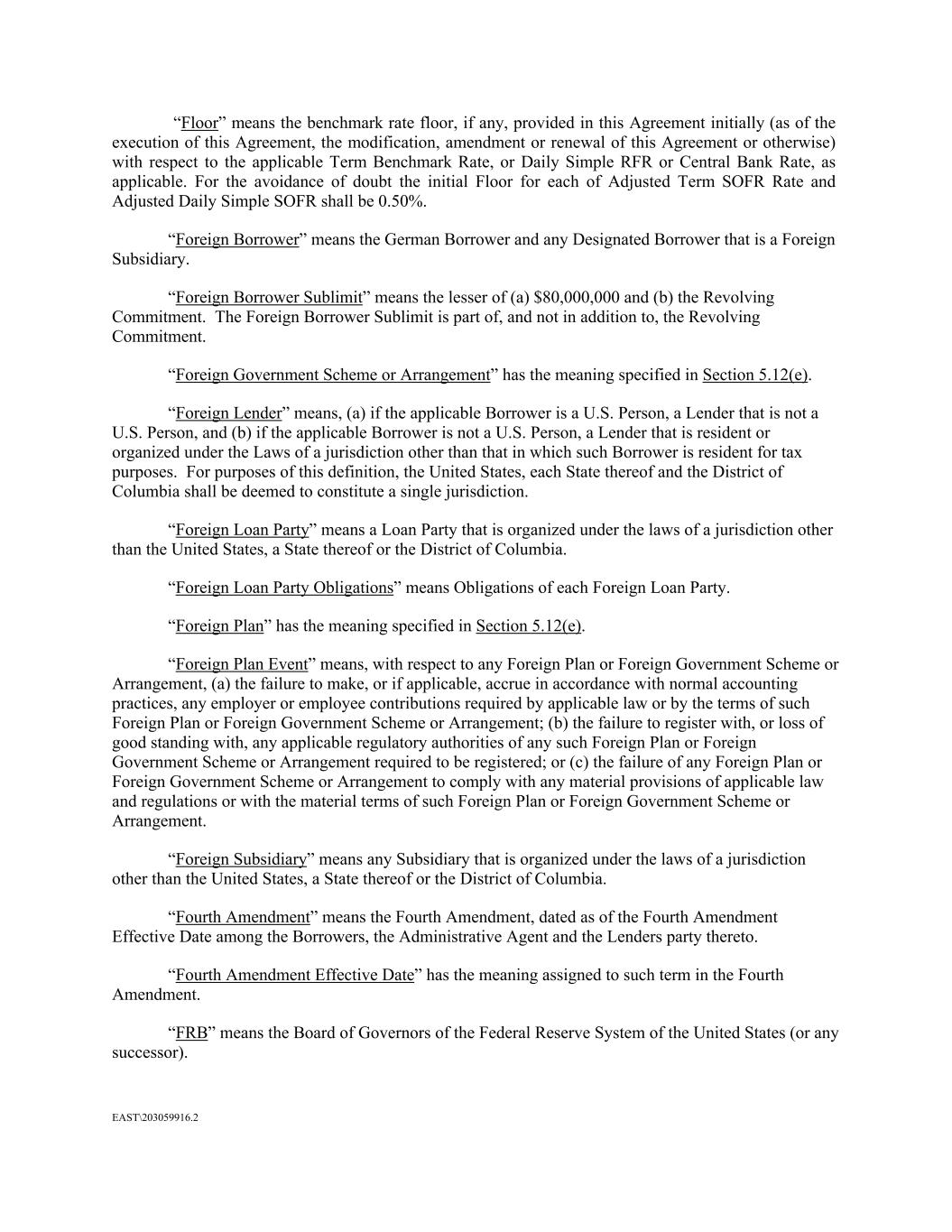 “Floor” means the benchmark rate floor, if any, provided in this Agreement initially (as of the execution of this Agreement, the modification, amendment or renewal of this Agreement or otherwise) with respect to the applicable Term Benchmark Rate, or Daily Simple RFR or Central Bank Rate, as applicable. For the avoidance of doubt the initial Floor for each of Adjusted Term SOFR Rate and Adjusted Daily Simple SOFR shall be 0.50%. “Foreign Borrower” means the German Borrower and any Designated Borrower that is a Foreign Subsidiary. “Foreign Borrower Sublimit” means the lesser of (a) $80,000,000 and (b) the Revolving Commitment. The Foreign Borrower Sublimit is part of, and not in addition to, the Revolving Commitment. “Foreign Government Scheme or Arrangement” has the meaning specified in Section 5.12(e). “Foreign Lender” means, (a) if the applicable Borrower is a U.S. Person, a Lender that is not a U.S. Person, and (b) if the applicable Borrower is not a U.S. Person, a Lender that is resident or organized under the Laws of a jurisdiction other than that in which such Borrower is resident for tax purposes. For purposes of this definition, the United States, each State thereof and the District of Columbia shall be deemed to constitute a single jurisdiction. “Foreign Loan Party” means a Loan Party that is organized under the laws of a jurisdiction other than the United States, a State thereof or the District of Columbia. “Foreign Loan Party Obligations” means Obligations of each Foreign Loan Party. “Foreign Plan” has the meaning specified in Section 5.12(e). “Foreign Plan Event” means, with respect to any Foreign Plan or Foreign Government Scheme or Arrangement, (a) the failure to make, or if applicable, accrue in accordance with normal accounting practices, any employer or employee contributions required by applicable law or by the terms of such Foreign Plan or Foreign Government Scheme or Arrangement; (b) the failure to register with, or loss of good standing with, any applicable regulatory authorities of any such Foreign Plan or Foreign Government Scheme or Arrangement required to be registered; or (c) the failure of any Foreign Plan or Foreign Government Scheme or Arrangement to comply with any material provisions of applicable law and regulations or with the material terms of such Foreign Plan or Foreign Government Scheme or Arrangement. “Foreign Subsidiary” means any Subsidiary that is organized under the laws of a jurisdiction other than the United States, a State thereof or the District of Columbia. “Fourth Amendment” means the Fourth Amendment, dated as of the Fourth Amendment Effective Date among the Borrowers, the Administrative Agent and the Lenders party thereto. “Fourth Amendment Effective Date” has the meaning assigned to such term in the Fourth Amendment. “FRB” means the Board of Governors of the Federal Reserve System of the United States (or any successor). EAST\203059916.2
