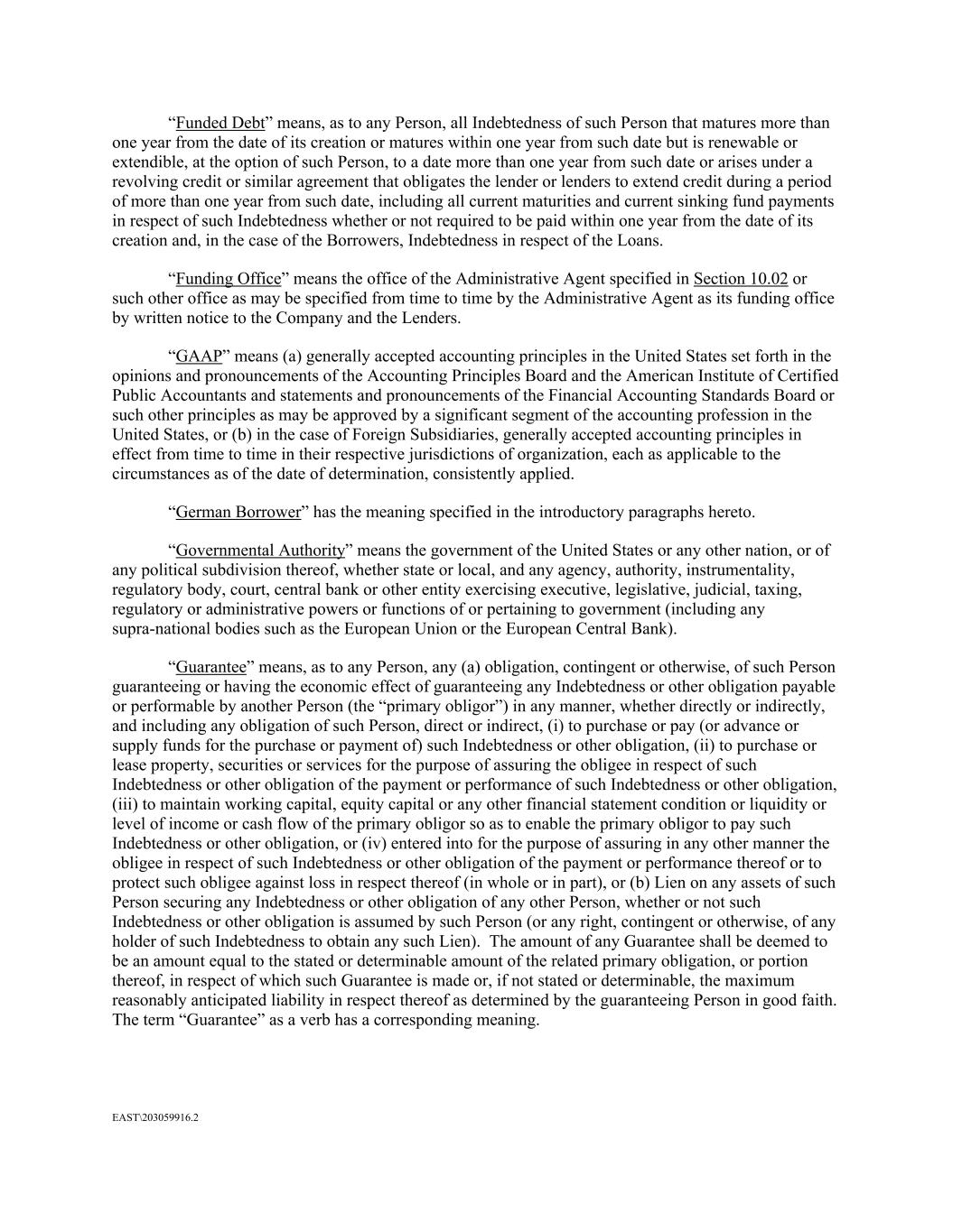 “Funded Debt” means, as to any Person, all Indebtedness of such Person that matures more than one year from the date of its creation or matures within one year from such date but is renewable or extendible, at the option of such Person, to a date more than one year from such date or arises under a revolving credit or similar agreement that obligates the lender or lenders to extend credit during a period of more than one year from such date, including all current maturities and current sinking fund payments in respect of such Indebtedness whether or not required to be paid within one year from the date of its creation and, in the case of the Borrowers, Indebtedness in respect of the Loans. “Funding Office” means the office of the Administrative Agent specified in Section 10.02 or such other office as may be specified from time to time by the Administrative Agent as its funding office by written notice to the Company and the Lenders. “GAAP” means (a) generally accepted accounting principles in the United States set forth in the opinions and pronouncements of the Accounting Principles Board and the American Institute of Certified Public Accountants and statements and pronouncements of the Financial Accounting Standards Board or such other principles as may be approved by a significant segment of the accounting profession in the United States, or (b) in the case of Foreign Subsidiaries, generally accepted accounting principles in effect from time to time in their respective jurisdictions of organization, each as applicable to the circumstances as of the date of determination, consistently applied. “German Borrower” has the meaning specified in the introductory paragraphs hereto. “Governmental Authority” means the government of the United States or any other nation, or of any political subdivision thereof, whether state or local, and any agency, authority, instrumentality, regulatory body, court, central bank or other entity exercising executive, legislative, judicial, taxing, regulatory or administrative powers or functions of or pertaining to government (including any supra-national bodies such as the European Union or the European Central Bank). “Guarantee” means, as to any Person, any (a) obligation, contingent or otherwise, of such Person guaranteeing or having the economic effect of guaranteeing any Indebtedness or other obligation payable or performable by another Person (the “primary obligor”) in any manner, whether directly or indirectly, and including any obligation of such Person, direct or indirect, (i) to purchase or pay (or advance or supply funds for the purchase or payment of) such Indebtedness or other obligation, (ii) to purchase or lease property, securities or services for the purpose of assuring the obligee in respect of such Indebtedness or other obligation of the payment or performance of such Indebtedness or other obligation, (iii) to maintain working capital, equity capital or any other financial statement condition or liquidity or level of income or cash flow of the primary obligor so as to enable the primary obligor to pay such Indebtedness or other obligation, or (iv) entered into for the purpose of assuring in any other manner the obligee in respect of such Indebtedness or other obligation of the payment or performance thereof or to protect such obligee against loss in respect thereof (in whole or in part), or (b) Lien on any assets of such Person securing any Indebtedness or other obligation of any other Person, whether or not such Indebtedness or other obligation is assumed by such Person (or any right, contingent or otherwise, of any holder of such Indebtedness to obtain any such Lien). The amount of any Guarantee shall be deemed to be an amount equal to the stated or determinable amount of the related primary obligation, or portion thereof, in respect of which such Guarantee is made or, if not stated or determinable, the maximum reasonably anticipated liability in respect thereof as determined by the guaranteeing Person in good faith. The term “Guarantee” as a verb has a corresponding meaning. EAST\203059916.2