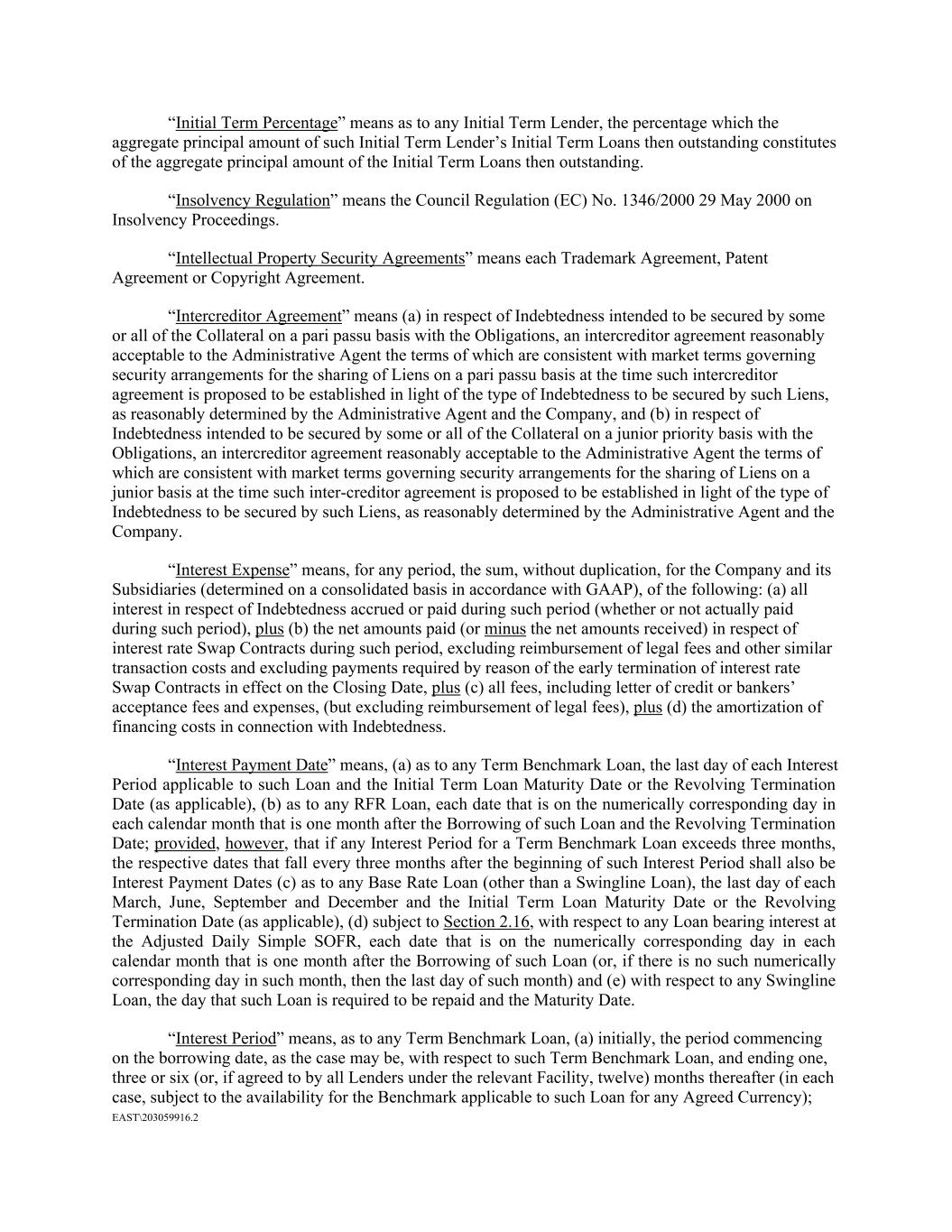 “Initial Term Percentage” means as to any Initial Term Lender, the percentage which the aggregate principal amount of such Initial Term Lender’s Initial Term Loans then outstanding constitutes of the aggregate principal amount of the Initial Term Loans then outstanding. “Insolvency Regulation” means the Council Regulation (EC) No. 1346/2000 29 May 2000 on Insolvency Proceedings. “Intellectual Property Security Agreements” means each Trademark Agreement, Patent Agreement or Copyright Agreement. “Intercreditor Agreement” means (a) in respect of Indebtedness intended to be secured by some or all of the Collateral on a pari passu basis with the Obligations, an intercreditor agreement reasonably acceptable to the Administrative Agent the terms of which are consistent with market terms governing security arrangements for the sharing of Liens on a pari passu basis at the time such intercreditor agreement is proposed to be established in light of the type of Indebtedness to be secured by such Liens, as reasonably determined by the Administrative Agent and the Company, and (b) in respect of Indebtedness intended to be secured by some or all of the Collateral on a junior priority basis with the Obligations, an intercreditor agreement reasonably acceptable to the Administrative Agent the terms of which are consistent with market terms governing security arrangements for the sharing of Liens on a junior basis at the time such inter-creditor agreement is proposed to be established in light of the type of Indebtedness to be secured by such Liens, as reasonably determined by the Administrative Agent and the Company. “Interest Expense” means, for any period, the sum, without duplication, for the Company and its Subsidiaries (determined on a consolidated basis in accordance with GAAP), of the following: (a) all interest in respect of Indebtedness accrued or paid during such period (whether or not actually paid during such period), plus (b) the net amounts paid (or minus the net amounts received) in respect of interest rate Swap Contracts during such period, excluding reimbursement of legal fees and other similar transaction costs and excluding payments required by reason of the early termination of interest rate Swap Contracts in effect on the Closing Date, plus (c) all fees, including letter of credit or bankers’ acceptance fees and expenses, (but excluding reimbursement of legal fees), plus (d) the amortization of financing costs in connection with Indebtedness. “Interest Payment Date” means, (a) as to any Term Benchmark Loan, the last day of each Interest Period applicable to such Loan and the Initial Term Loan Maturity Date or the Revolving Termination Date (as applicable), (b) as to any RFR Loan, each date that is on the numerically corresponding day in each calendar month that is one month after the Borrowing of such Loan and the Revolving Termination Date; provided, however, that if any Interest Period for a Term Benchmark Loan exceeds three months, the respective dates that fall every three months after the beginning of such Interest Period shall also be Interest Payment Dates (c) as to any Base Rate Loan (other than a Swingline Loan), the last day of each March, June, September and December and the Initial Term Loan Maturity Date or the Revolving Termination Date (as applicable), (d) subject to Section 2.16, with respect to any Loan bearing interest at the Adjusted Daily Simple SOFR, each date that is on the numerically corresponding day in each calendar month that is one month after the Borrowing of such Loan (or, if there is no such numerically corresponding day in such month, then the last day of such month) and (e) with respect to any Swingline Loan, the day that such Loan is required to be repaid and the Maturity Date. “Interest Period” means, as to any Term Benchmark Loan, (a) initially, the period commencing on the borrowing date, as the case may be, with respect to such Term Benchmark Loan, and ending one, three or six (or, if agreed to by all Lenders under the relevant Facility, twelve) months thereafter (in each case, subject to the availability for the Benchmark applicable to such Loan for any Agreed Currency); EAST\203059916.2