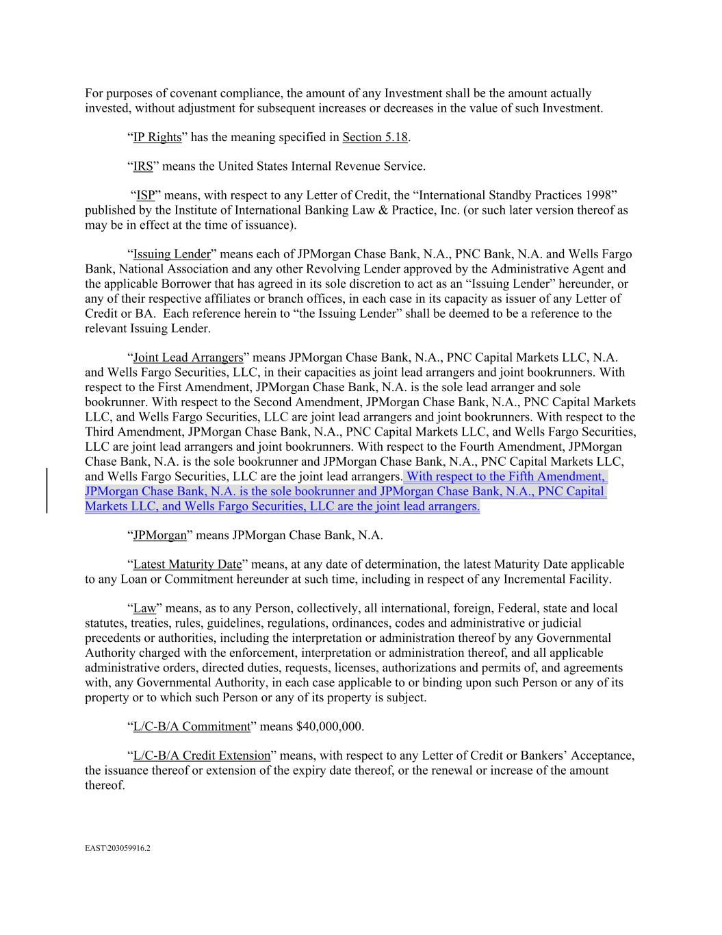 For purposes of covenant compliance, the amount of any Investment shall be the amount actually invested, without adjustment for subsequent increases or decreases in the value of such Investment. “IP Rights” has the meaning specified in Section 5.18. “IRS” means the United States Internal Revenue Service. “ISP” means, with respect to any Letter of Credit, the “International Standby Practices 1998” published by the Institute of International Banking Law & Practice, Inc. (or such later version thereof as may be in effect at the time of issuance). “Issuing Lender” means each of JPMorgan Chase Bank, N.A., PNC Bank, N.A. and Wells Fargo Bank, National Association and any other Revolving Lender approved by the Administrative Agent and the applicable Borrower that has agreed in its sole discretion to act as an “Issuing Lender” hereunder, or any of their respective affiliates or branch offices, in each case in its capacity as issuer of any Letter of Credit or BA. Each reference herein to “the Issuing Lender” shall be deemed to be a reference to the relevant Issuing Lender. “Joint Lead Arrangers” means JPMorgan Chase Bank, N.A., PNC Capital Markets LLC, N.A. and Wells Fargo Securities, LLC, in their capacities as joint lead arrangers and joint bookrunners. With respect to the First Amendment, JPMorgan Chase Bank, N.A. is the sole lead arranger and sole bookrunner. With respect to the Second Amendment, JPMorgan Chase Bank, N.A., PNC Capital Markets LLC, and Wells Fargo Securities, LLC are joint lead arrangers and joint bookrunners. With respect to the Third Amendment, JPMorgan Chase Bank, N.A., PNC Capital Markets LLC, and Wells Fargo Securities, LLC are joint lead arrangers and joint bookrunners. With respect to the Fourth Amendment, JPMorgan Chase Bank, N.A. is the sole bookrunner and JPMorgan Chase Bank, N.A., PNC Capital Markets LLC, and Wells Fargo Securities, LLC are the joint lead arrangers. With respect to the Fifth Amendment, JPMorgan Chase Bank, N.A. is the sole bookrunner and JPMorgan Chase Bank, N.A., PNC Capital Markets LLC, and Wells Fargo Securities, LLC are the joint lead arrangers. “JPMorgan” means JPMorgan Chase Bank, N.A. “Latest Maturity Date” means, at any date of determination, the latest Maturity Date applicable to any Loan or Commitment hereunder at such time, including in respect of any Incremental Facility. “Law” means, as to any Person, collectively, all international, foreign, Federal, state and local statutes, treaties, rules, guidelines, regulations, ordinances, codes and administrative or judicial precedents or authorities, including the interpretation or administration thereof by any Governmental Authority charged with the enforcement, interpretation or administration thereof, and all applicable administrative orders, directed duties, requests, licenses, authorizations and permits of, and agreements with, any Governmental Authority, in each case applicable to or binding upon such Person or any of its property or to which such Person or any of its property is subject. “L/C-B/A Commitment” means $40,000,000. “L/C-B/A Credit Extension” means, with respect to any Letter of Credit or Bankers’ Acceptance, the issuance thereof or extension of the expiry date thereof, or the renewal or increase of the amount thereof. EAST\203059916.2