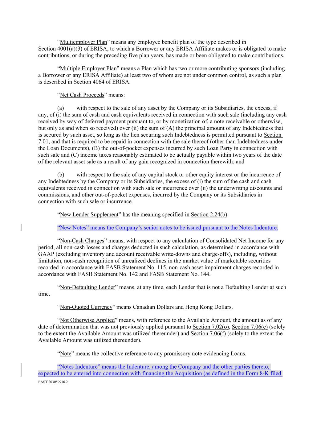 “Multiemployer Plan” means any employee benefit plan of the type described in Section 4001(a)(3) of ERISA, to which a Borrower or any ERISA Affiliate makes or is obligated to make contributions, or during the preceding five plan years, has made or been obligated to make contributions. “Multiple Employer Plan” means a Plan which has two or more contributing sponsors (including a Borrower or any ERISA Affiliate) at least two of whom are not under common control, as such a plan is described in Section 4064 of ERISA. “Net Cash Proceeds” means: (a) with respect to the sale of any asset by the Company or its Subsidiaries, the excess, if any, of (i) the sum of cash and cash equivalents received in connection with such sale (including any cash received by way of deferred payment pursuant to, or by monetization of, a note receivable or otherwise, but only as and when so received) over (ii) the sum of (A) the principal amount of any Indebtedness that is secured by such asset, so long as the lien securing such Indebtedness is permitted pursuant to Section 7.01, and that is required to be repaid in connection with the sale thereof (other than Indebtedness under the Loan Documents), (B) the out-of-pocket expenses incurred by such Loan Party in connection with such sale and (C) income taxes reasonably estimated to be actually payable within two years of the date of the relevant asset sale as a result of any gain recognized in connection therewith; and (b) with respect to the sale of any capital stock or other equity interest or the incurrence of any Indebtedness by the Company or its Subsidiaries, the excess of (i) the sum of the cash and cash equivalents received in connection with such sale or incurrence over (ii) the underwriting discounts and commissions, and other out-of-pocket expenses, incurred by the Company or its Subsidiaries in connection with such sale or incurrence. “New Lender Supplement” has the meaning specified in Section 2.24(b). “New Notes” means the Company’s senior notes to be issued pursuant to the Notes Indenture. “Non-Cash Charges” means, with respect to any calculation of Consolidated Net Income for any period, all non-cash losses and charges deducted in such calculation, as determined in accordance with GAAP (excluding inventory and account receivable write-downs and charge-offs), including, without limitation, non-cash recognition of unrealized declines in the market value of marketable securities recorded in accordance with FASB Statement No. 115, non-cash asset impairment charges recorded in accordance with FASB Statement No. 142 and FASB Statement No. 144. “Non-Defaulting Lender” means, at any time, each Lender that is not a Defaulting Lender at such time. “Non-Quoted Currency” means Canadian Dollars and Hong Kong Dollars. “Not Otherwise Applied” means, with reference to the Available Amount, the amount as of any date of determination that was not previously applied pursuant to Section 7.02(o), Section 7.06(e) (solely to the extent the Available Amount was utilized thereunder) and Section 7.06(f) (solely to the extent the Available Amount was utilized thereunder). “Note” means the collective reference to any promissory note evidencing Loans. “Notes Indenture” means the Indenture, among the Company and the other parties thereto, expected to be entered into connection with financing the Acquisition (as defined in the Form 8-K filed EAST\203059916.2