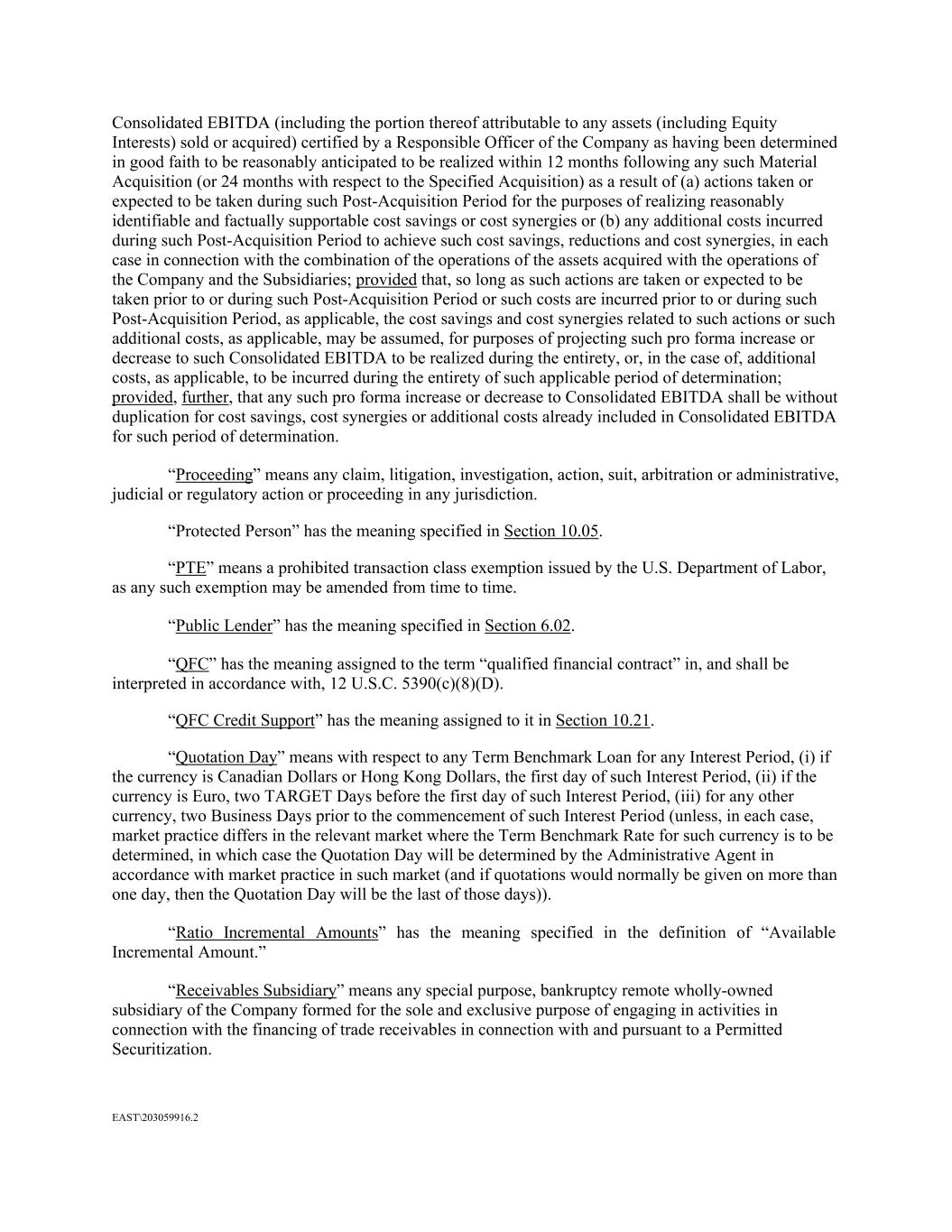 Consolidated EBITDA (including the portion thereof attributable to any assets (including Equity Interests) sold or acquired) certified by a Responsible Officer of the Company as having been determined in good faith to be reasonably anticipated to be realized within 12 months following any such Material Acquisition (or 24 months with respect to the Specified Acquisition) as a result of (a) actions taken or expected to be taken during such Post-Acquisition Period for the purposes of realizing reasonably identifiable and factually supportable cost savings or cost synergies or (b) any additional costs incurred during such Post-Acquisition Period to achieve such cost savings, reductions and cost synergies, in each case in connection with the combination of the operations of the assets acquired with the operations of the Company and the Subsidiaries; provided that, so long as such actions are taken or expected to be taken prior to or during such Post-Acquisition Period or such costs are incurred prior to or during such Post-Acquisition Period, as applicable, the cost savings and cost synergies related to such actions or such additional costs, as applicable, may be assumed, for purposes of projecting such pro forma increase or decrease to such Consolidated EBITDA to be realized during the entirety, or, in the case of, additional costs, as applicable, to be incurred during the entirety of such applicable period of determination; provided, further, that any such pro forma increase or decrease to Consolidated EBITDA shall be without duplication for cost savings, cost synergies or additional costs already included in Consolidated EBITDA for such period of determination. “Proceeding” means any claim, litigation, investigation, action, suit, arbitration or administrative, judicial or regulatory action or proceeding in any jurisdiction. “Protected Person” has the meaning specified in Section 10.05. “PTE” means a prohibited transaction class exemption issued by the U.S. Department of Labor, as any such exemption may be amended from time to time. “Public Lender” has the meaning specified in Section 6.02. “QFC” has the meaning assigned to the term “qualified financial contract” in, and shall be interpreted in accordance with, 12 U.S.C. 5390(c)(8)(D). “QFC Credit Support” has the meaning assigned to it in Section 10.21. “Quotation Day” means with respect to any Term Benchmark Loan for any Interest Period, (i) if the currency is Canadian Dollars or Hong Kong Dollars, the first day of such Interest Period, (ii) if the currency is Euro, two TARGET Days before the first day of such Interest Period, (iii) for any other currency, two Business Days prior to the commencement of such Interest Period (unless, in each case, market practice differs in the relevant market where the Term Benchmark Rate for such currency is to be determined, in which case the Quotation Day will be determined by the Administrative Agent in accordance with market practice in such market (and if quotations would normally be given on more than one day, then the Quotation Day will be the last of those days)). “Ratio Incremental Amounts” has the meaning specified in the definition of “Available Incremental Amount.” “Receivables Subsidiary” means any special purpose, bankruptcy remote wholly-owned subsidiary of the Company formed for the sole and exclusive purpose of engaging in activities in connection with the financing of trade receivables in connection with and pursuant to a Permitted Securitization. EAST\203059916.2