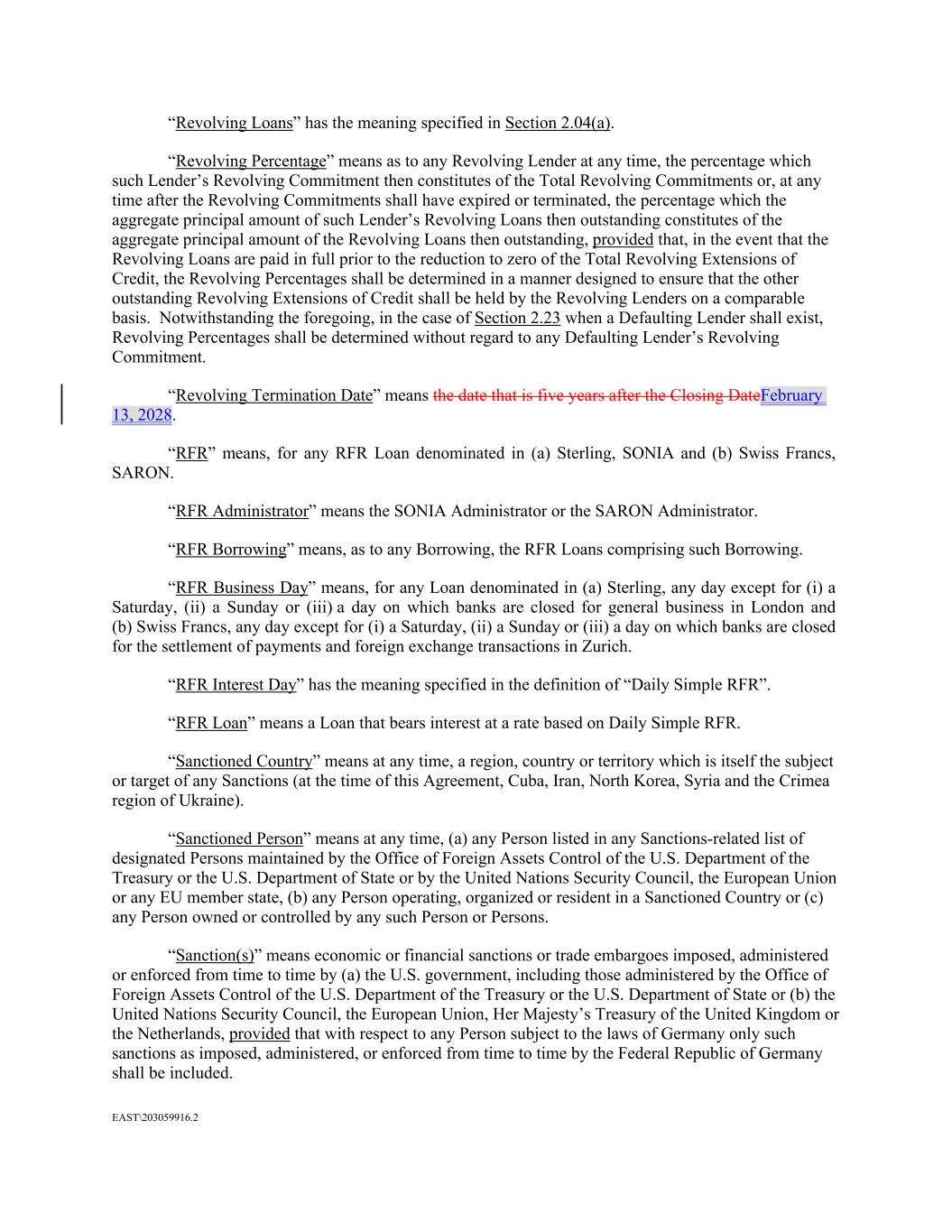 “Revolving Loans” has the meaning specified in Section 2.04(a). “Revolving Percentage” means as to any Revolving Lender at any time, the percentage which such Lender’s Revolving Commitment then constitutes of the Total Revolving Commitments or, at any time after the Revolving Commitments shall have expired or terminated, the percentage which the aggregate principal amount of such Lender’s Revolving Loans then outstanding constitutes of the aggregate principal amount of the Revolving Loans then outstanding, provided that, in the event that the Revolving Loans are paid in full prior to the reduction to zero of the Total Revolving Extensions of Credit, the Revolving Percentages shall be determined in a manner designed to ensure that the other outstanding Revolving Extensions of Credit shall be held by the Revolving Lenders on a comparable basis. Notwithstanding the foregoing, in the case of Section 2.23 when a Defaulting Lender shall exist, Revolving Percentages shall be determined without regard to any Defaulting Lender’s Revolving Commitment. “Revolving Termination Date” means the date that is five years after the Closing DateFebruary 13, 2028. “RFR” means, for any RFR Loan denominated in (a) Sterling, SONIA and (b) Swiss Francs, SARON. “RFR Administrator” means the SONIA Administrator or the SARON Administrator. “RFR Borrowing” means, as to any Borrowing, the RFR Loans comprising such Borrowing. “RFR Business Day” means, for any Loan denominated in (a) Sterling, any day except for (i) a Saturday, (ii) a Sunday or (iii) a day on which banks are closed for general business in London and (b) Swiss Francs, any day except for (i) a Saturday, (ii) a Sunday or (iii) a day on which banks are closed for the settlement of payments and foreign exchange transactions in Zurich. “RFR Interest Day” has the meaning specified in the definition of “Daily Simple RFR”. “RFR Loan” means a Loan that bears interest at a rate based on Daily Simple RFR. “Sanctioned Country” means at any time, a region, country or territory which is itself the subject or target of any Sanctions (at the time of this Agreement, Cuba, Iran, North Korea, Syria and the Crimea region of Ukraine). “Sanctioned Person” means at any time, (a) any Person listed in any Sanctions-related list of designated Persons maintained by the Office of Foreign Assets Control of the U.S. Department of the Treasury or the U.S. Department of State or by the United Nations Security Council, the European Union or any EU member state, (b) any Person operating, organized or resident in a Sanctioned Country or (c) any Person owned or controlled by any such Person or Persons. “Sanction(s)” means economic or financial sanctions or trade embargoes imposed, administered or enforced from time to time by (a) the U.S. government, including those administered by the Office of Foreign Assets Control of the U.S. Department of the Treasury or the U.S. Department of State or (b) the United Nations Security Council, the European Union, Her Majesty’s Treasury of the United Kingdom or the Netherlands, provided that with respect to any Person subject to the laws of Germany only such sanctions as imposed, administered, or enforced from time to time by the Federal Republic of Germany shall be included. EAST\203059916.2