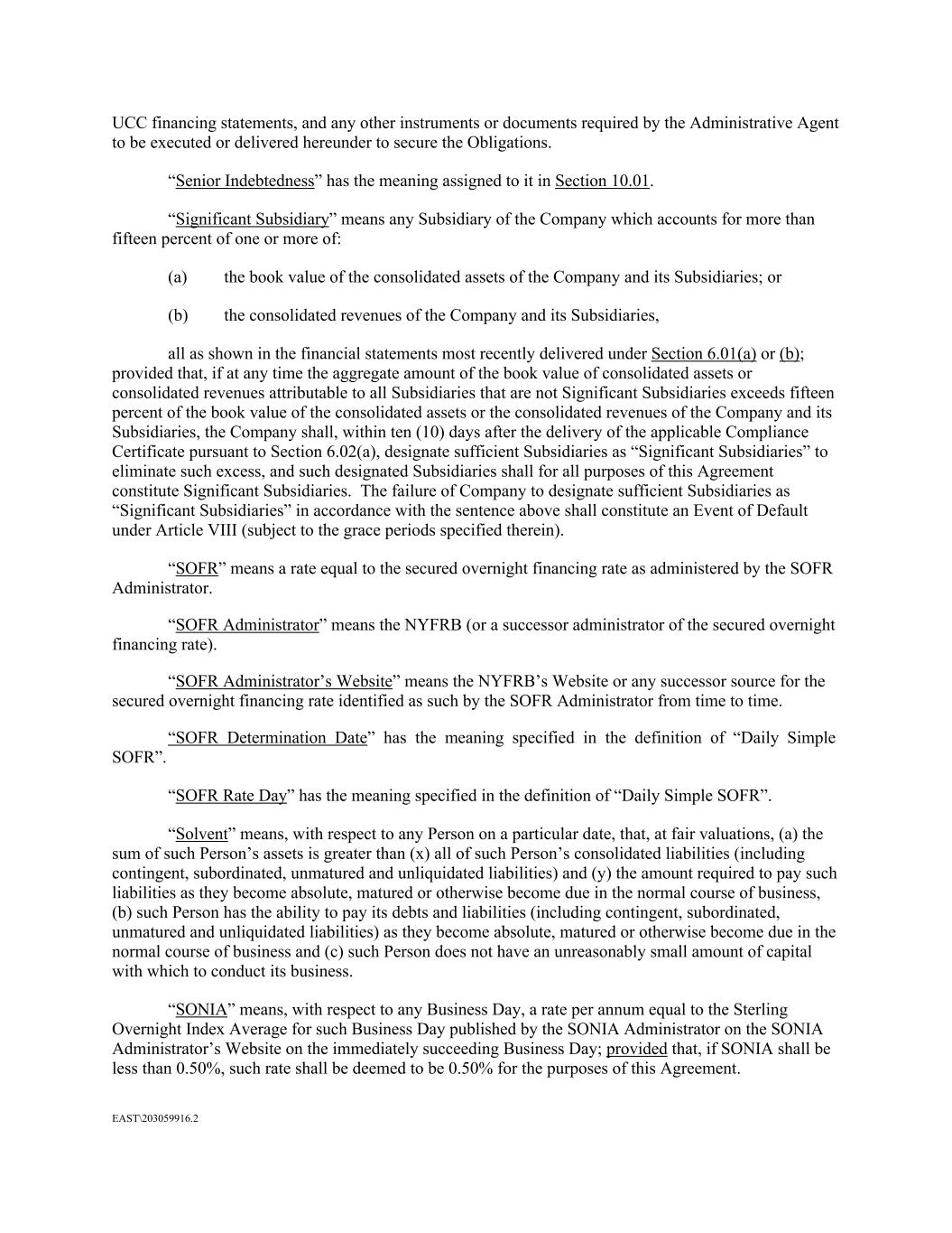 UCC financing statements, and any other instruments or documents required by the Administrative Agent to be executed or delivered hereunder to secure the Obligations. “Senior Indebtedness” has the meaning assigned to it in Section 10.01. “Significant Subsidiary” means any Subsidiary of the Company which accounts for more than fifteen percent of one or more of: (a) the book value of the consolidated assets of the Company and its Subsidiaries; or (b) the consolidated revenues of the Company and its Subsidiaries, all as shown in the financial statements most recently delivered under Section 6.01(a) or (b); provided that, if at any time the aggregate amount of the book value of consolidated assets or consolidated revenues attributable to all Subsidiaries that are not Significant Subsidiaries exceeds fifteen percent of the book value of the consolidated assets or the consolidated revenues of the Company and its Subsidiaries, the Company shall, within ten (10) days after the delivery of the applicable Compliance Certificate pursuant to Section 6.02(a), designate sufficient Subsidiaries as “Significant Subsidiaries” to eliminate such excess, and such designated Subsidiaries shall for all purposes of this Agreement constitute Significant Subsidiaries. The failure of Company to designate sufficient Subsidiaries as “Significant Subsidiaries” in accordance with the sentence above shall constitute an Event of Default under Article VIII (subject to the grace periods specified therein). “SOFR” means a rate equal to the secured overnight financing rate as administered by the SOFR Administrator. “SOFR Administrator” means the NYFRB (or a successor administrator of the secured overnight financing rate). “SOFR Administrator’s Website” means the NYFRB’s Website or any successor source for the secured overnight financing rate identified as such by the SOFR Administrator from time to time. “SOFR Determination Date” has the meaning specified in the definition of “Daily Simple SOFR”. “SOFR Rate Day” has the meaning specified in the definition of “Daily Simple SOFR”. “Solvent” means, with respect to any Person on a particular date, that, at fair valuations, (a) the sum of such Person’s assets is greater than (x) all of such Person’s consolidated liabilities (including contingent, subordinated, unmatured and unliquidated liabilities) and (y) the amount required to pay such liabilities as they become absolute, matured or otherwise become due in the normal course of business, (b) such Person has the ability to pay its debts and liabilities (including contingent, subordinated, unmatured and unliquidated liabilities) as they become absolute, matured or otherwise become due in the normal course of business and (c) such Person does not have an unreasonably small amount of capital with which to conduct its business. “SONIA” means, with respect to any Business Day, a rate per annum equal to the Sterling Overnight Index Average for such Business Day published by the SONIA Administrator on the SONIA Administrator’s Website on the immediately succeeding Business Day; provided that, if SONIA shall be less than 0.50%, such rate shall be deemed to be 0.50% for the purposes of this Agreement. EAST\203059916.2