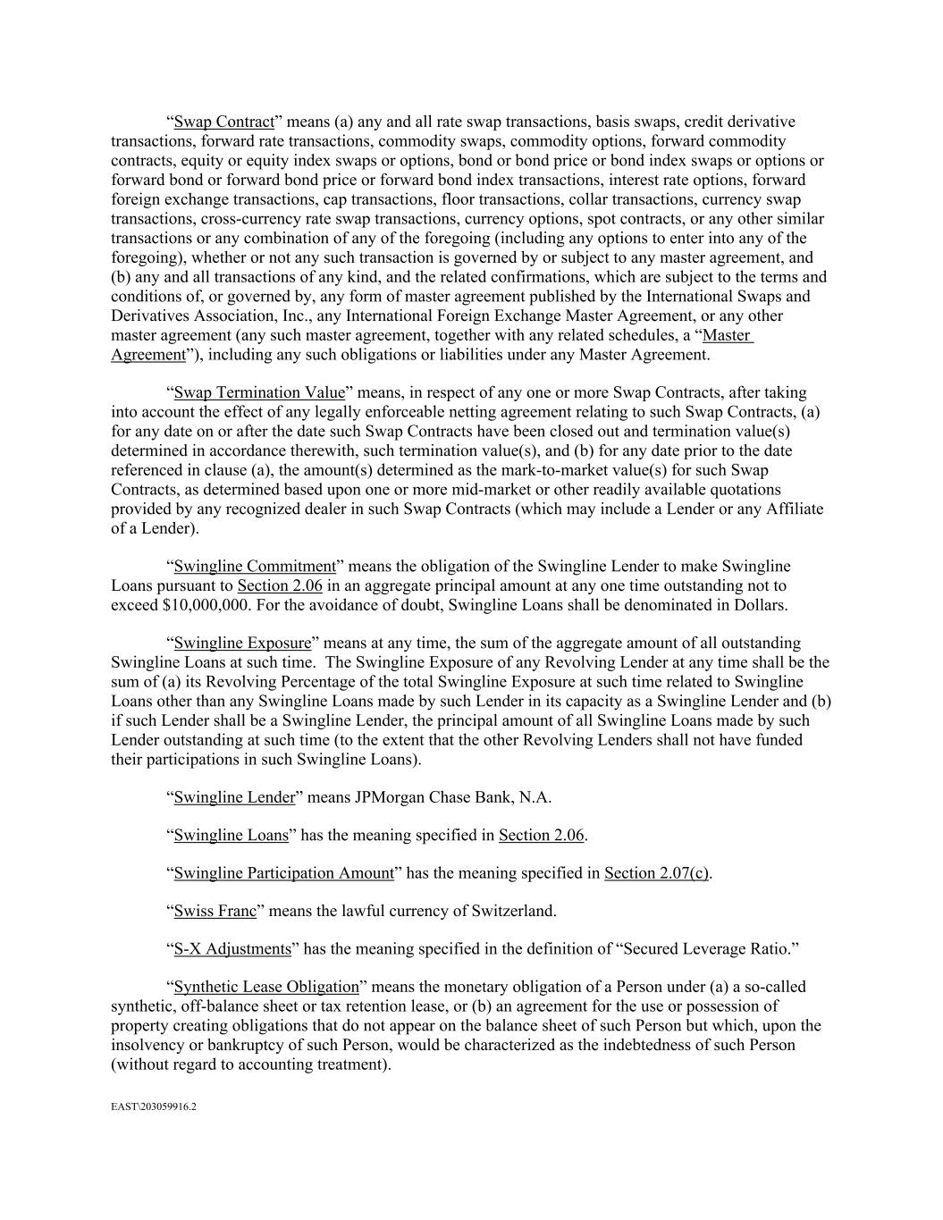 “Swap Contract” means (a) any and all rate swap transactions, basis swaps, credit derivative transactions, forward rate transactions, commodity swaps, commodity options, forward commodity contracts, equity or equity index swaps or options, bond or bond price or bond index swaps or options or forward bond or forward bond price or forward bond index transactions, interest rate options, forward foreign exchange transactions, cap transactions, floor transactions, collar transactions, currency swap transactions, cross-currency rate swap transactions, currency options, spot contracts, or any other similar transactions or any combination of any of the foregoing (including any options to enter into any of the foregoing), whether or not any such transaction is governed by or subject to any master agreement, and (b) any and all transactions of any kind, and the related confirmations, which are subject to the terms and conditions of, or governed by, any form of master agreement published by the International Swaps and Derivatives Association, Inc., any International Foreign Exchange Master Agreement, or any other master agreement (any such master agreement, together with any related schedules, a “Master Agreement”), including any such obligations or liabilities under any Master Agreement. “Swap Termination Value” means, in respect of any one or more Swap Contracts, after taking into account the effect of any legally enforceable netting agreement relating to such Swap Contracts, (a) for any date on or after the date such Swap Contracts have been closed out and termination value(s) determined in accordance therewith, such termination value(s), and (b) for any date prior to the date referenced in clause (a), the amount(s) determined as the mark-to-market value(s) for such Swap Contracts, as determined based upon one or more mid-market or other readily available quotations provided by any recognized dealer in such Swap Contracts (which may include a Lender or any Affiliate of a Lender). “Swingline Commitment” means the obligation of the Swingline Lender to make Swingline Loans pursuant to Section 2.06 in an aggregate principal amount at any one time outstanding not to exceed $10,000,000. For the avoidance of doubt, Swingline Loans shall be denominated in Dollars. “Swingline Exposure” means at any time, the sum of the aggregate amount of all outstanding Swingline Loans at such time. The Swingline Exposure of any Revolving Lender at any time shall be the sum of (a) its Revolving Percentage of the total Swingline Exposure at such time related to Swingline Loans other than any Swingline Loans made by such Lender in its capacity as a Swingline Lender and (b) if such Lender shall be a Swingline Lender, the principal amount of all Swingline Loans made by such Lender outstanding at such time (to the extent that the other Revolving Lenders shall not have funded their participations in such Swingline Loans). “Swingline Lender” means JPMorgan Chase Bank, N.A. “Swingline Loans” has the meaning specified in Section 2.06. “Swingline Participation Amount” has the meaning specified in Section 2.07(c). “Swiss Franc” means the lawful currency of Switzerland. “S-X Adjustments” has the meaning specified in the definition of “Secured Leverage Ratio.” “Synthetic Lease Obligation” means the monetary obligation of a Person under (a) a so-called synthetic, off-balance sheet or tax retention lease, or (b) an agreement for the use or possession of property creating obligations that do not appear on the balance sheet of such Person but which, upon the insolvency or bankruptcy of such Person, would be characterized as the indebtedness of such Person (without regard to accounting treatment). EAST\203059916.2