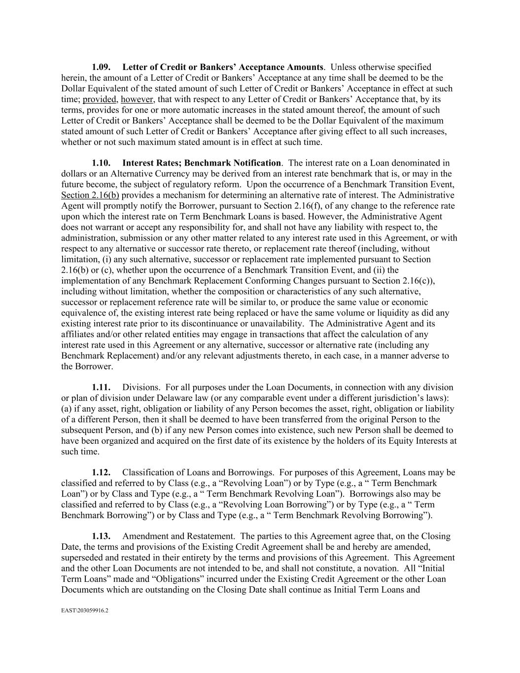1.09. Letter of Credit or Bankers’ Acceptance Amounts. Unless otherwise specified herein, the amount of a Letter of Credit or Bankers’ Acceptance at any time shall be deemed to be the Dollar Equivalent of the stated amount of such Letter of Credit or Bankers’ Acceptance in effect at such time; provided, however, that with respect to any Letter of Credit or Bankers’ Acceptance that, by its terms, provides for one or more automatic increases in the stated amount thereof, the amount of such Letter of Credit or Bankers’ Acceptance shall be deemed to be the Dollar Equivalent of the maximum stated amount of such Letter of Credit or Bankers’ Acceptance after giving effect to all such increases, whether or not such maximum stated amount is in effect at such time. 1.10. Interest Rates; Benchmark Notification. The interest rate on a Loan denominated in dollars or an Alternative Currency may be derived from an interest rate benchmark that is, or may in the future become, the subject of regulatory reform. Upon the occurrence of a Benchmark Transition Event, Section 2.16(b) provides a mechanism for determining an alternative rate of interest. The Administrative Agent will promptly notify the Borrower, pursuant to Section 2.16(f), of any change to the reference rate upon which the interest rate on Term Benchmark Loans is based. However, the Administrative Agent does not warrant or accept any responsibility for, and shall not have any liability with respect to, the administration, submission or any other matter related to any interest rate used in this Agreement, or with respect to any alternative or successor rate thereto, or replacement rate thereof (including, without limitation, (i) any such alternative, successor or replacement rate implemented pursuant to Section 2.16(b) or (c), whether upon the occurrence of a Benchmark Transition Event, and (ii) the implementation of any Benchmark Replacement Conforming Changes pursuant to Section 2.16(c)), including without limitation, whether the composition or characteristics of any such alternative, successor or replacement reference rate will be similar to, or produce the same value or economic equivalence of, the existing interest rate being replaced or have the same volume or liquidity as did any existing interest rate prior to its discontinuance or unavailability. The Administrative Agent and its affiliates and/or other related entities may engage in transactions that affect the calculation of any interest rate used in this Agreement or any alternative, successor or alternative rate (including any Benchmark Replacement) and/or any relevant adjustments thereto, in each case, in a manner adverse to the Borrower. 1.11. Divisions. For all purposes under the Loan Documents, in connection with any division or plan of division under Delaware law (or any comparable event under a different jurisdiction’s laws): (a) if any asset, right, obligation or liability of any Person becomes the asset, right, obligation or liability of a different Person, then it shall be deemed to have been transferred from the original Person to the subsequent Person, and (b) if any new Person comes into existence, such new Person shall be deemed to have been organized and acquired on the first date of its existence by the holders of its Equity Interests at such time. 1.12. Classification of Loans and Borrowings. For purposes of this Agreement, Loans may be classified and referred to by Class (e.g., a “Revolving Loan”) or by Type (e.g., a “ Term Benchmark Loan”) or by Class and Type (e.g., a “ Term Benchmark Revolving Loan”). Borrowings also may be classified and referred to by Class (e.g., a “Revolving Loan Borrowing”) or by Type (e.g., a “ Term Benchmark Borrowing”) or by Class and Type (e.g., a “ Term Benchmark Revolving Borrowing”). 1.13. Amendment and Restatement. The parties to this Agreement agree that, on the Closing Date, the terms and provisions of the Existing Credit Agreement shall be and hereby are amended, superseded and restated in their entirety by the terms and provisions of this Agreement. This Agreement and the other Loan Documents are not intended to be, and shall not constitute, a novation. All “Initial Term Loans” made and “Obligations” incurred under the Existing Credit Agreement or the other Loan Documents which are outstanding on the Closing Date shall continue as Initial Term Loans and EAST\203059916.2