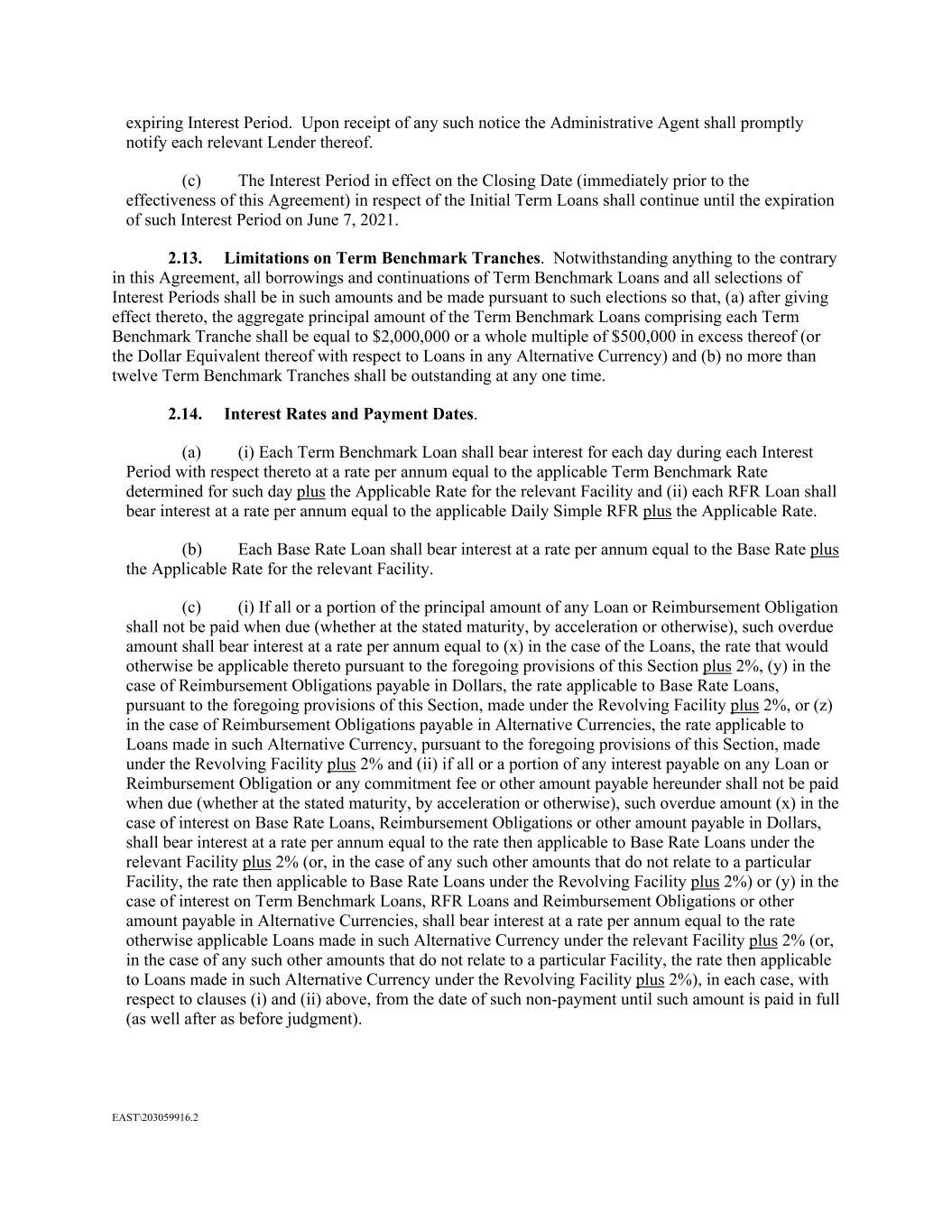 expiring Interest Period. Upon receipt of any such notice the Administrative Agent shall promptly notify each relevant Lender thereof. (c) The Interest Period in effect on the Closing Date (immediately prior to the effectiveness of this Agreement) in respect of the Initial Term Loans shall continue until the expiration of such Interest Period on June 7, 2021. 2.13. Limitations on Term Benchmark Tranches. Notwithstanding anything to the contrary in this Agreement, all borrowings and continuations of Term Benchmark Loans and all selections of Interest Periods shall be in such amounts and be made pursuant to such elections so that, (a) after giving effect thereto, the aggregate principal amount of the Term Benchmark Loans comprising each Term Benchmark Tranche shall be equal to $2,000,000 or a whole multiple of $500,000 in excess thereof (or the Dollar Equivalent thereof with respect to Loans in any Alternative Currency) and (b) no more than twelve Term Benchmark Tranches shall be outstanding at any one time. 2.14. Interest Rates and Payment Dates. (a) (i) Each Term Benchmark Loan shall bear interest for each day during each Interest Period with respect thereto at a rate per annum equal to the applicable Term Benchmark Rate determined for such day plus the Applicable Rate for the relevant Facility and (ii) each RFR Loan shall bear interest at a rate per annum equal to the applicable Daily Simple RFR plus the Applicable Rate. (b) Each Base Rate Loan shall bear interest at a rate per annum equal to the Base Rate plus the Applicable Rate for the relevant Facility. (c) (i) If all or a portion of the principal amount of any Loan or Reimbursement Obligation shall not be paid when due (whether at the stated maturity, by acceleration or otherwise), such overdue amount shall bear interest at a rate per annum equal to (x) in the case of the Loans, the rate that would otherwise be applicable thereto pursuant to the foregoing provisions of this Section plus 2%, (y) in the case of Reimbursement Obligations payable in Dollars, the rate applicable to Base Rate Loans, pursuant to the foregoing provisions of this Section, made under the Revolving Facility plus 2%, or (z) in the case of Reimbursement Obligations payable in Alternative Currencies, the rate applicable to Loans made in such Alternative Currency, pursuant to the foregoing provisions of this Section, made under the Revolving Facility plus 2% and (ii) if all or a portion of any interest payable on any Loan or Reimbursement Obligation or any commitment fee or other amount payable hereunder shall not be paid when due (whether at the stated maturity, by acceleration or otherwise), such overdue amount (x) in the case of interest on Base Rate Loans, Reimbursement Obligations or other amount payable in Dollars, shall bear interest at a rate per annum equal to the rate then applicable to Base Rate Loans under the relevant Facility plus 2% (or, in the case of any such other amounts that do not relate to a particular Facility, the rate then applicable to Base Rate Loans under the Revolving Facility plus 2%) or (y) in the case of interest on Term Benchmark Loans, RFR Loans and Reimbursement Obligations or other amount payable in Alternative Currencies, shall bear interest at a rate per annum equal to the rate otherwise applicable Loans made in such Alternative Currency under the relevant Facility plus 2% (or, in the case of any such other amounts that do not relate to a particular Facility, the rate then applicable to Loans made in such Alternative Currency under the Revolving Facility plus 2%), in each case, with respect to clauses (i) and (ii) above, from the date of such non-payment until such amount is paid in full (as well after as before judgment). EAST\203059916.2